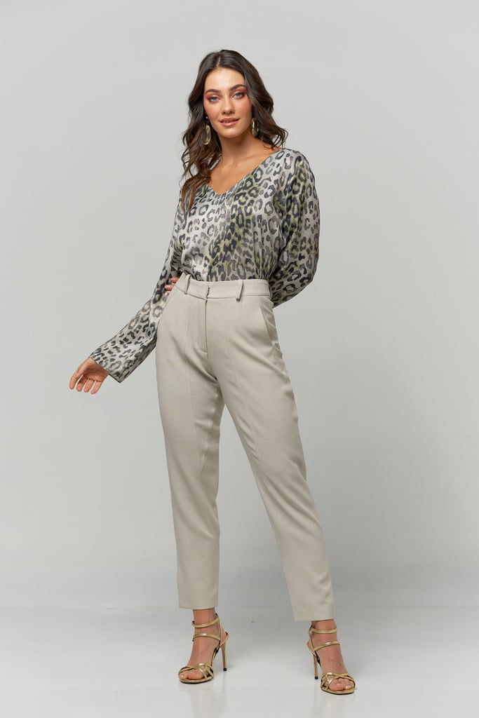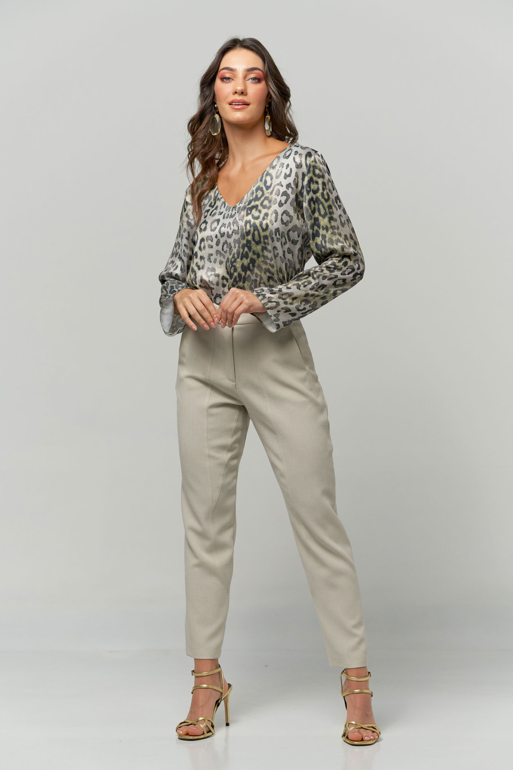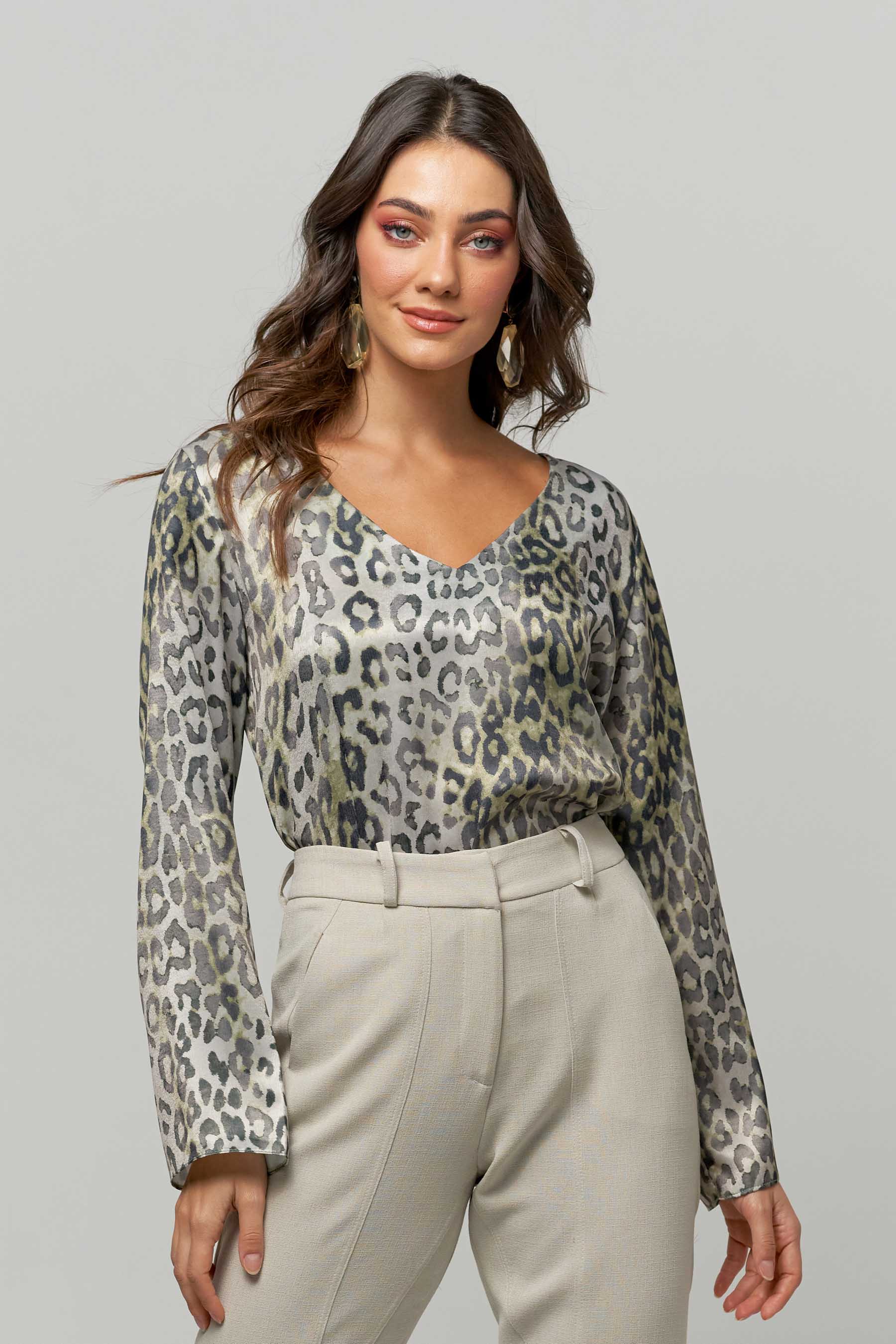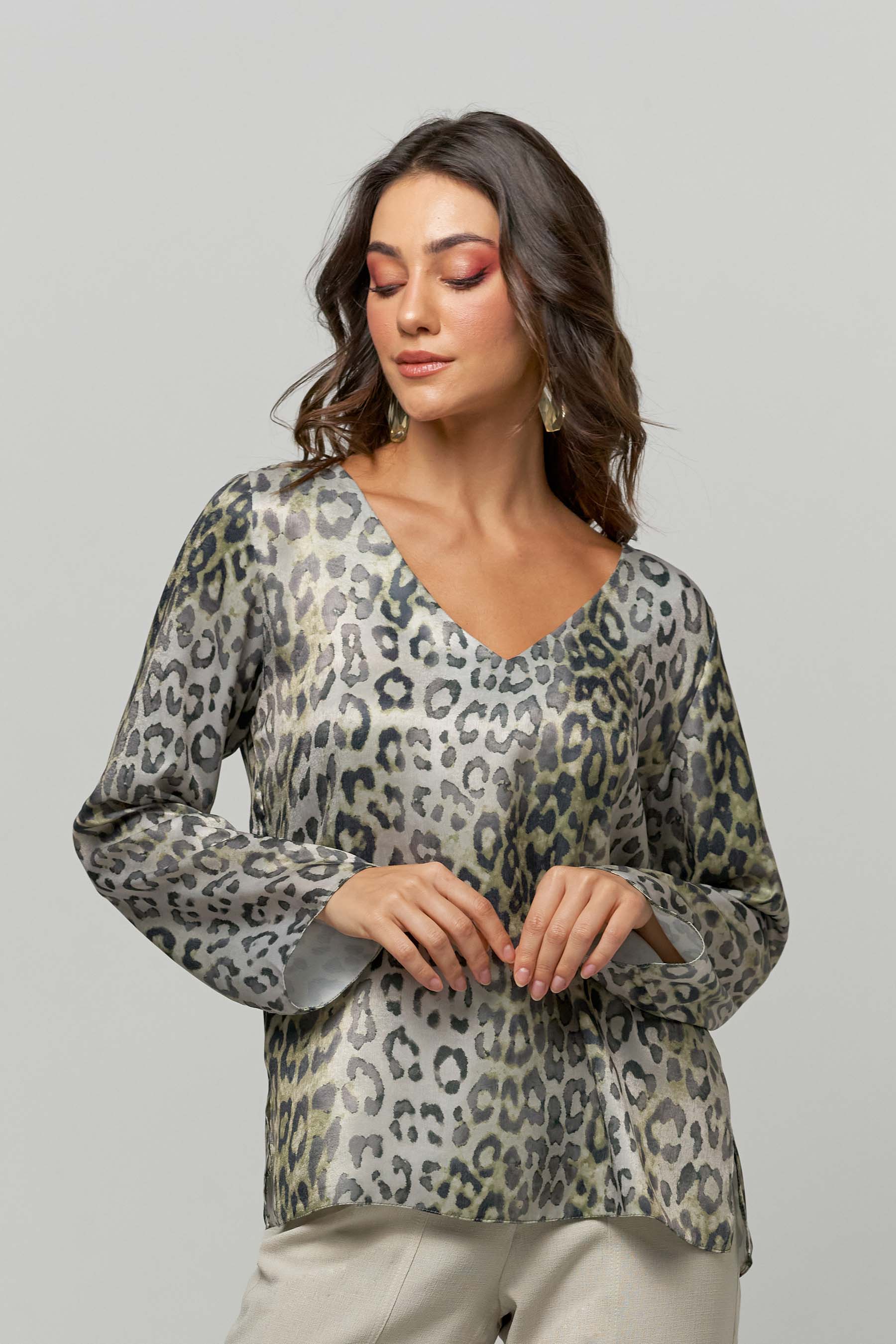 Blusa de satin, estampa de animal print, decote V e manga longa