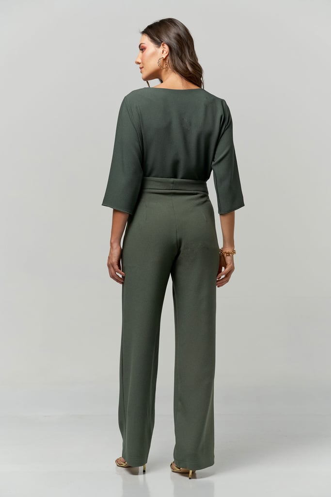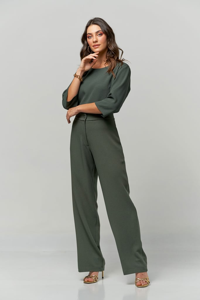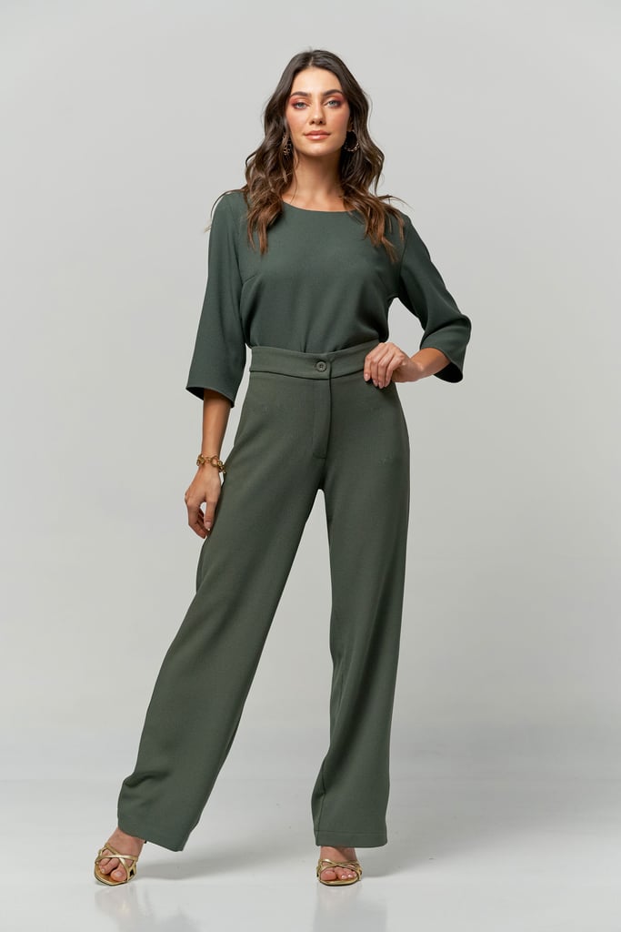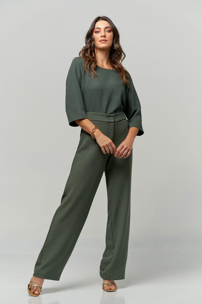 Conjunto de crepe. Blusa com decote redondo e manga 3/4. Calça reta de cintura alta com fechamento por zíper e botão.