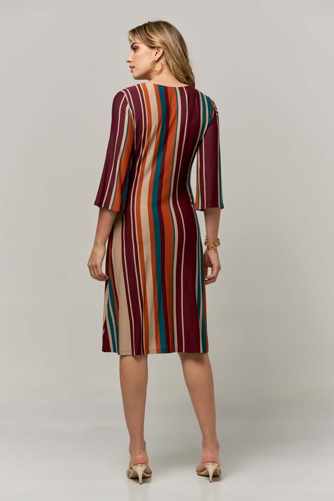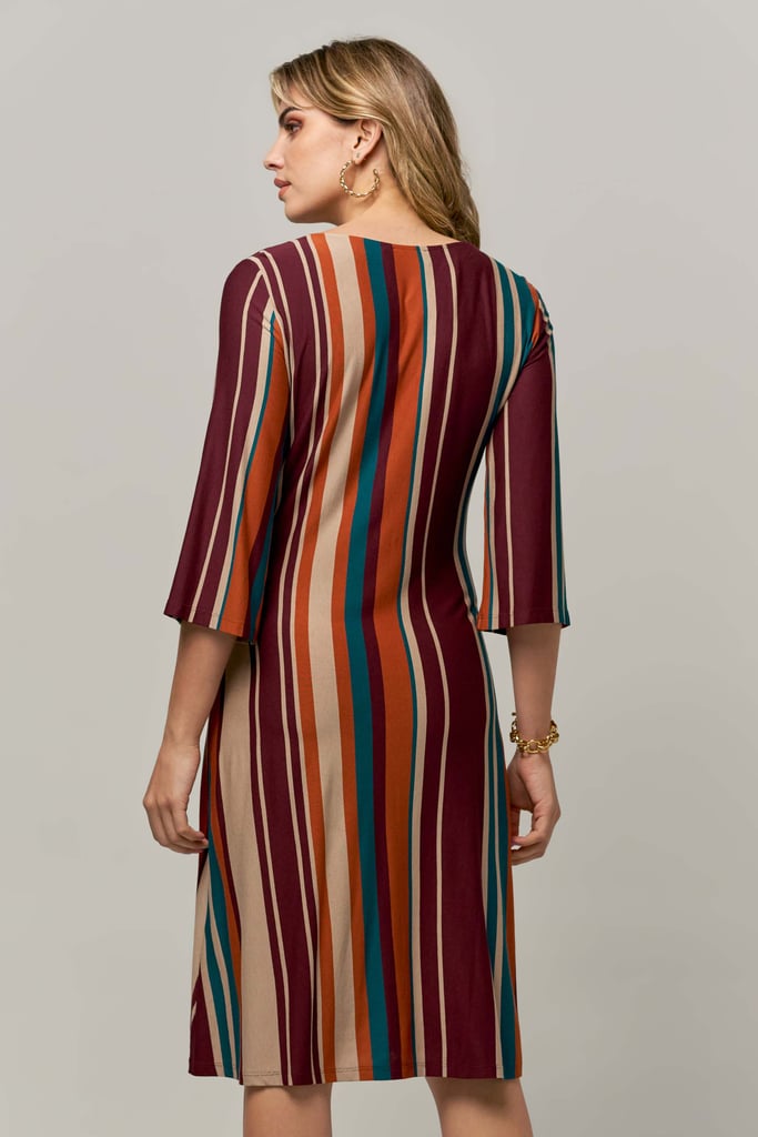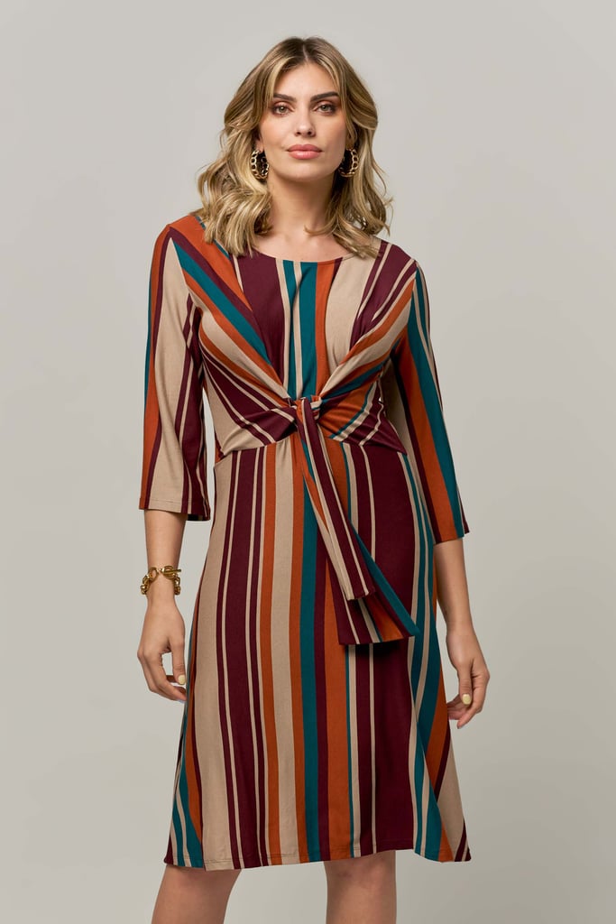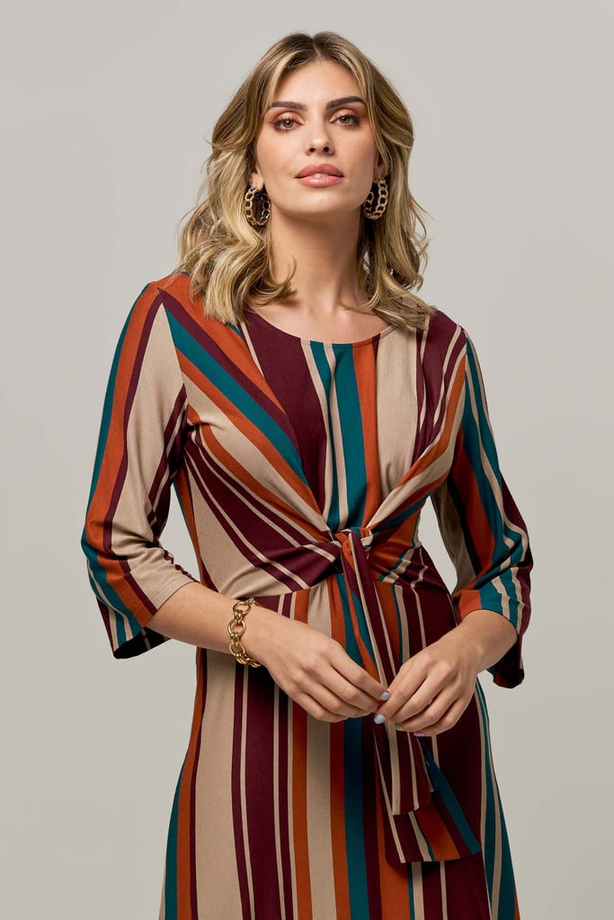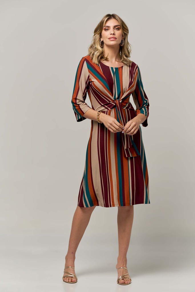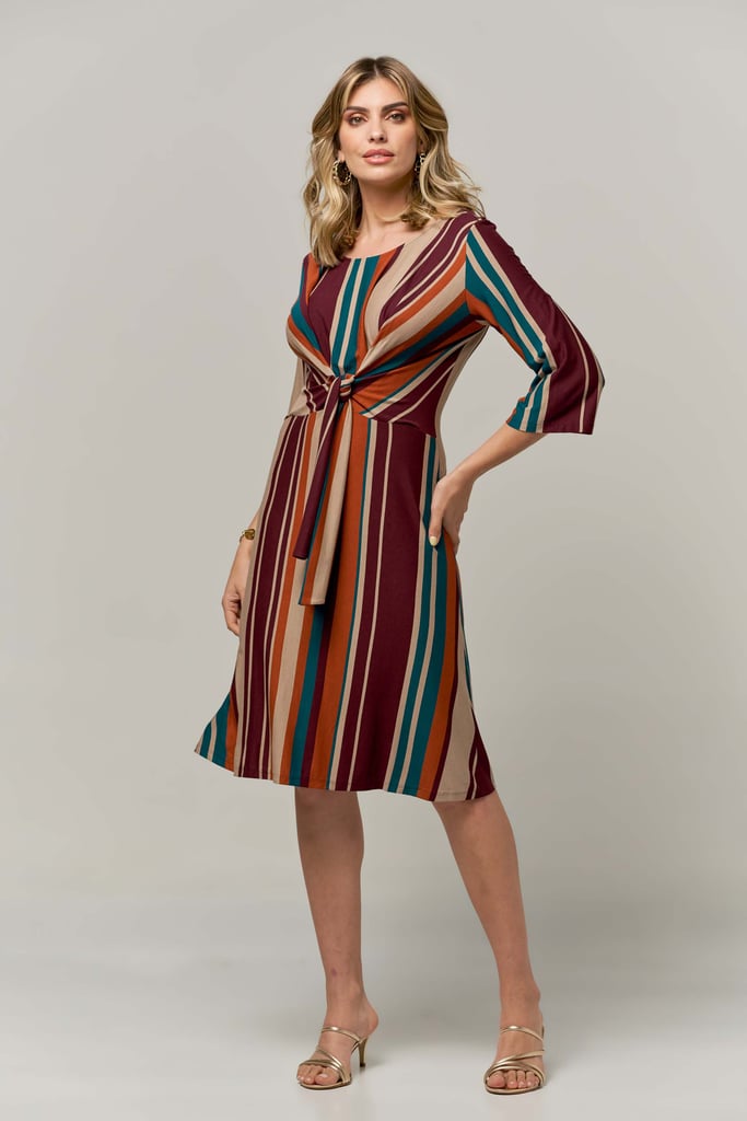 Vestido de malha listrado, decote redondo, manga 3/4, saia rodada, comprimento midi e detalhe frontal de faixa para amarração