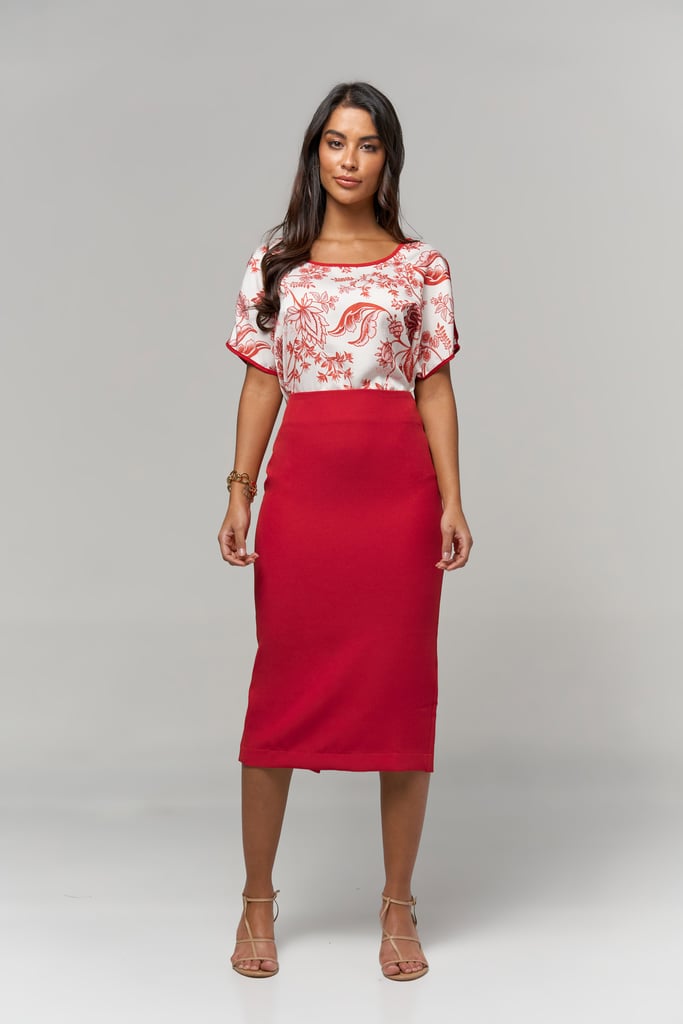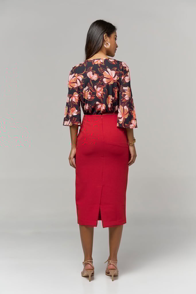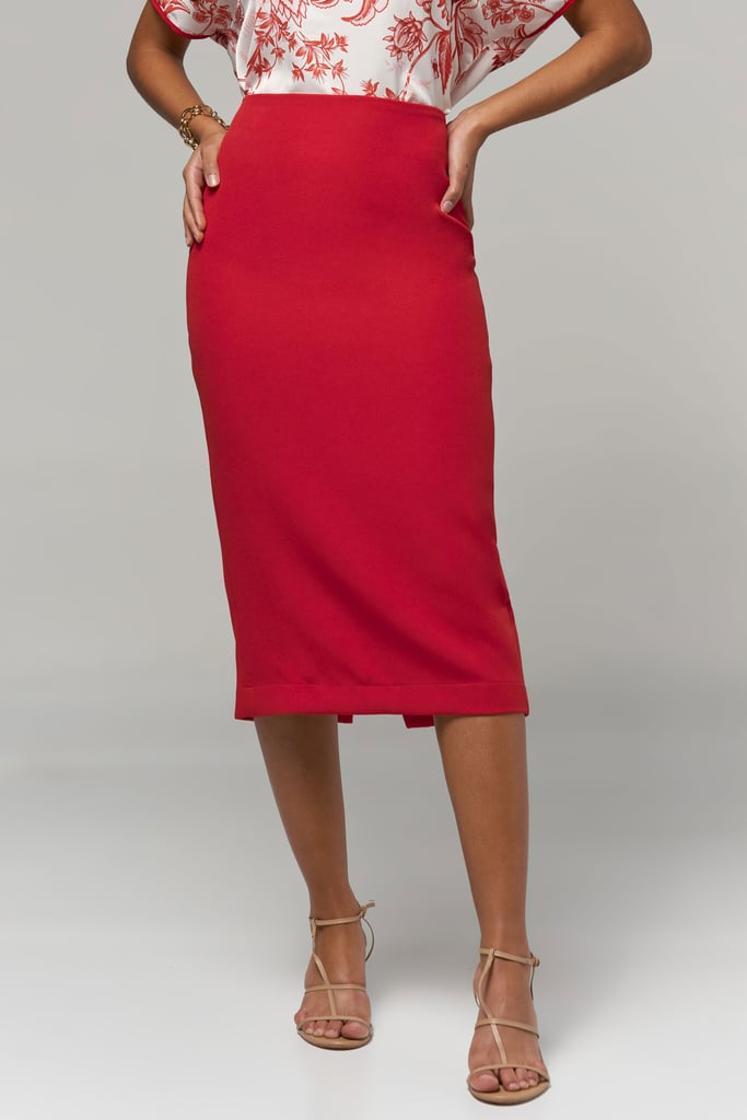 Saia lápis em tecido de crepe encorpado, comprimento midi, fenda e zíper para fechamento nas costas.