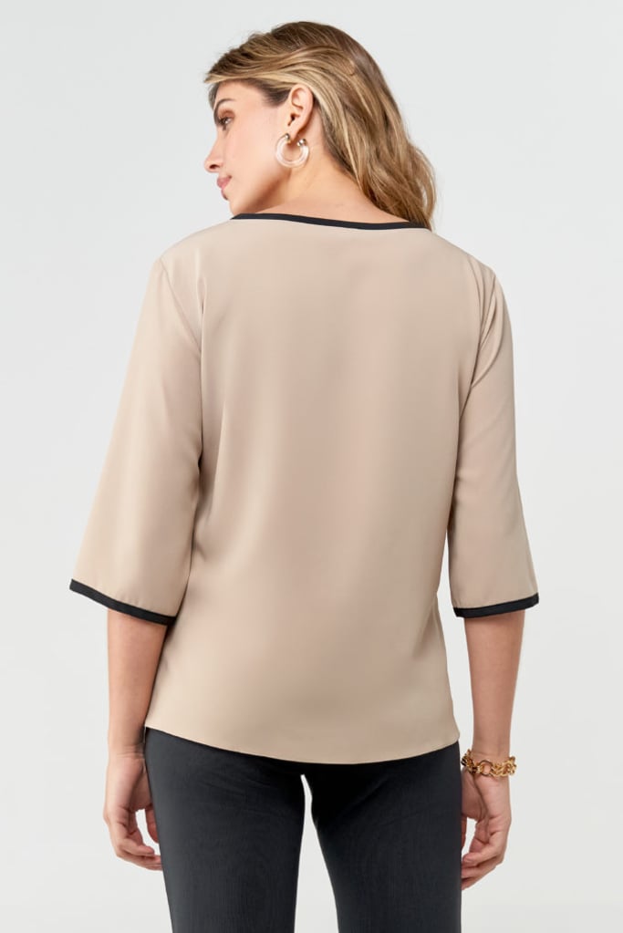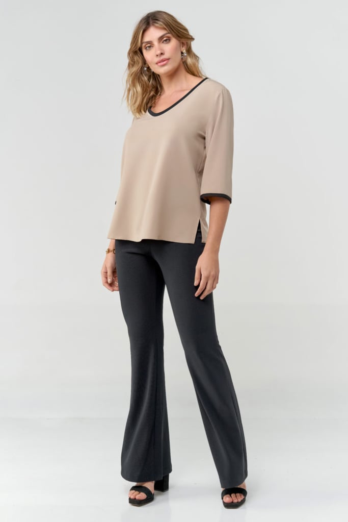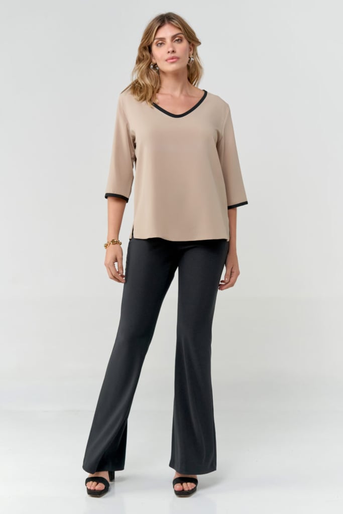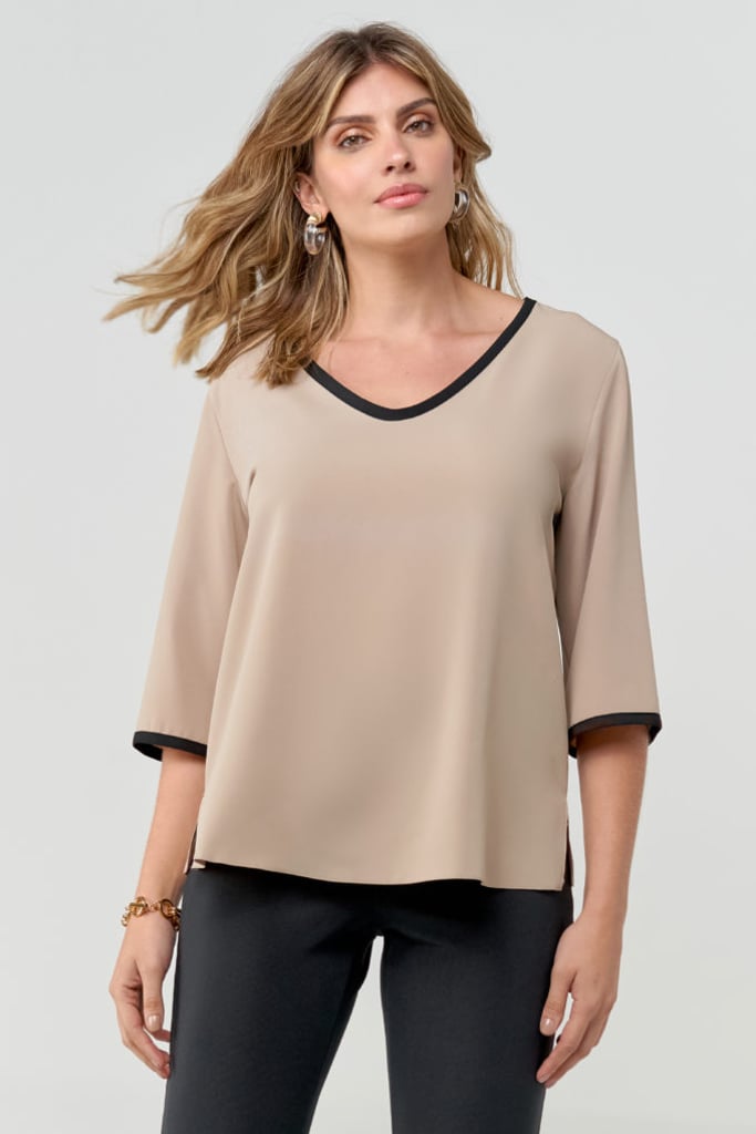 Blusa de crepe, decote V, manga ampla 3/4, abertura lateral e detalhe de aplicações de vivo