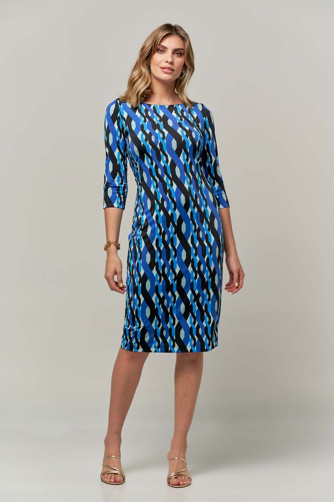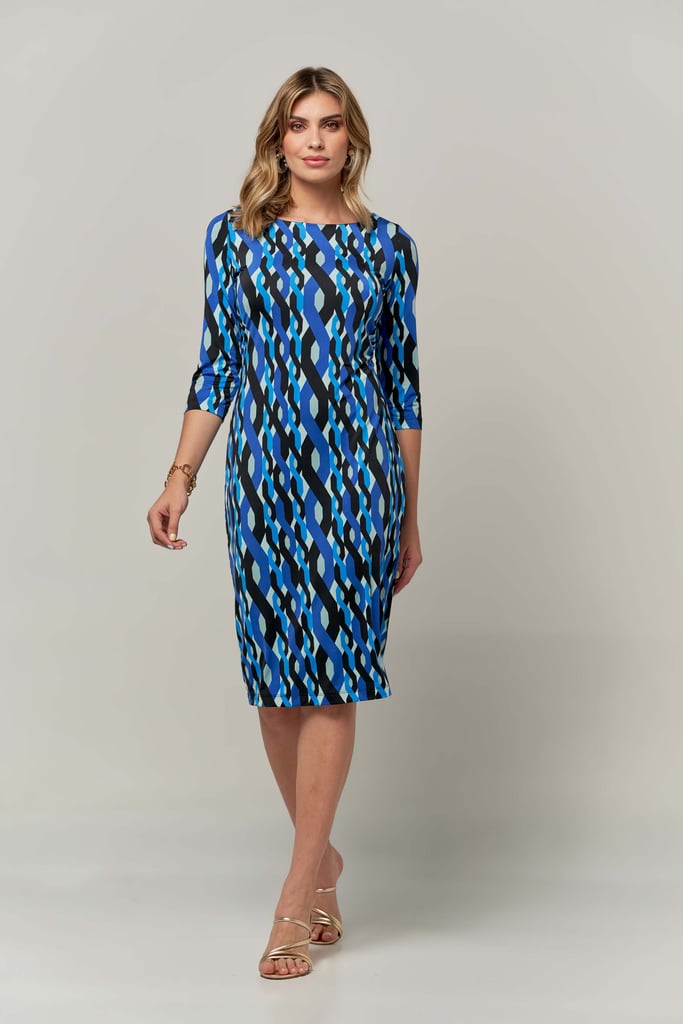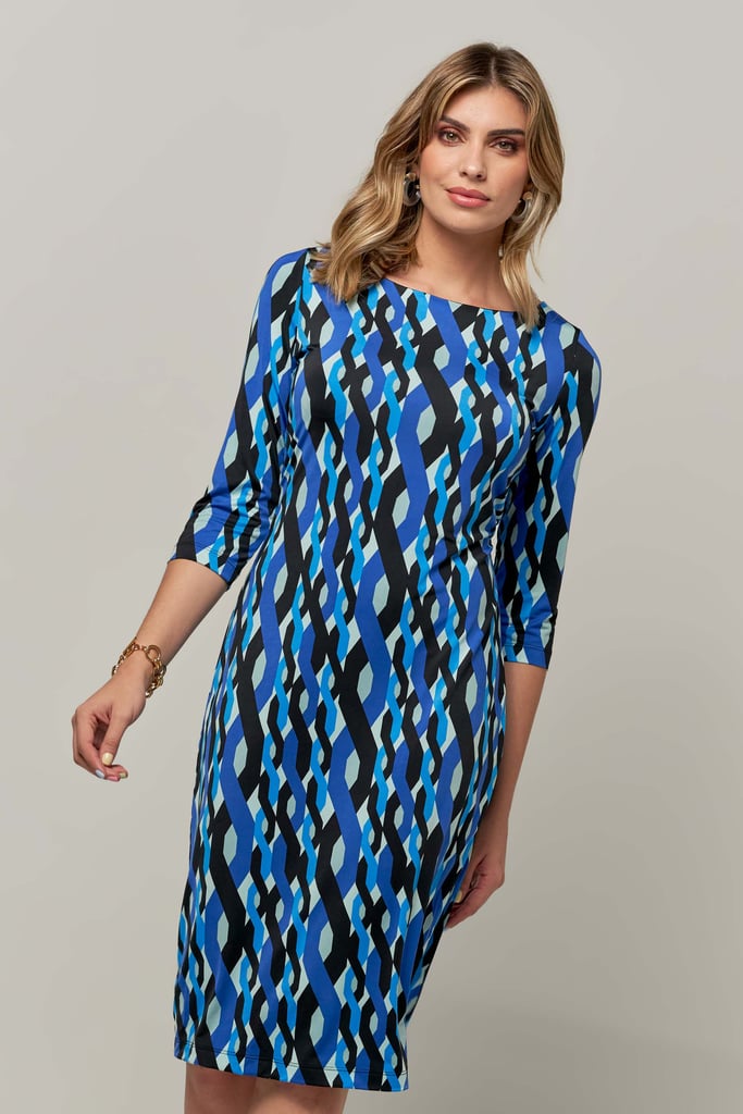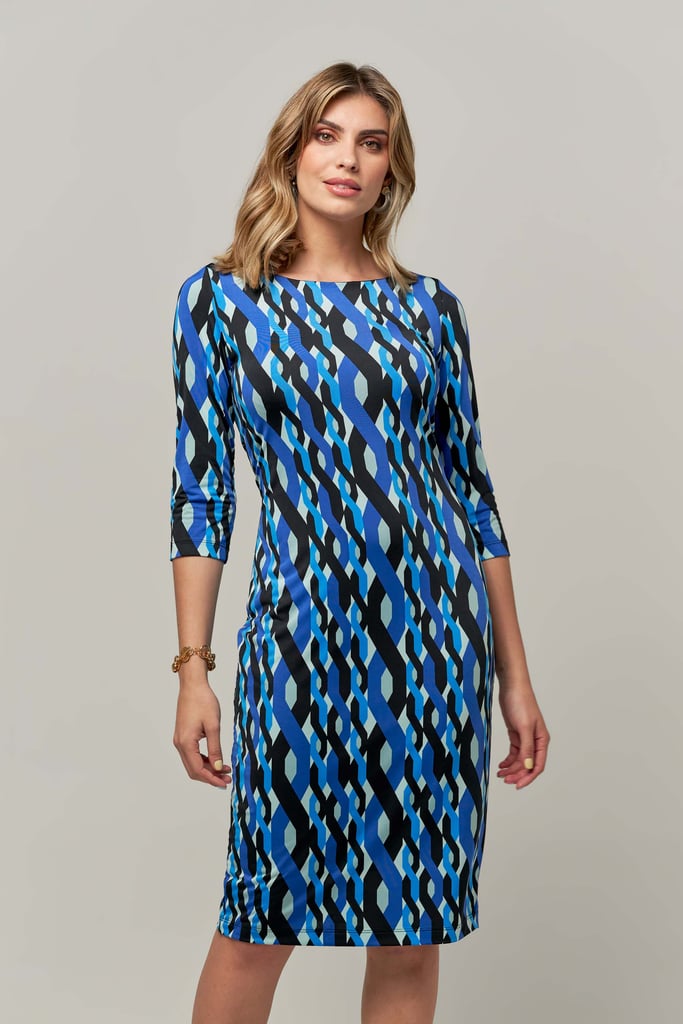 Vestido estampado em malha fria, decote redondo, comprimento midi e manga 3/4. Peça forrada