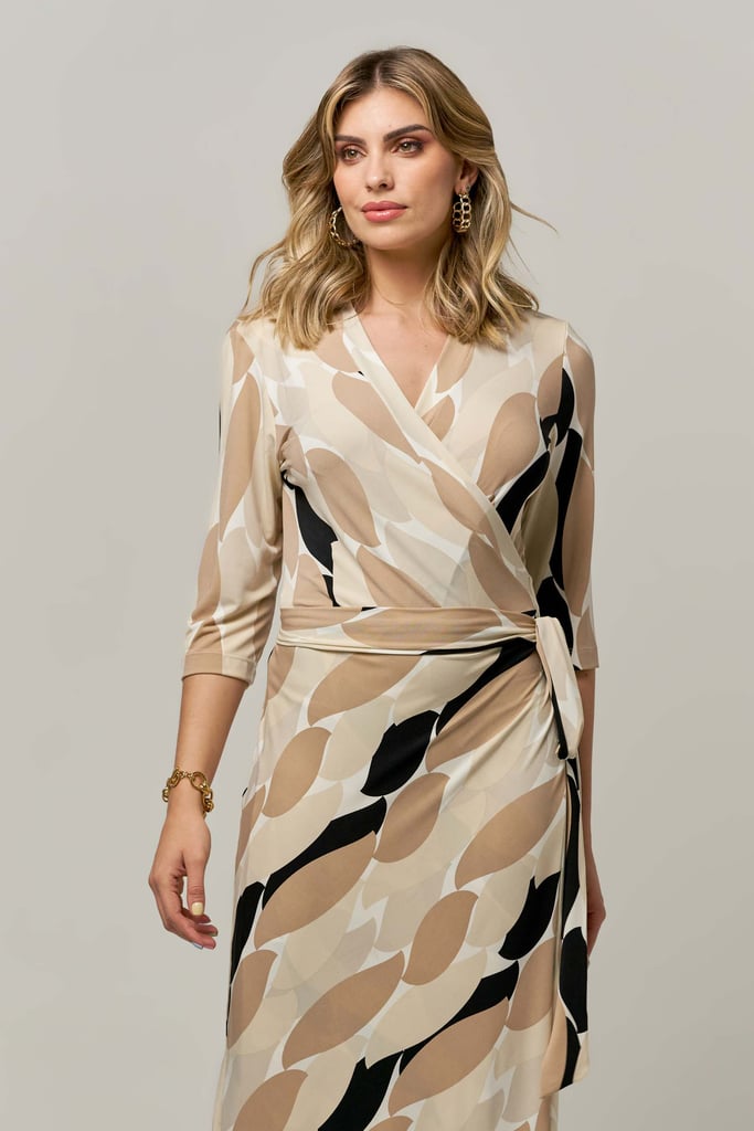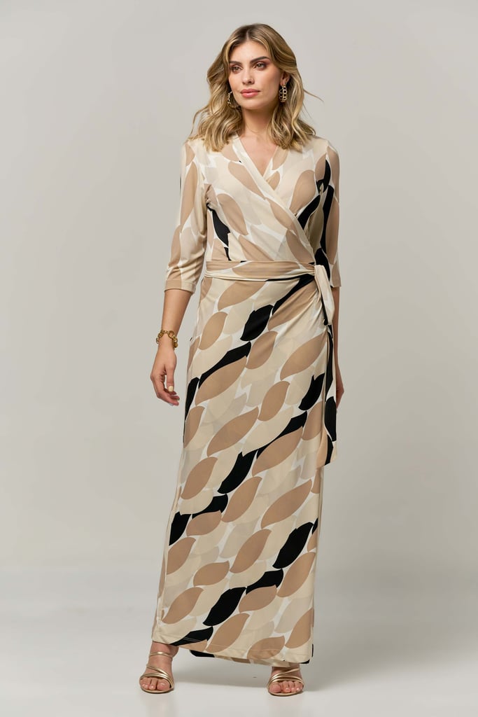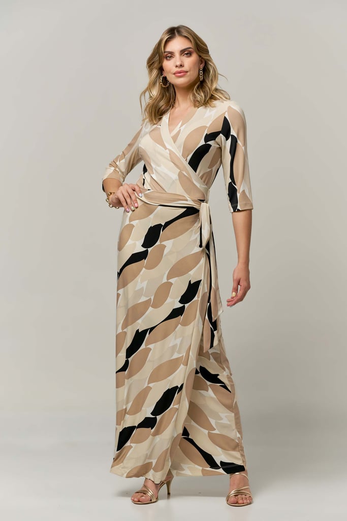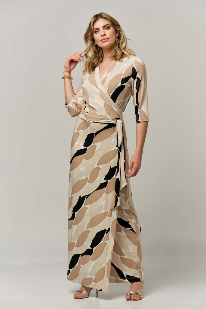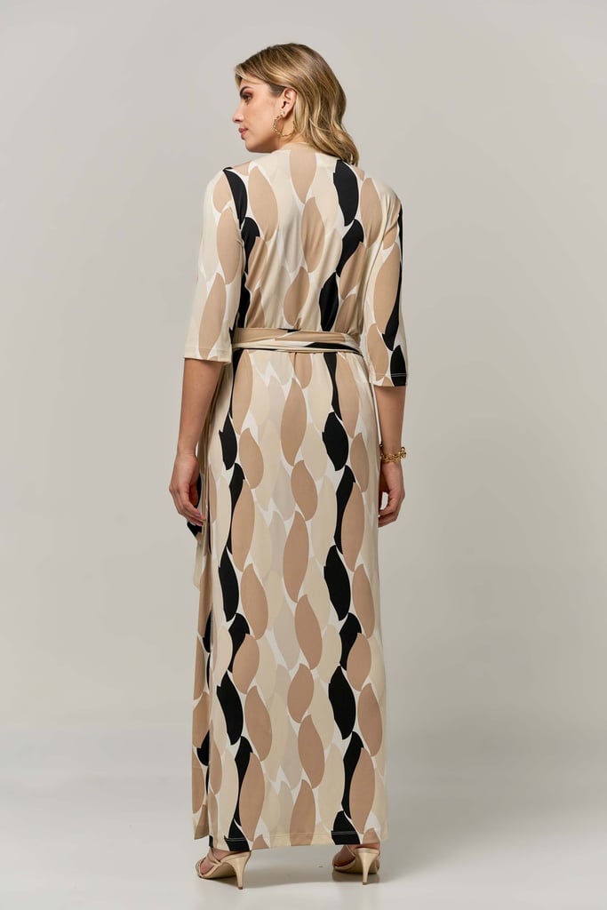 Vestido longo estampado em malha creponada, decote transpassado e manga 3/4.