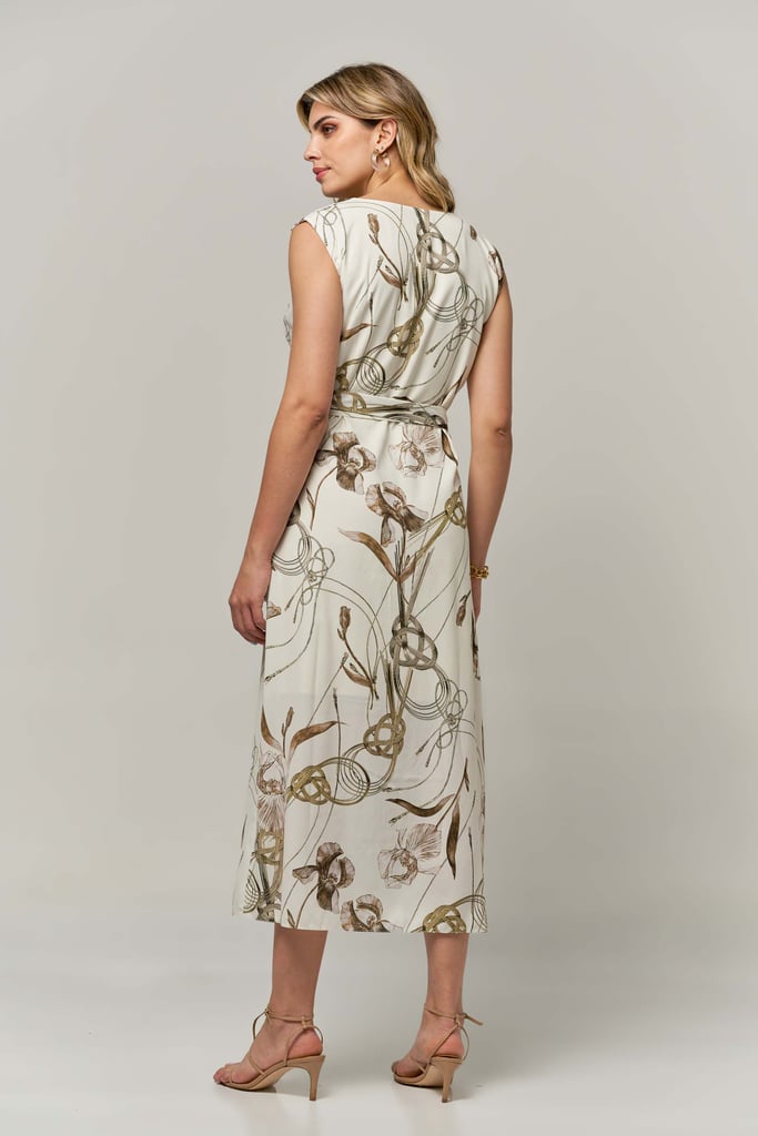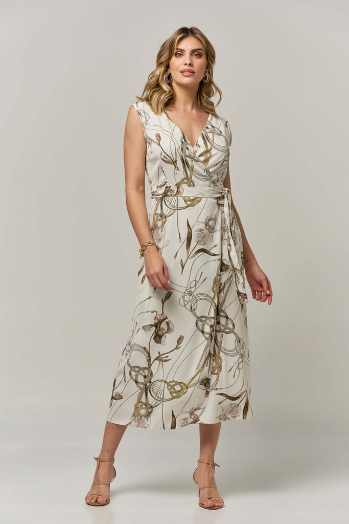 Vestido de crepe transpassado com faixa para amarração, padronagem floral, decote V, comprimento midi e sem manga.