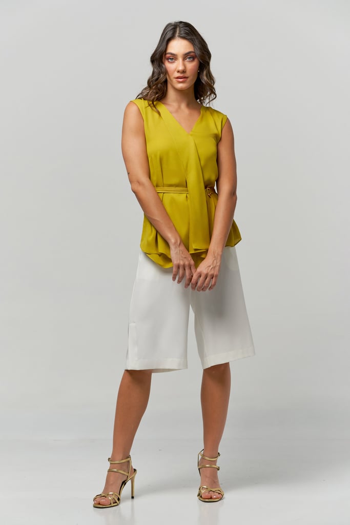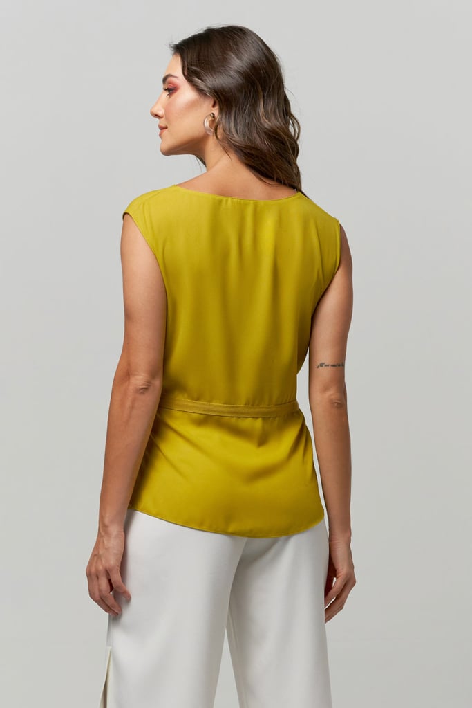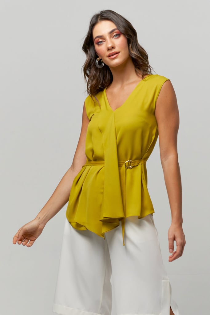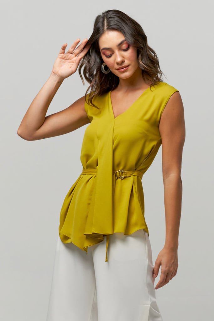 Regata de crepe, decote V, detalhe de babado e cinto-faixa com fivela