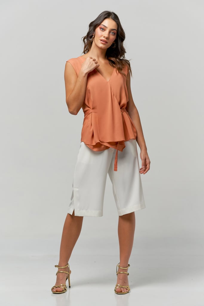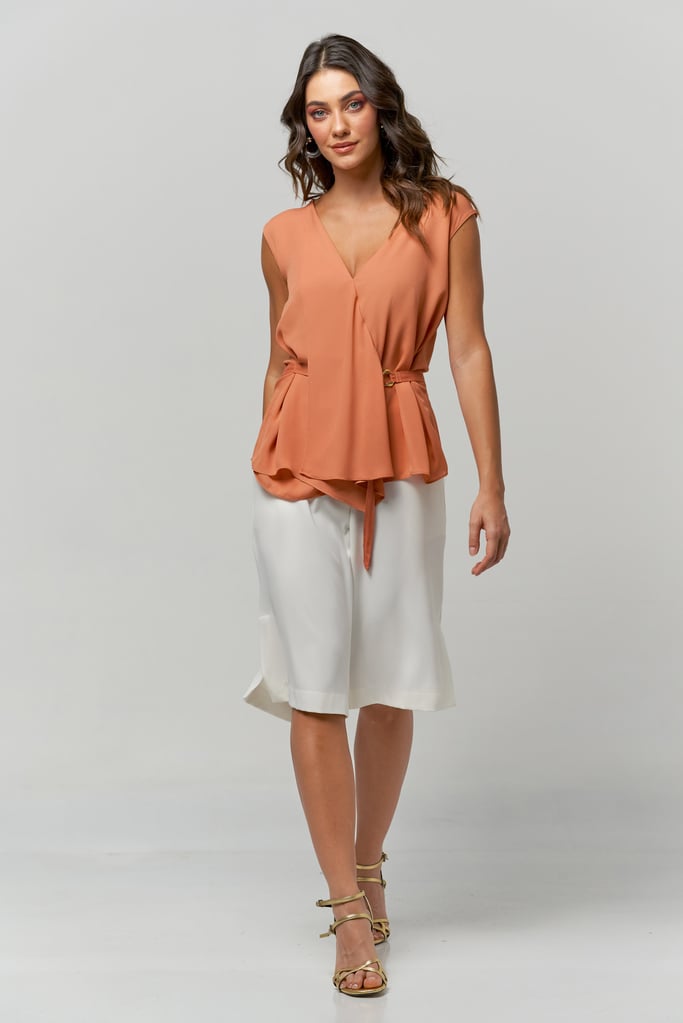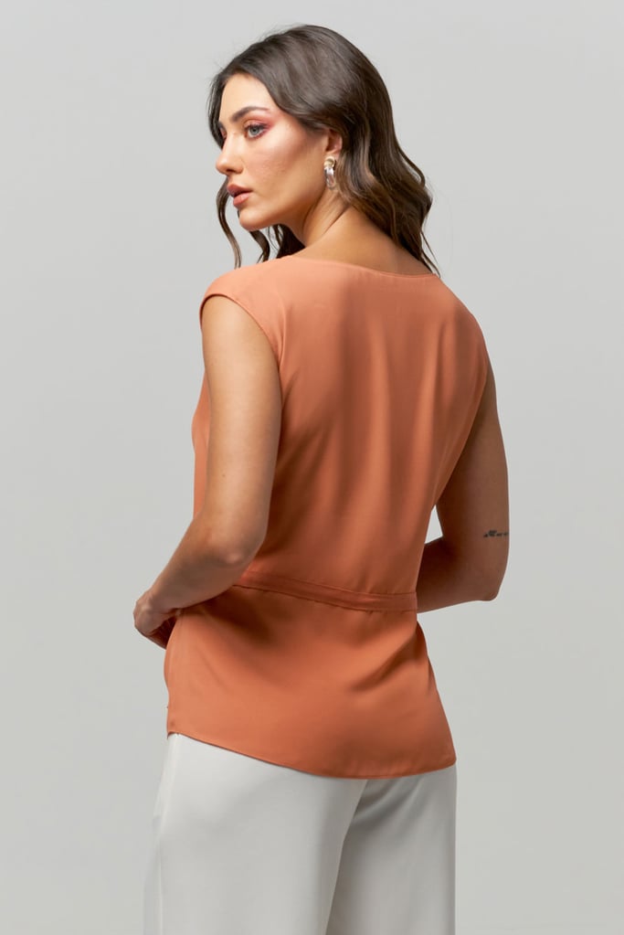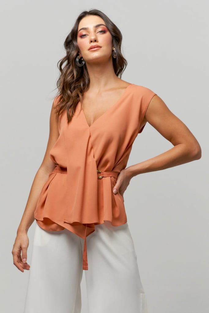 Regata de crepe, decote V, detalhe de babado e cinto-faixa com fivela