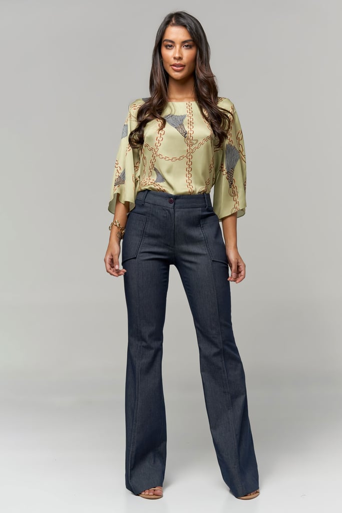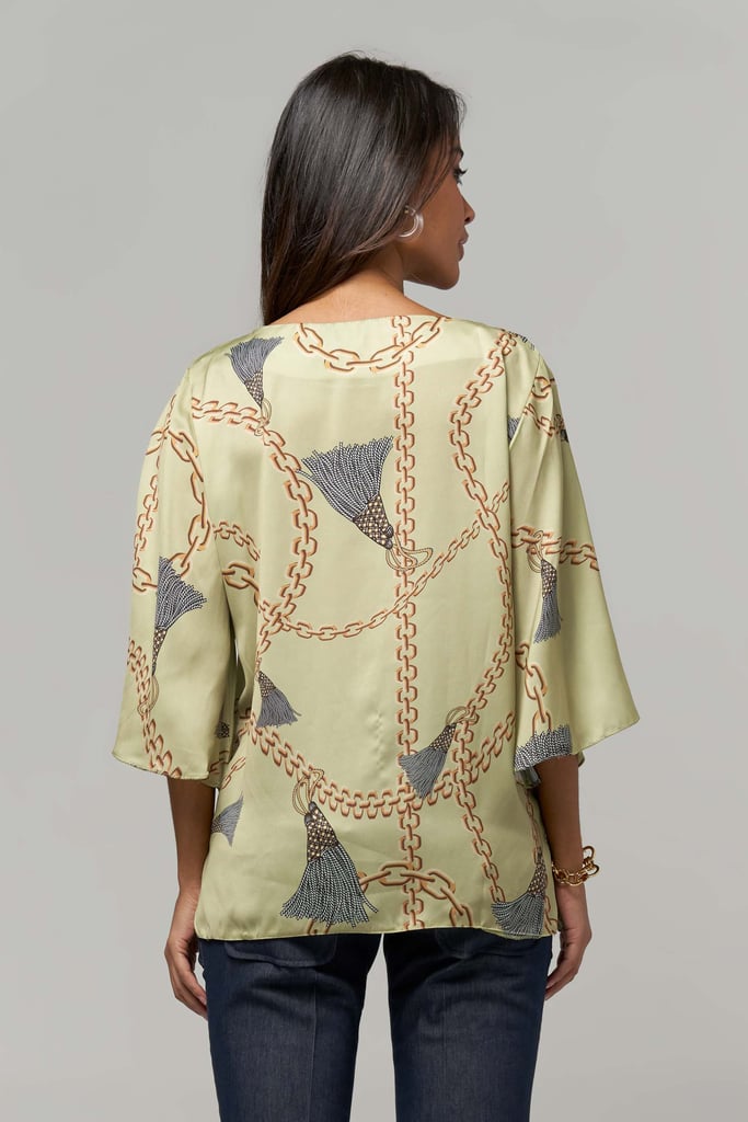 Blusa de satin estampada, decote redondo e manga 3/4 tipo sino
