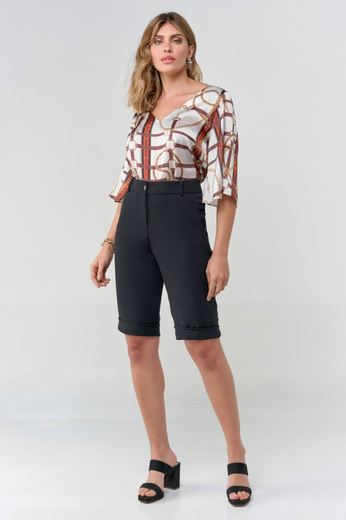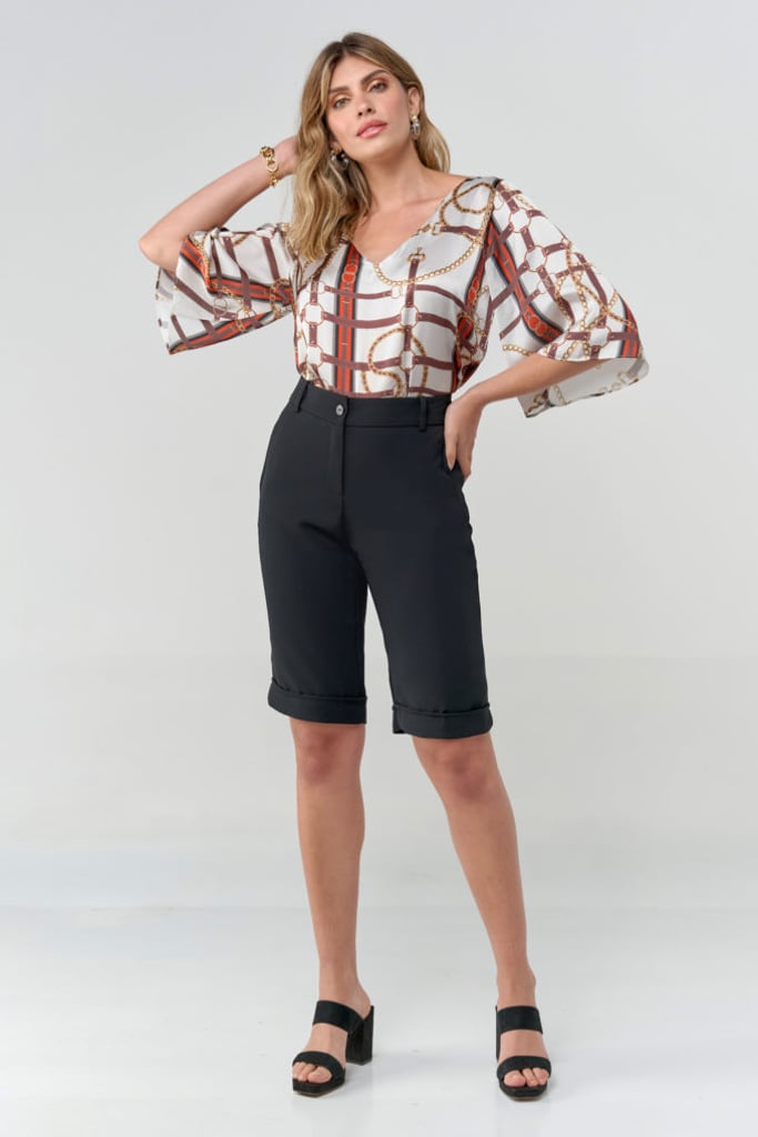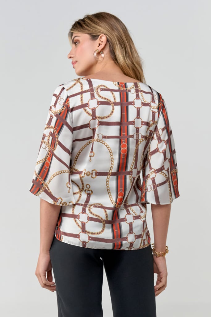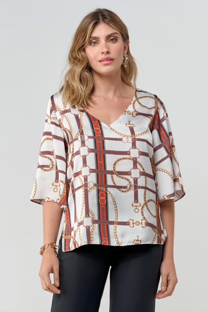 Blusa de satin toque de seda, padronagem de correntes, decote V e manga 3/4 tipo sino