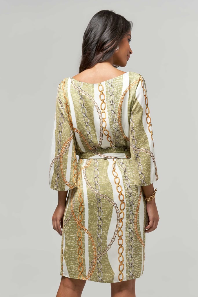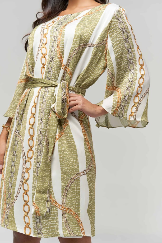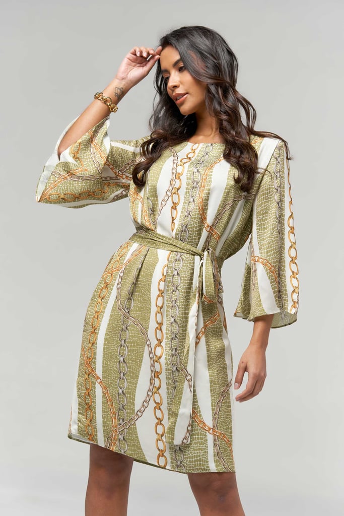 Vestido estampado em satin toque de seda, decote redondo, comprimento curto e manga tipo sino 3/4. Peça forrada. Acompanha cinto-faixa para amarração.