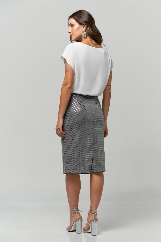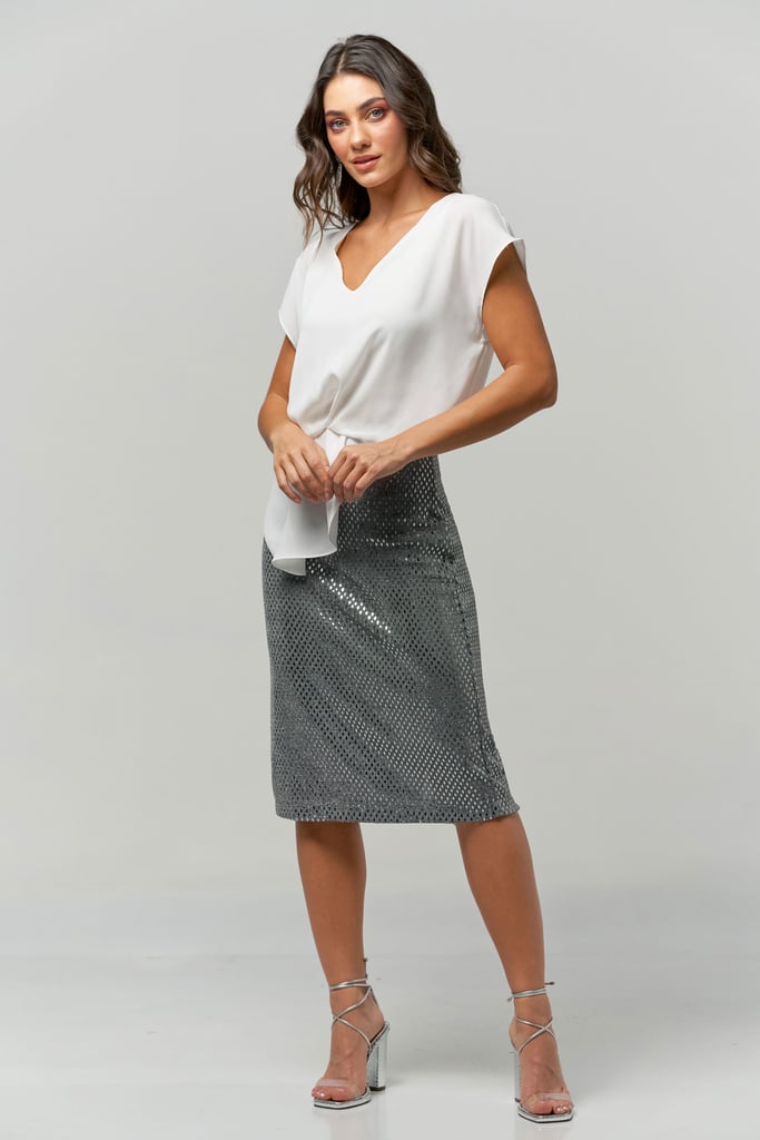 Vestido 2 em 1. Blusa de crepe, decote V e manga curta. Saia midi de lurex com aplicações
