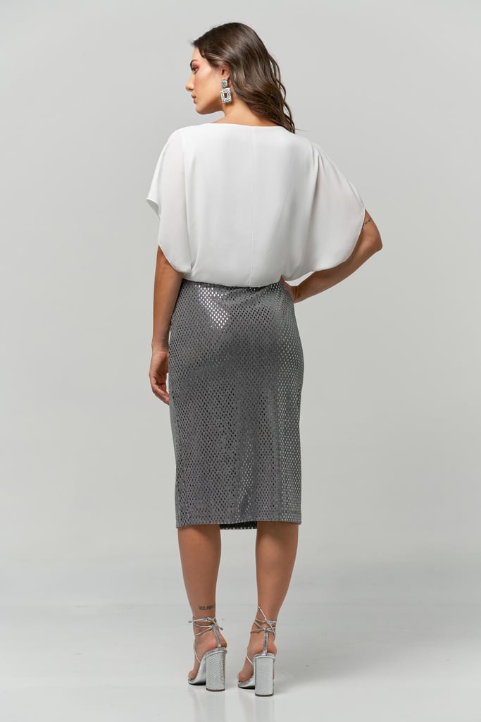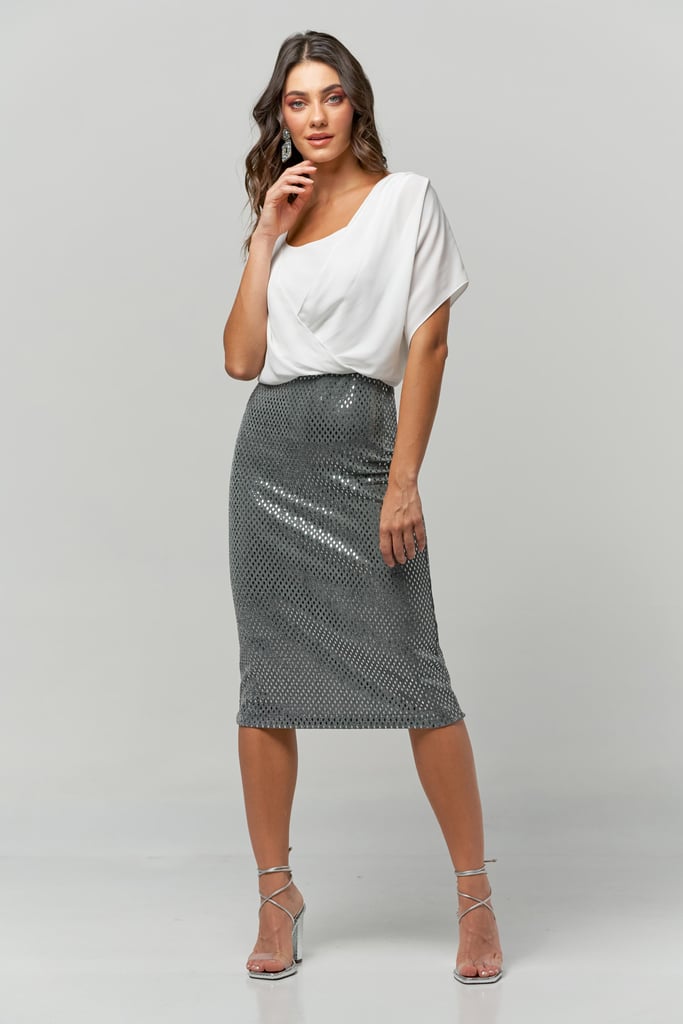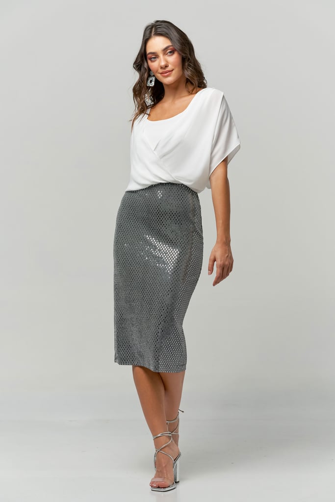 Vestido 2 em 1. Blusa de crepe sobreposta, manga curta e decote transpassado. Saia midi de lurex com aplicações.