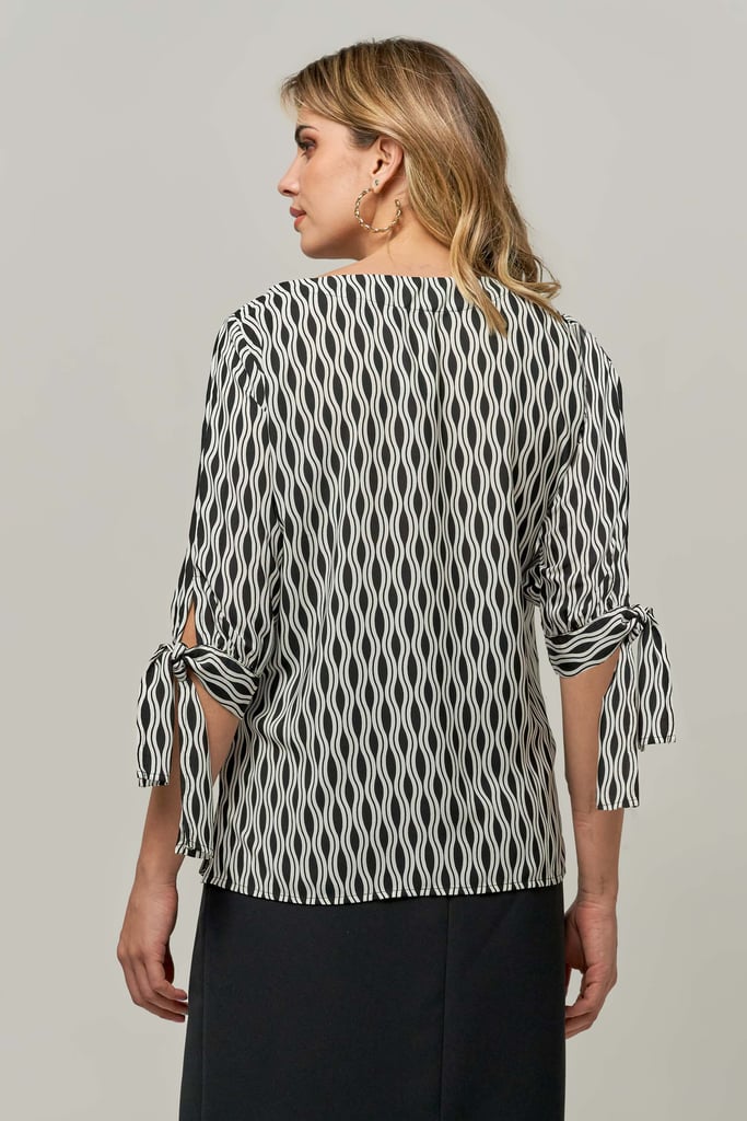 Blusa de crepe estampada, manga com faixa para amarração e aviamento no decote que dá todo o charme à peça