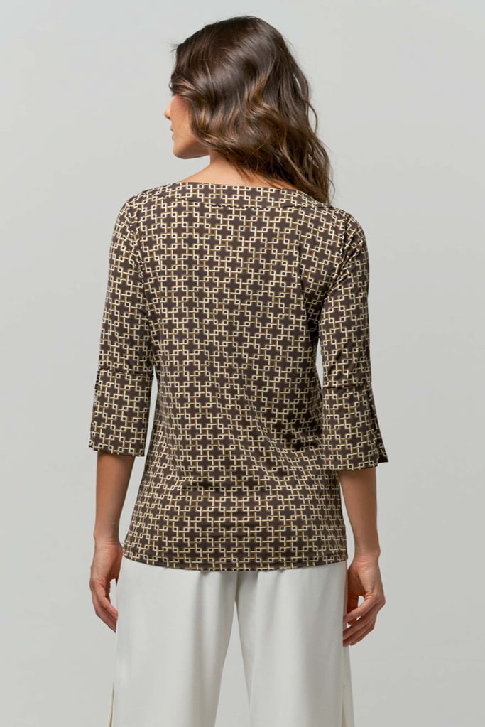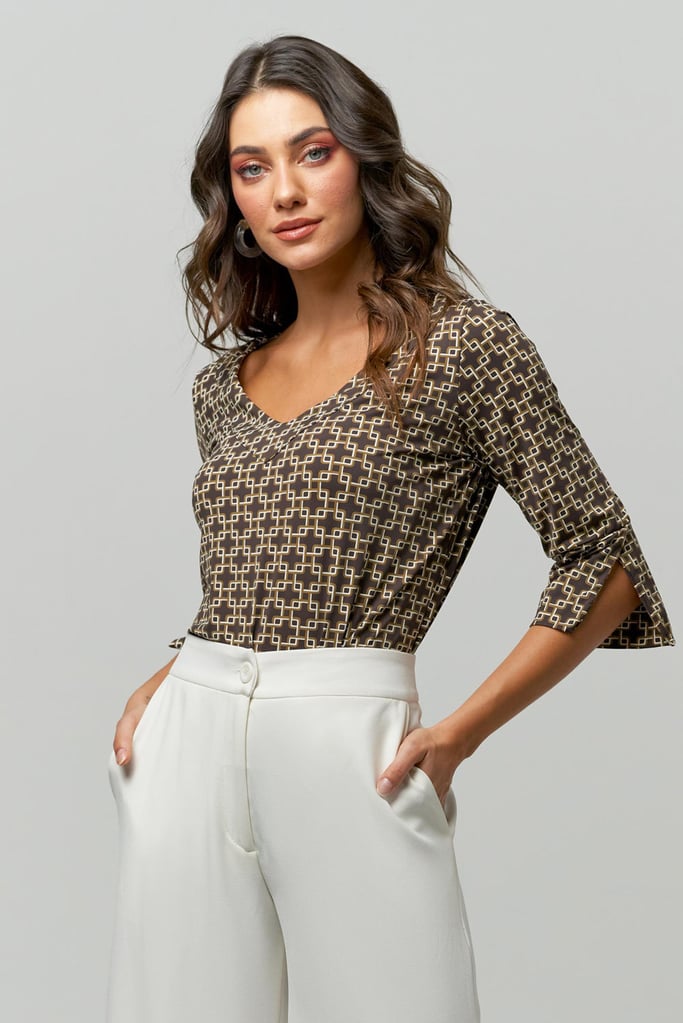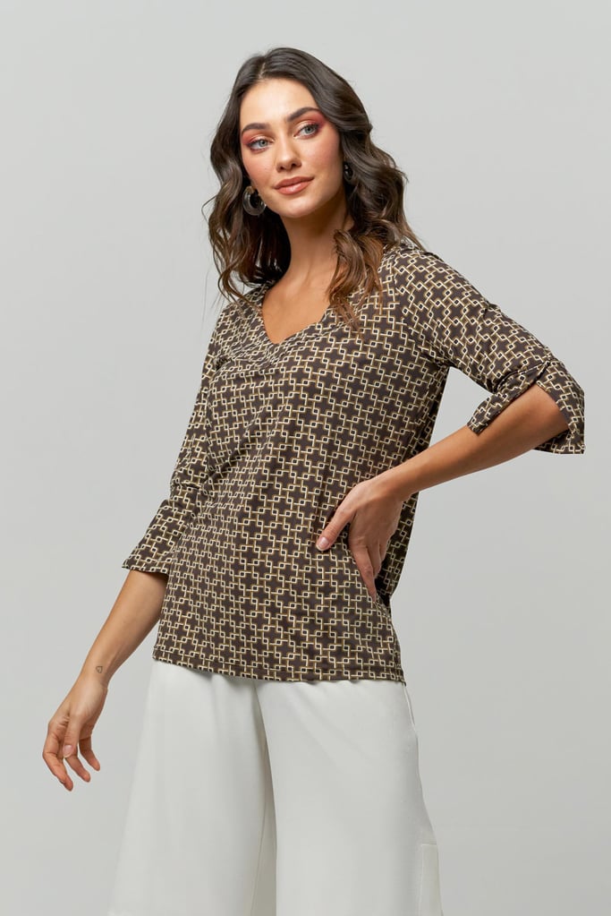 Blusa de malha Fluity, padronagem geométrica, decote V e manga 3/4 com abertura