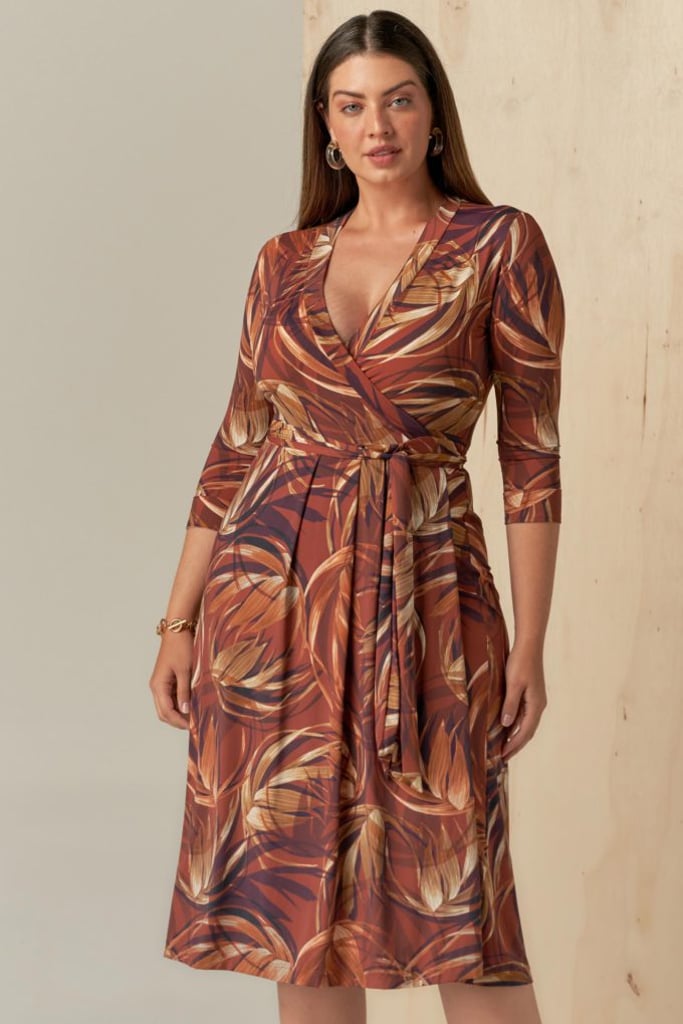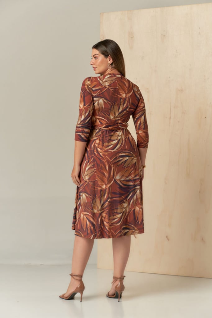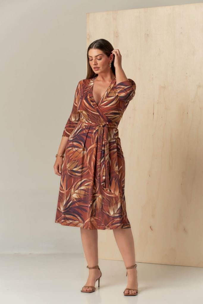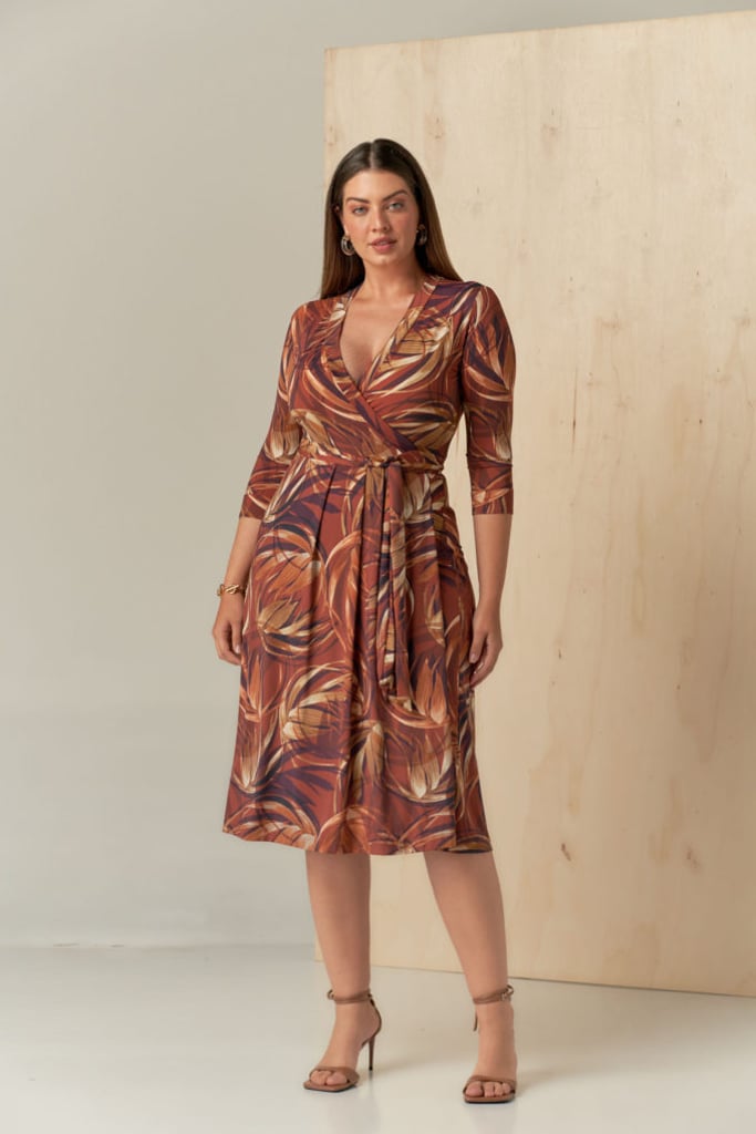 Vestido transpassado confeccionado no Fluity com estamparia exclusiva. Possui saia rodada com pregas que dá movimento e charme à peça e manga 3/4.