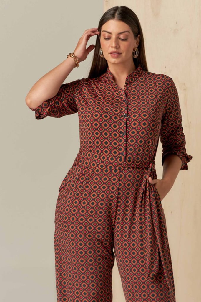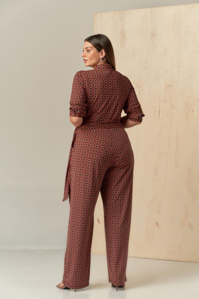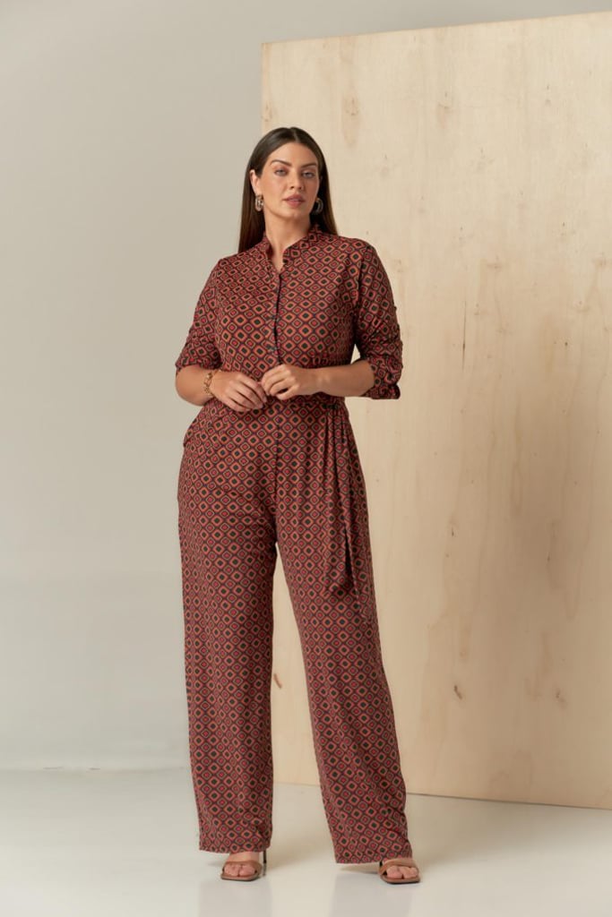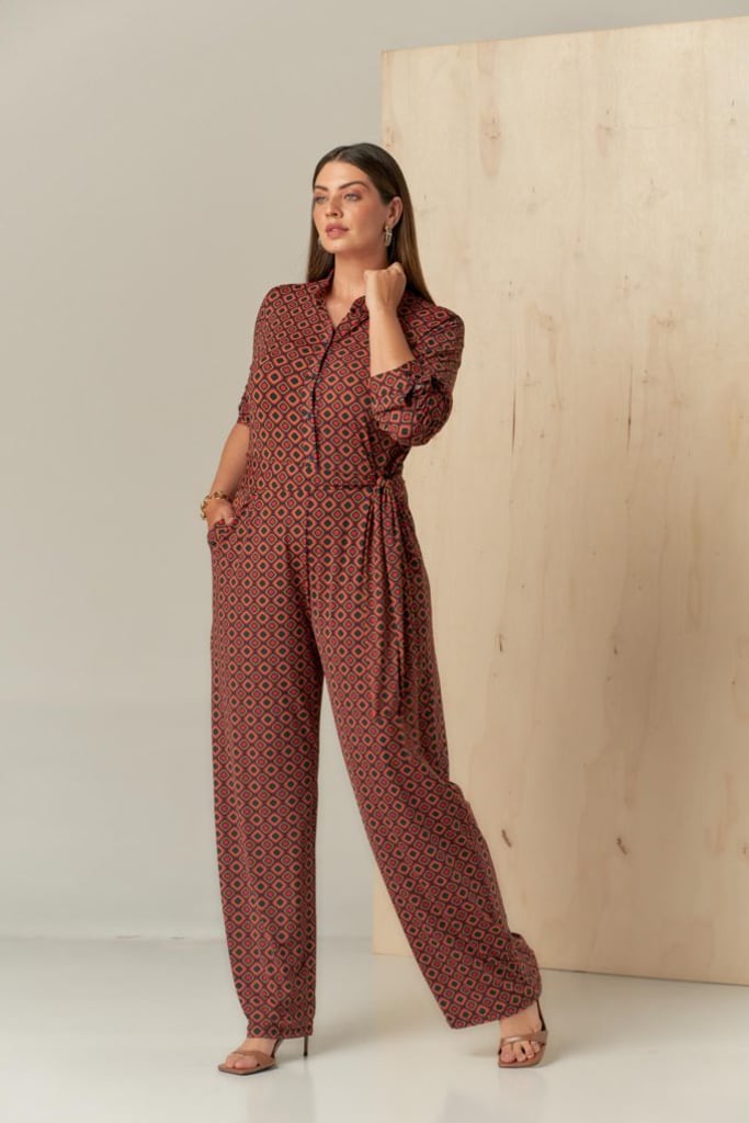 Macacão estampado no Fluity. Possui gola padre, vista interrompida com fechamento por botões, manga comprida e faixa fixa para amarração.