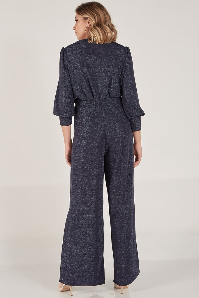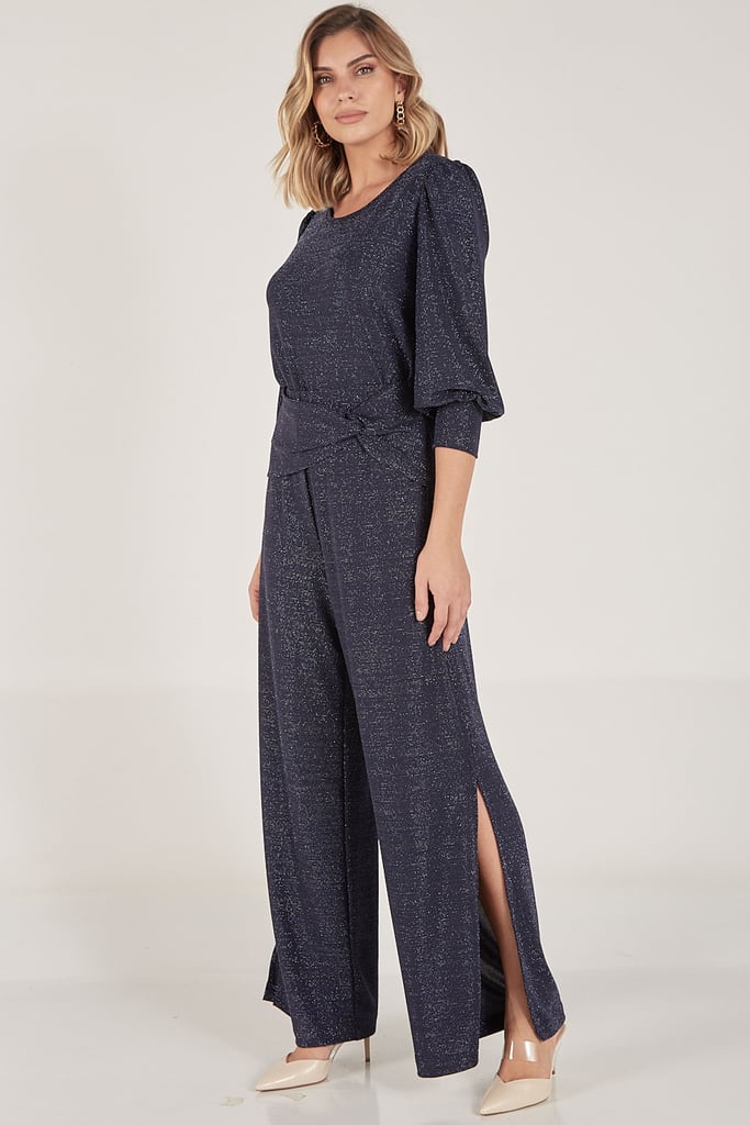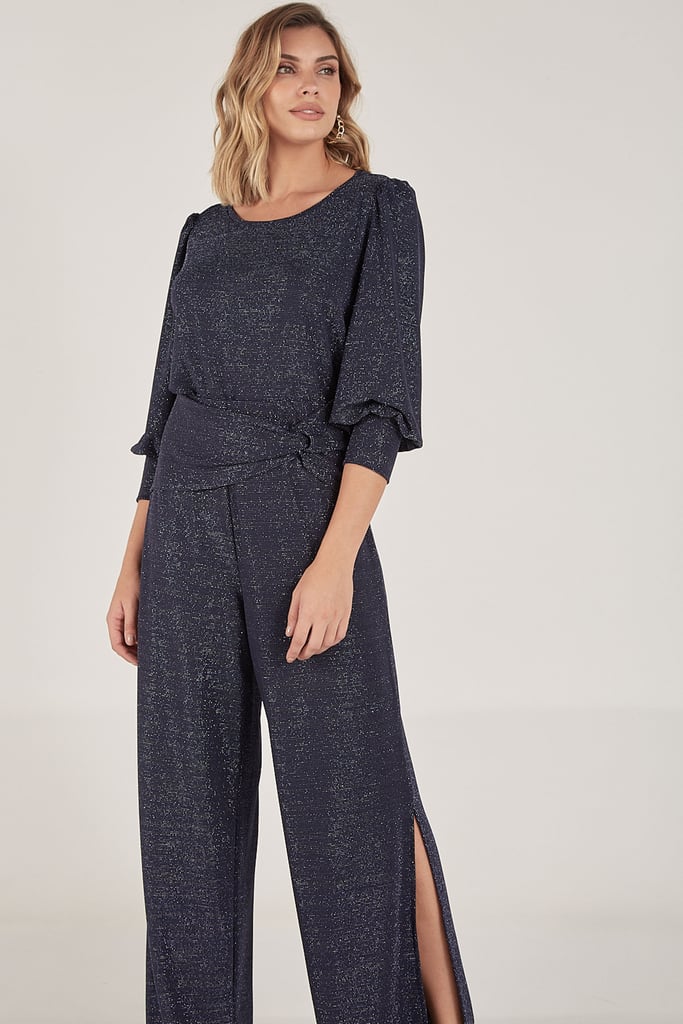 Conjunto de lurex. Blusa com decote redondo e manga longa bufante. Calça flare de cintura alta, cós com elástico, detalhe frontal de torção e fendas laterais.