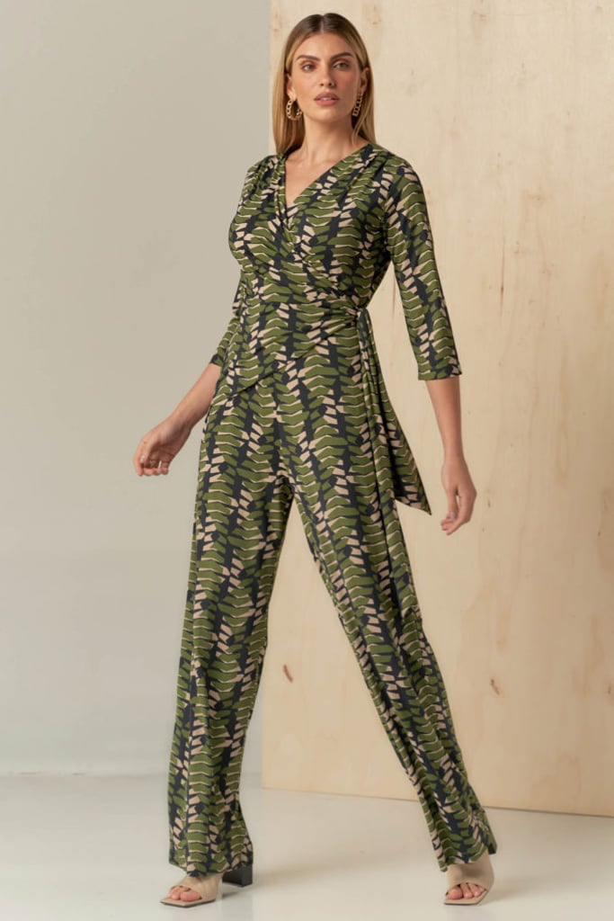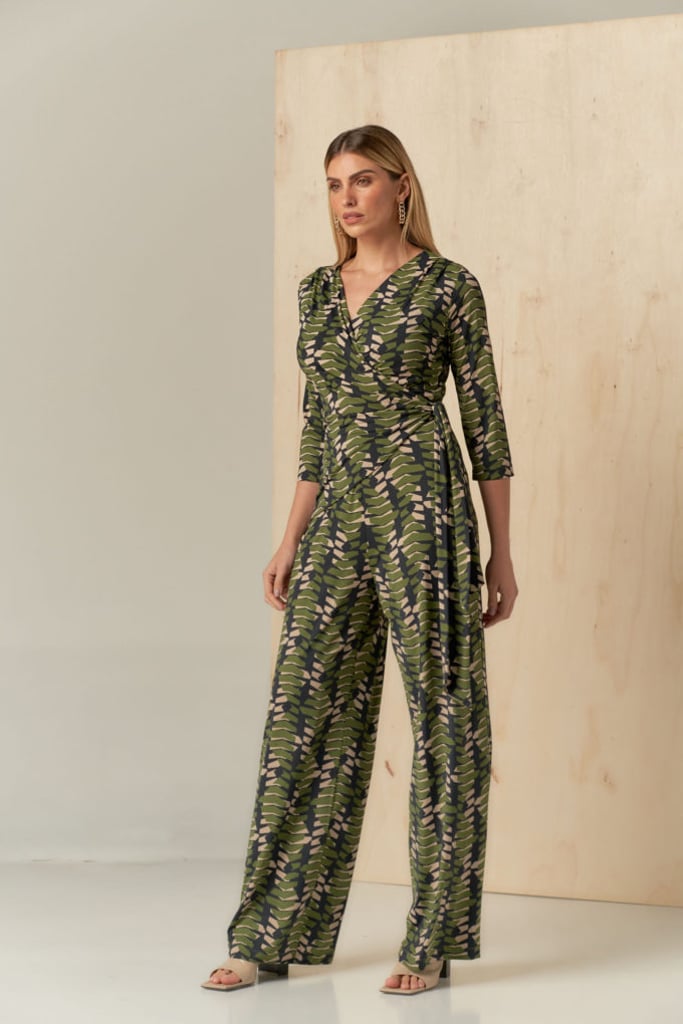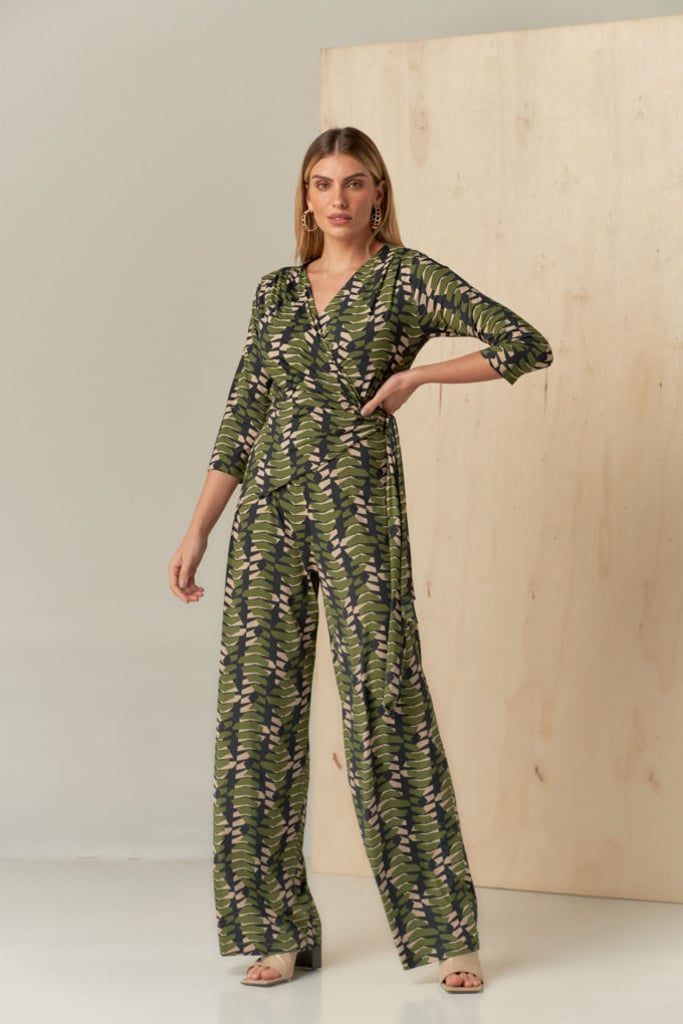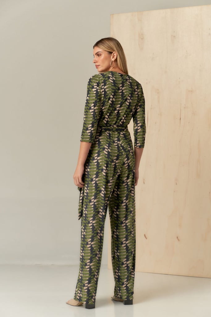 Macacão confeccionado no Fluity de estamparia exclusiva. Possui decote transpassado com faixa fixa para amarração e manga 3/4.