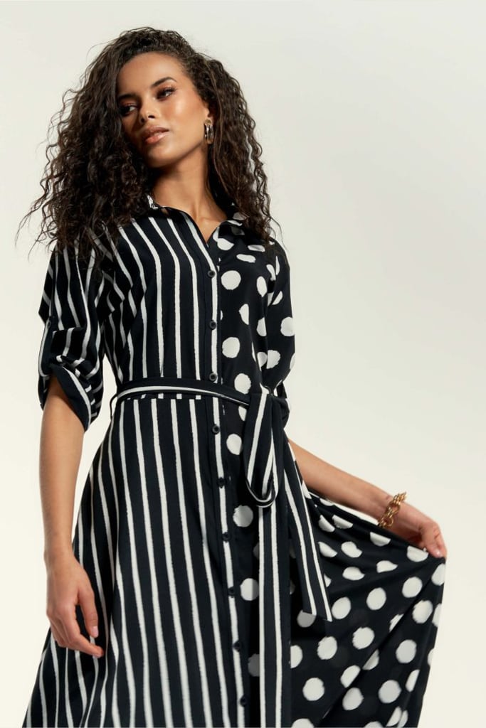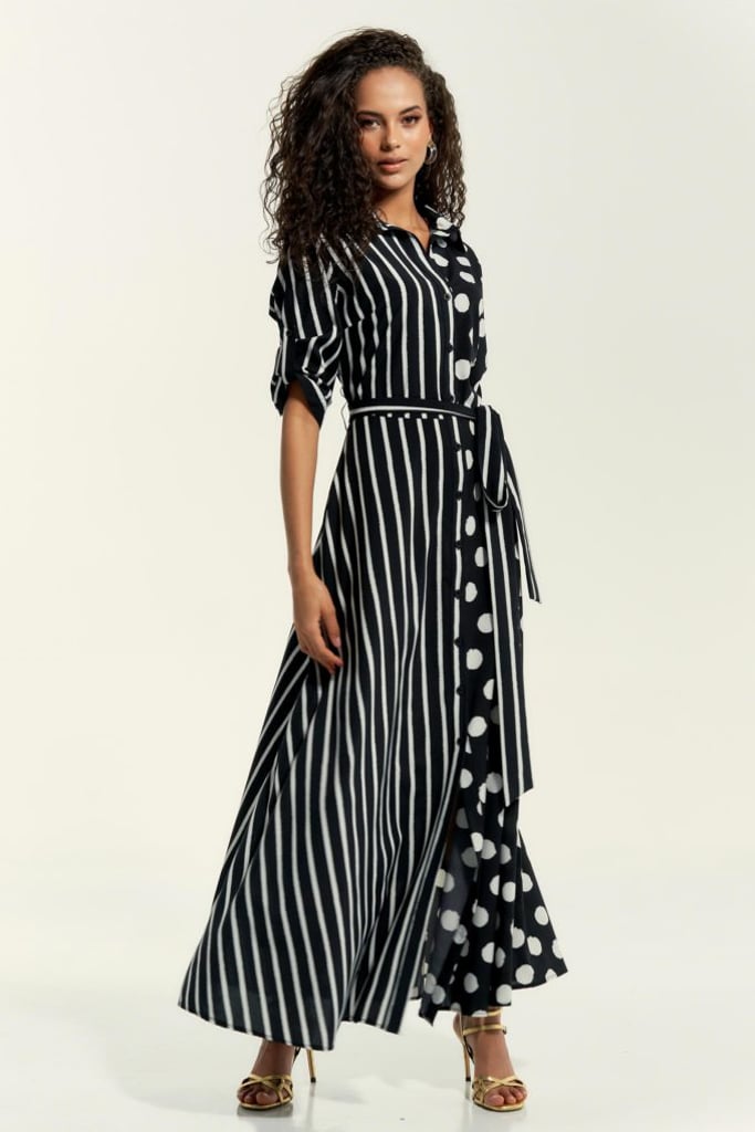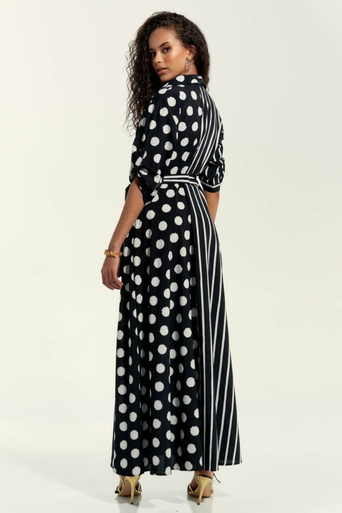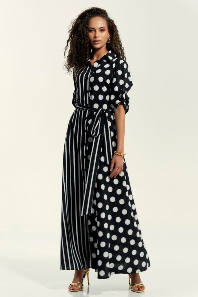 Vestido camisa longo em crepe, padronagem de poá e listras, gola esporte, fechamento frontal por botões, manga 3/4 com abotoamento no punho e martingale.