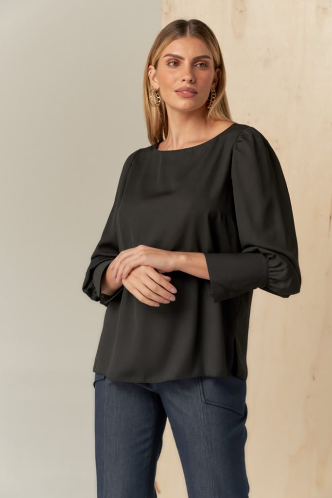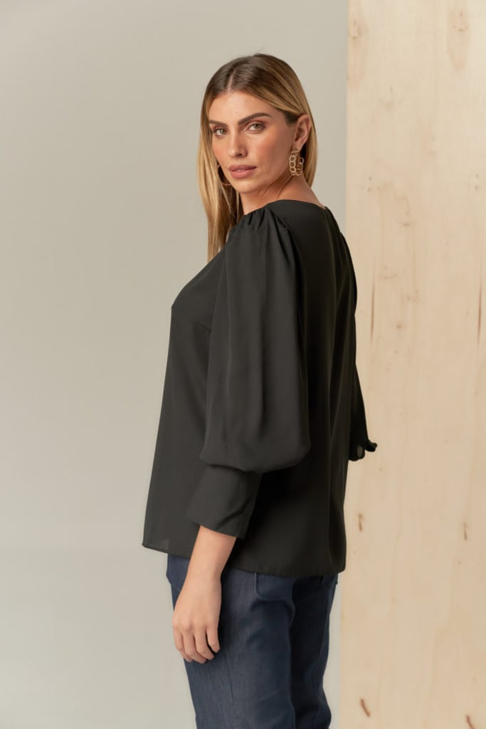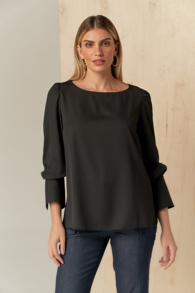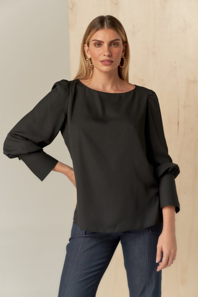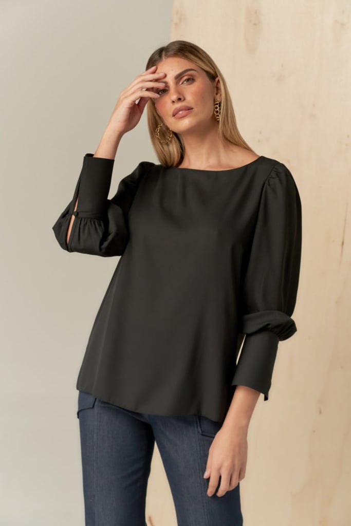 Blusa confeccionada em crepe com gola redonda, manga bufante longa com punho largo fechado por botão do mesmo tecido. Possui modelagem solta ao corpo.