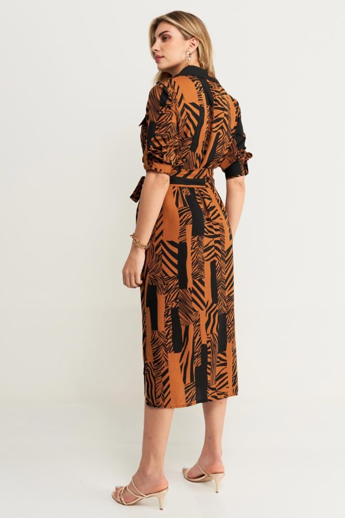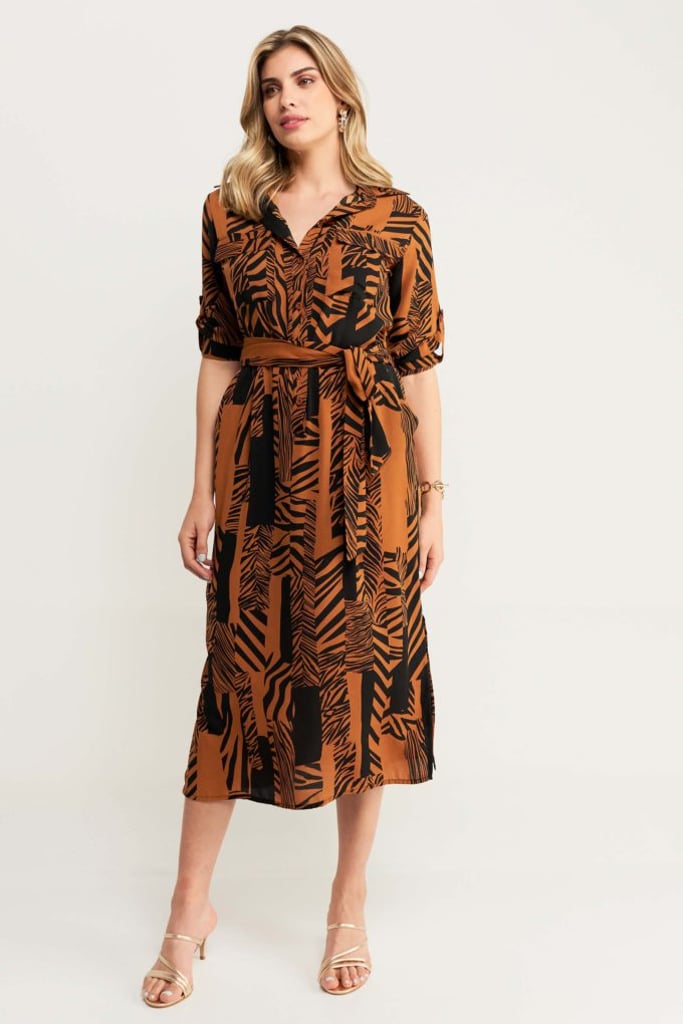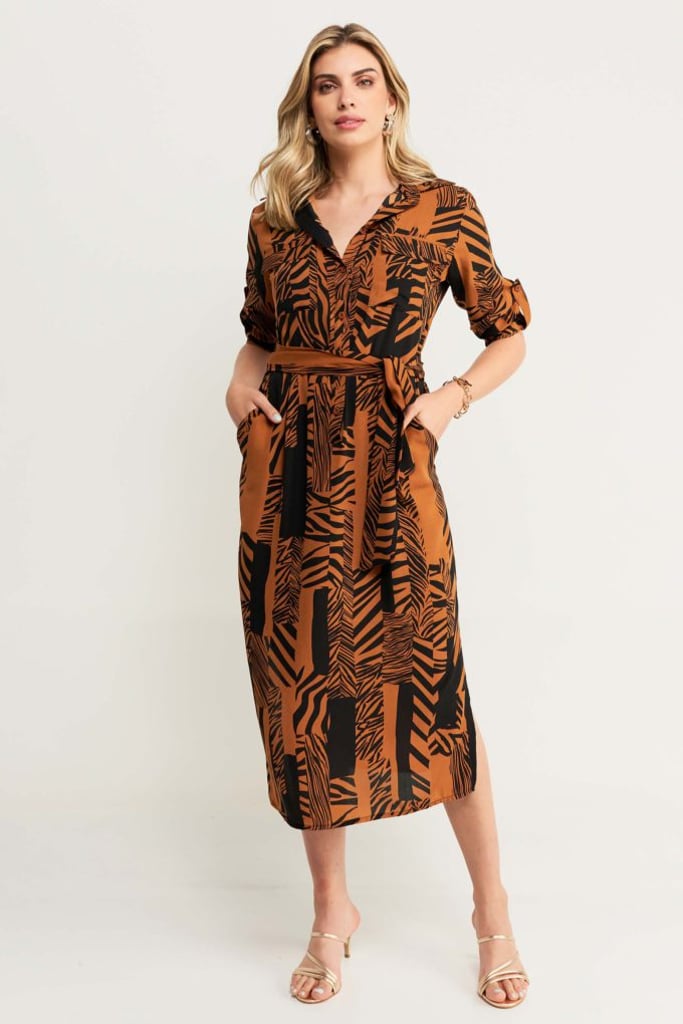 Vestido camisa de crepe, padronagem étnica, gola esporte, vista interrompida com botões, bolsos frontais, manga 3/4 de punho, martingale e fenda lateral. Acompanha faixa do mesmo tecido para amarração.
