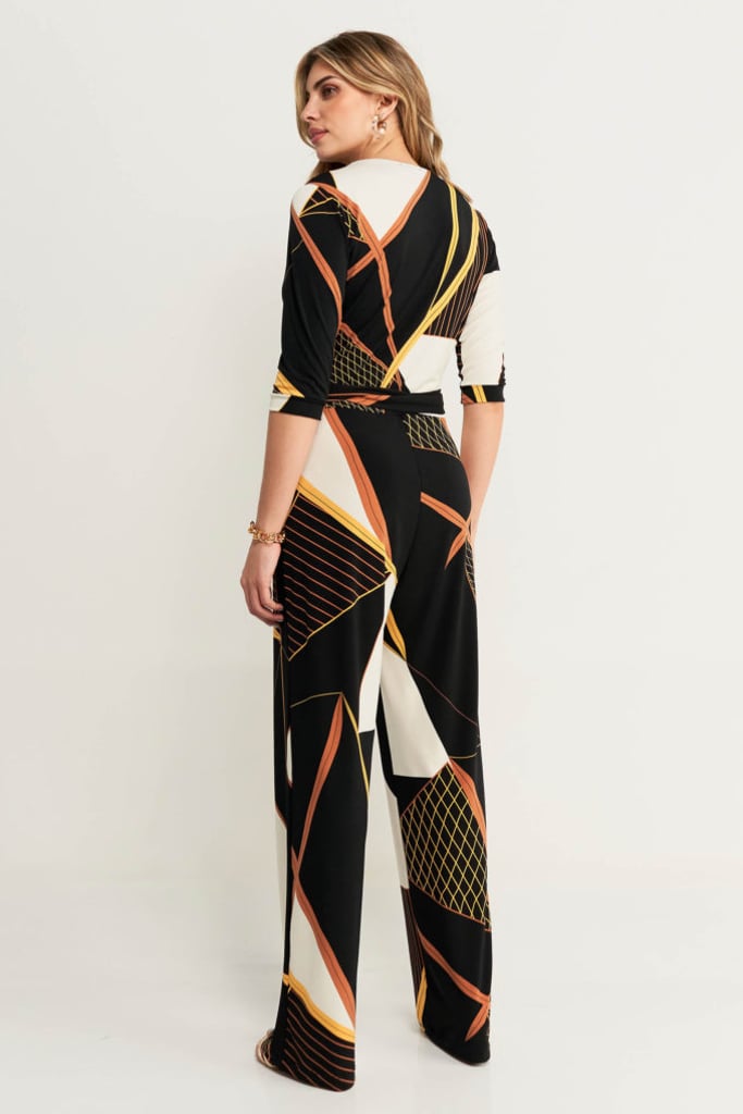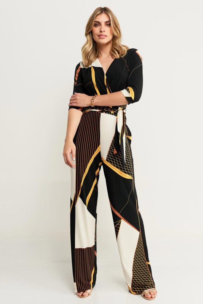 Macacão longo estampado em crepe de malha, decote transpassado, manga 3/4 e faixa acoplada para amarração.