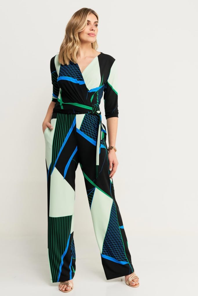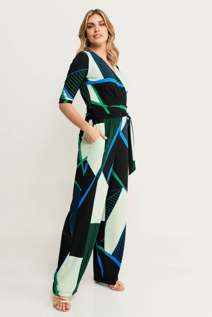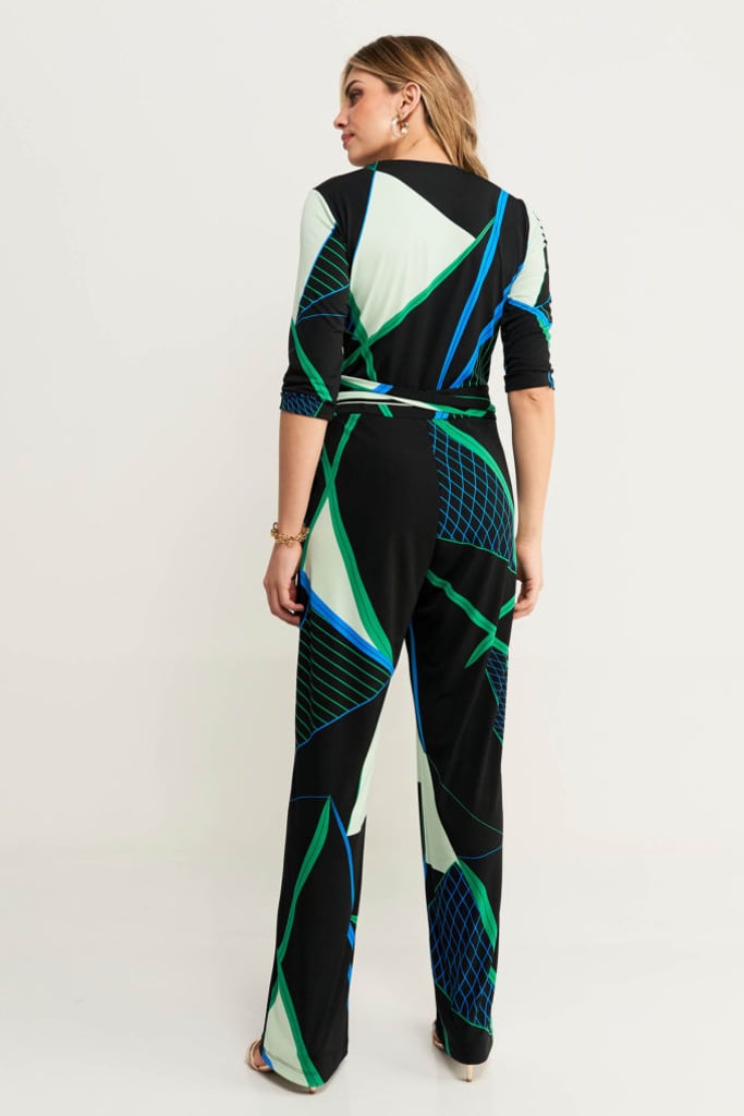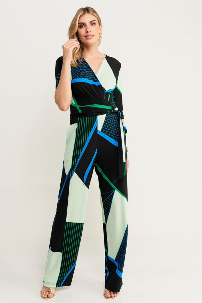 Macacão longo estampado em crepe de malha, decote transpassado, manga 3/4 e faixa acoplada para amarração.