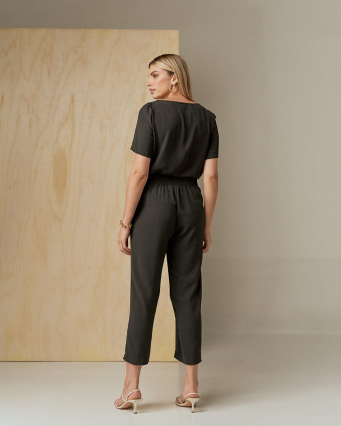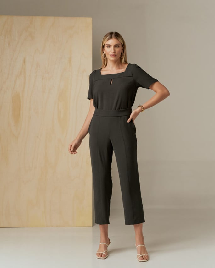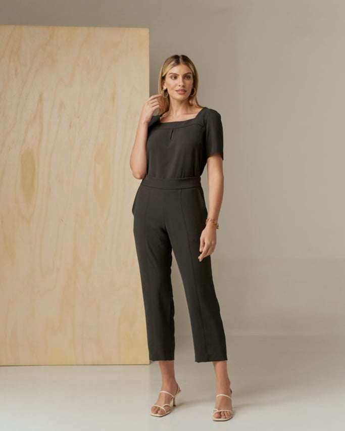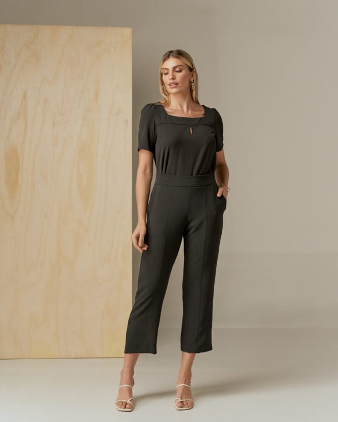 Conjunto de crepe com aspecto enrugado. Blusa com fenda no decote quadrado, manga curta e abertura lateral. Calça com recorte pespontado frontal, bolso faca e cós com elástico para maior conforto.