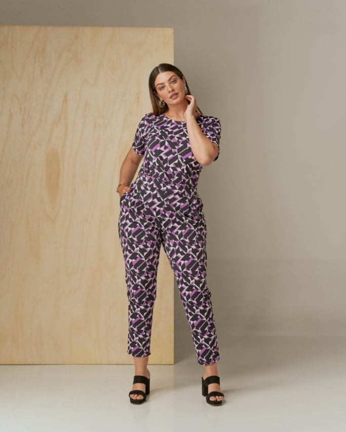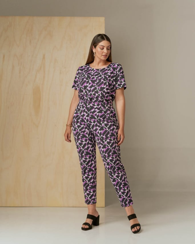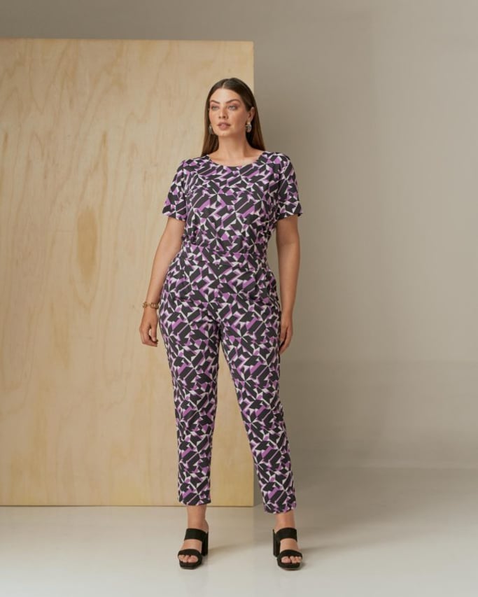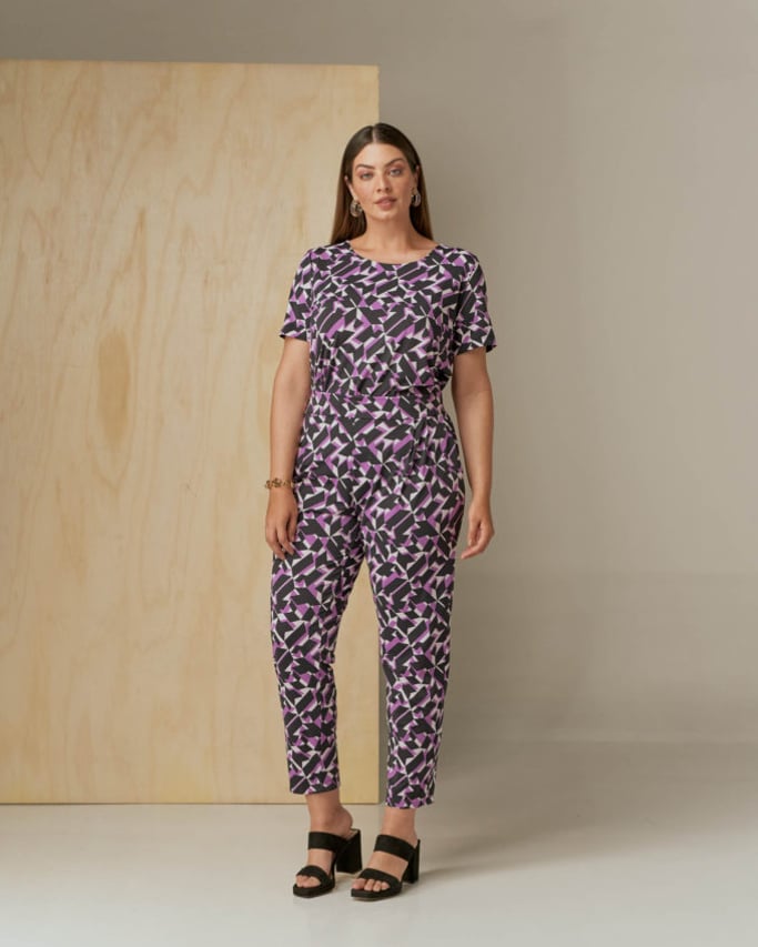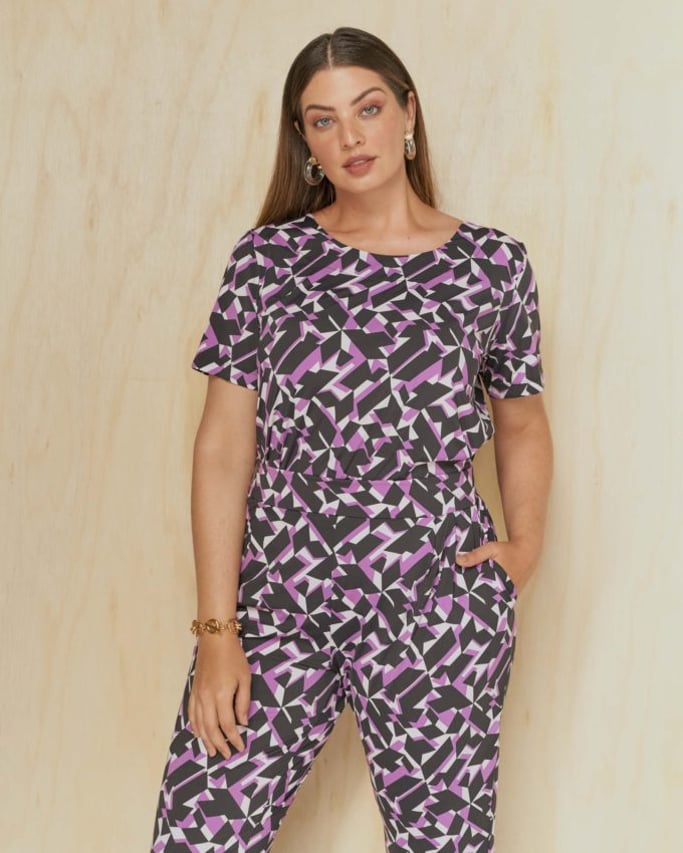 Conjunto em tecido de malha Fluity. Blusa com decote redondo, manga curta e abertura lateral. Calça estilo alfaiataria, pregas, bolso faca e cós com elástico para maior conforto.