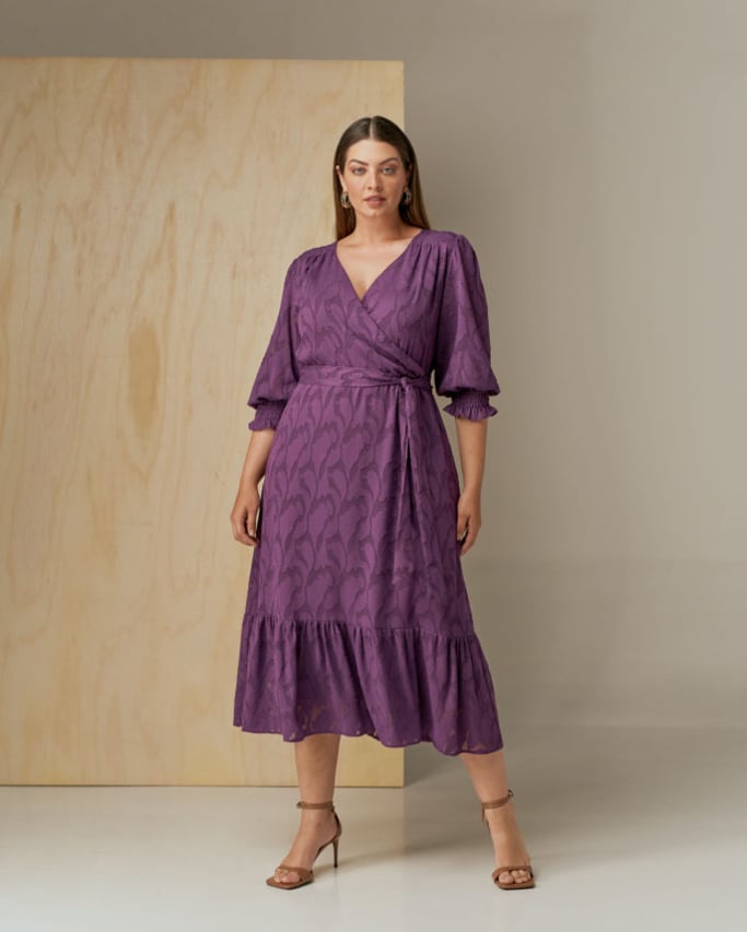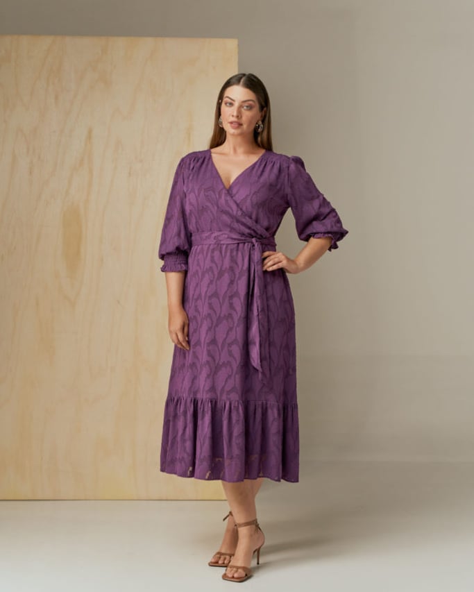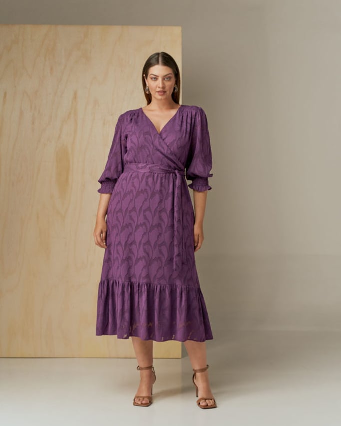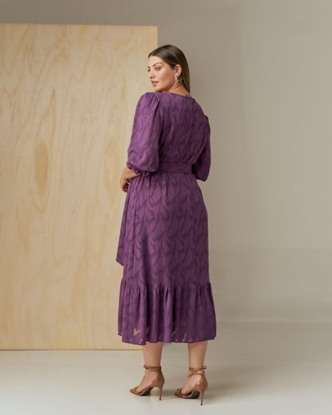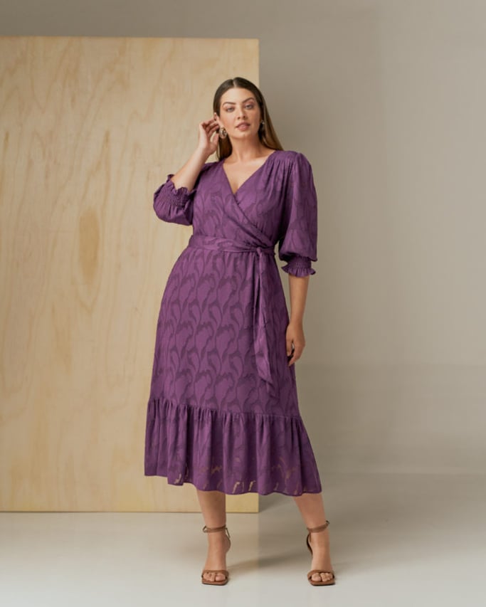 Vestido em chiffon devorê com padronagem de paisley. Possui decote transpassado, leve franzido no ombro, manga 3/4 com lastex e barra com babado. Peça forrada. Acompanha faixa do mesmo tecido para amarração.