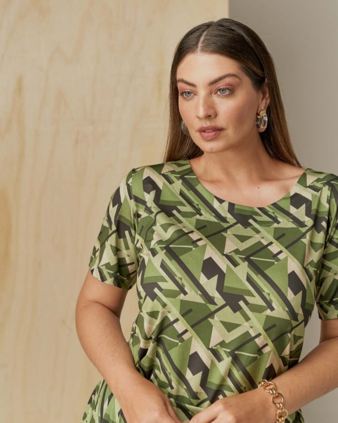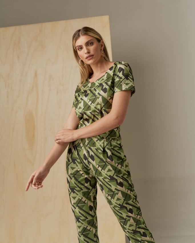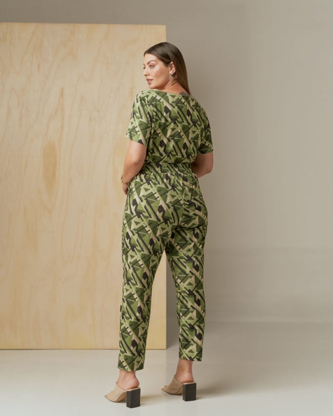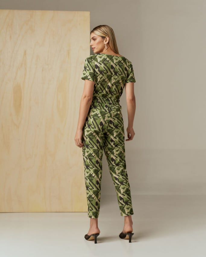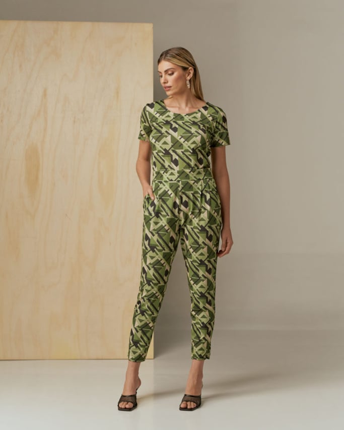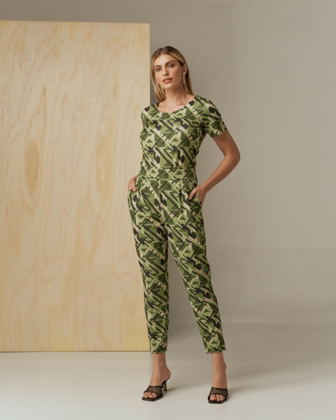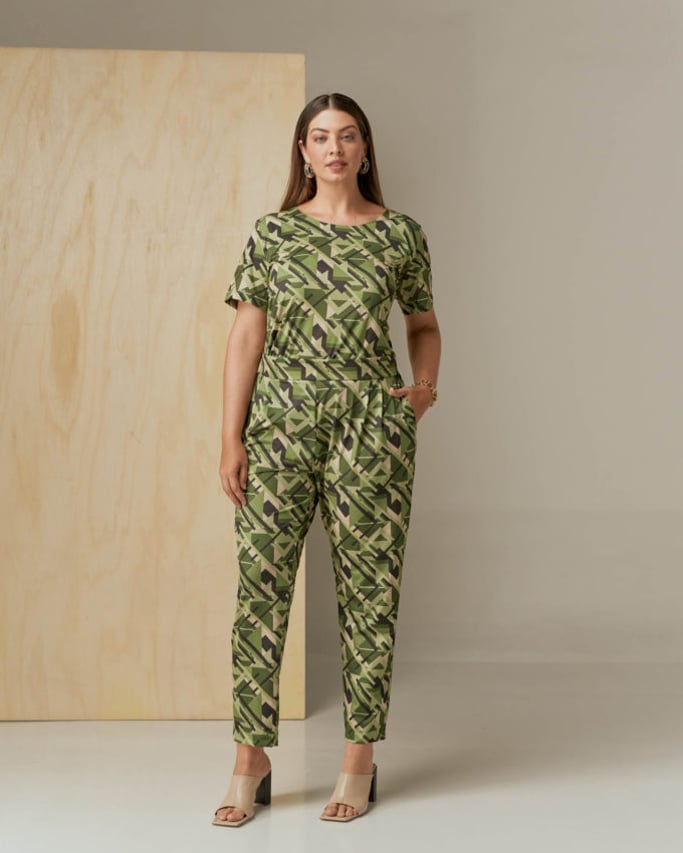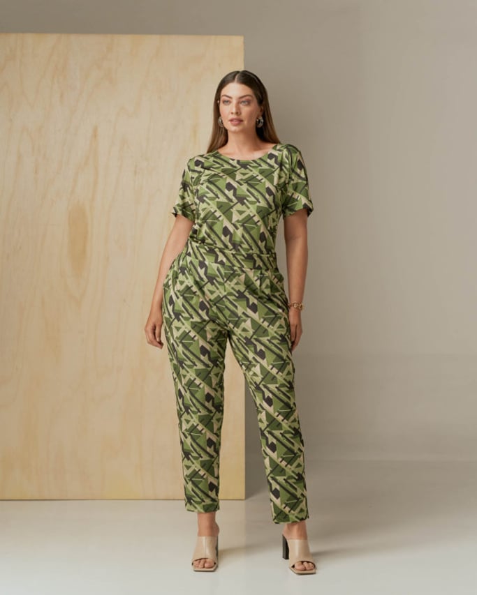 Conjunto em tecido de malha Deluxe estampado. Blusa com decote redondo, manga curta e abertura lateral. Calça estilo alfaiataria, pregas, bolso faca e cós com elástico para maior conforto.