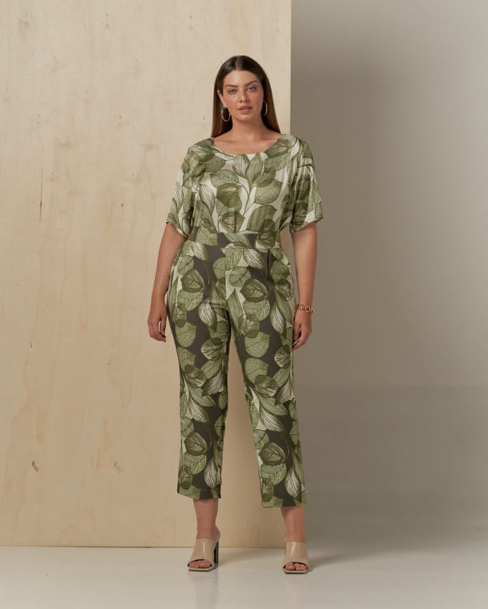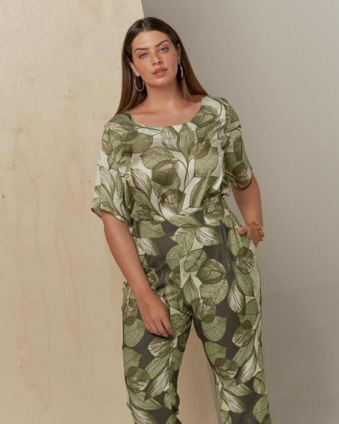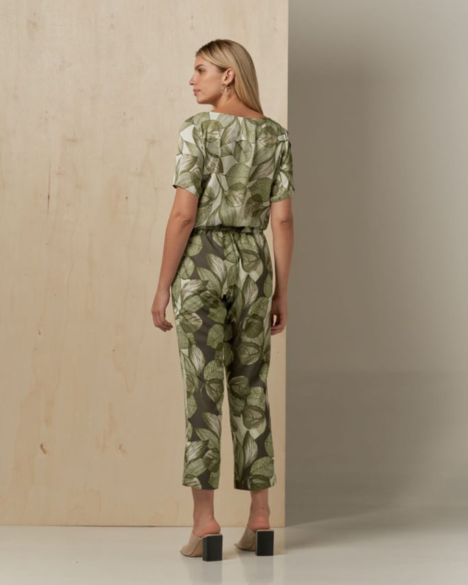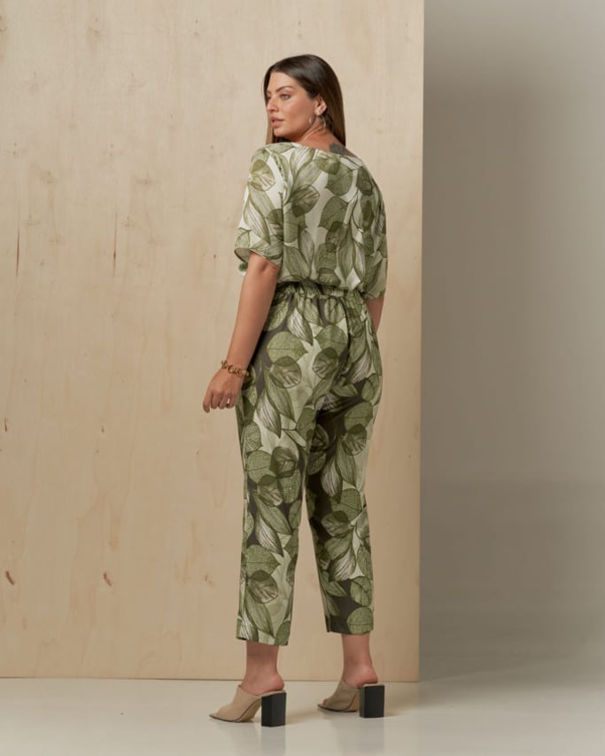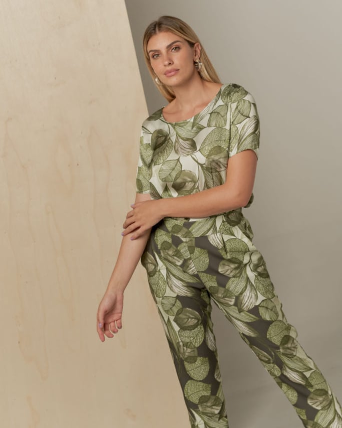 Conjunto de blusa e calça estampado. Blusa de satin, decote redondo, manga curta e abertura lateral. Calça de crepe estilo alfaiataria, pregas, bolso faca e cós com elástico nas costas para maior conforto.