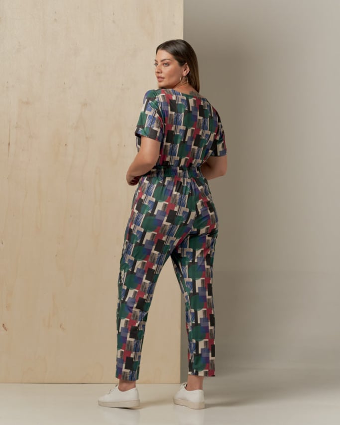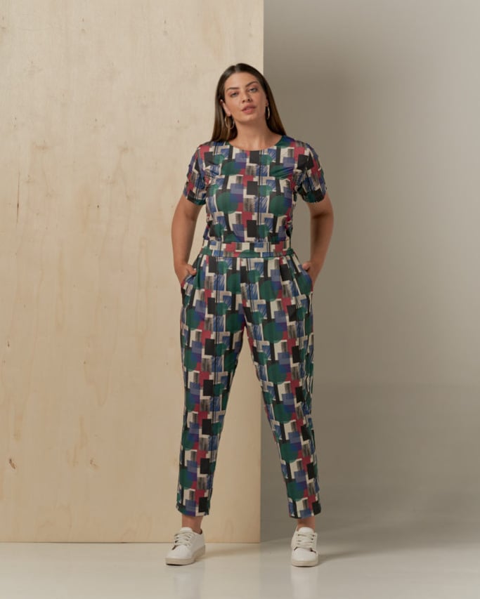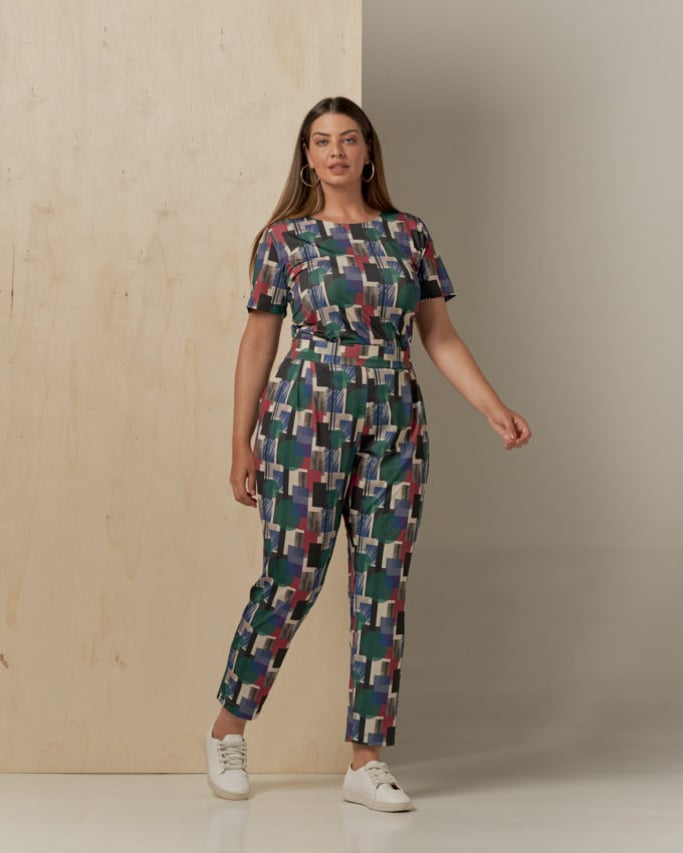 Conjunto em tecido de malha Deluxe estampado. Blusa com decote redondo, manga curta e abertura lateral. Calça estilo alfaiataria, pregas, bolso faca e cós com elástico para maior conforto.