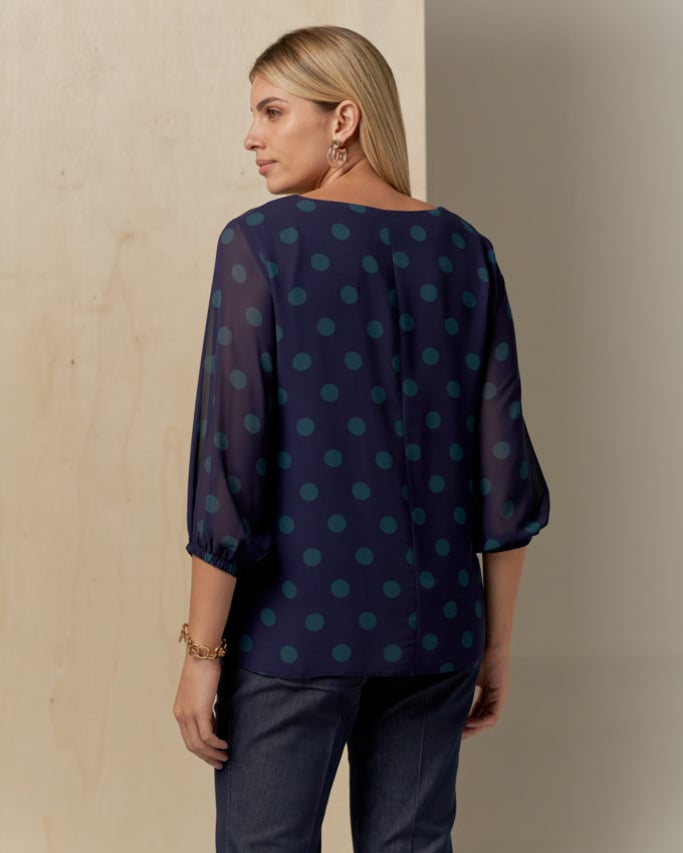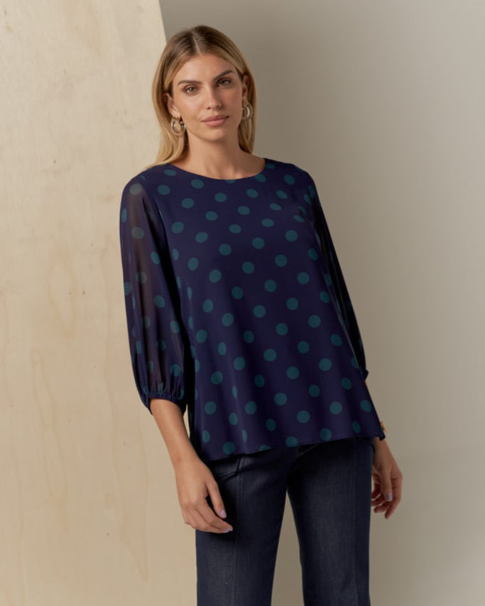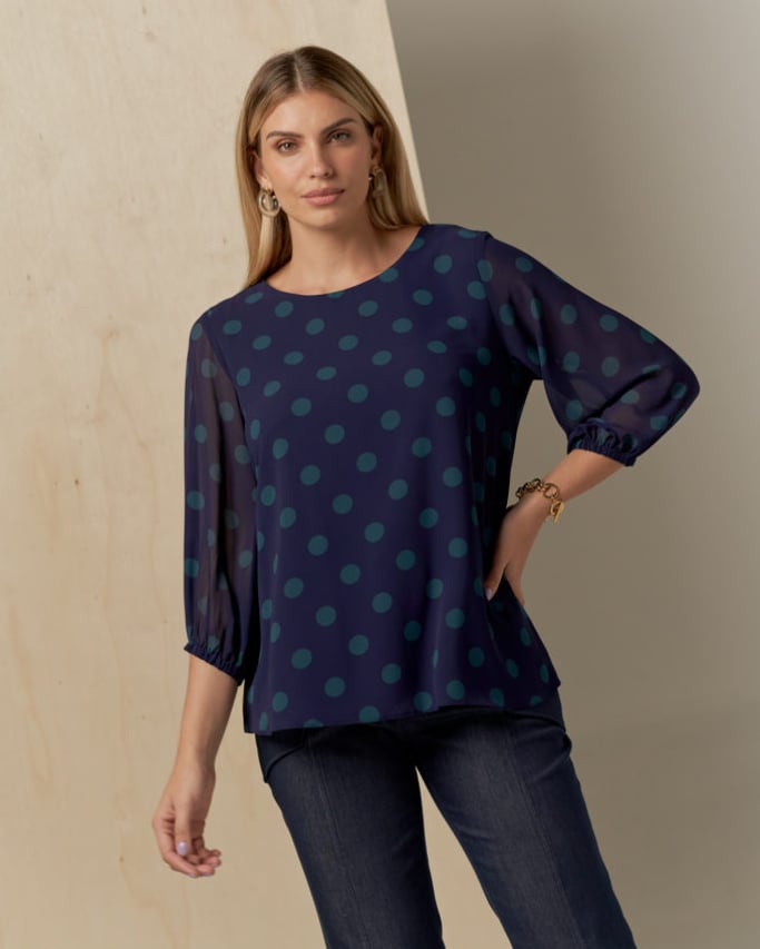 Blusa de chiffon com padronagem poá, decote redondo e manga 3/4 com elástico na barra. Possui forro.