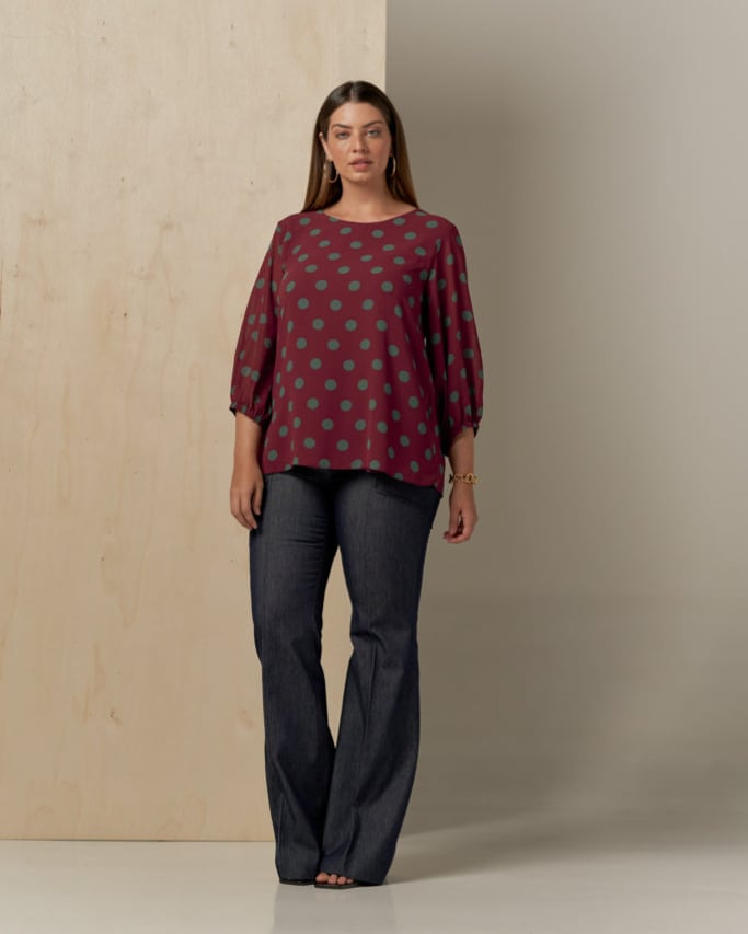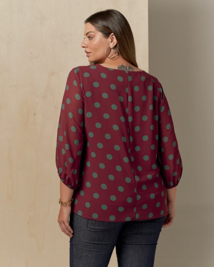 Blusa de chiffon com padronagem poá, decote redondo e manga 3/4 com elástico na barra. Possui forro.