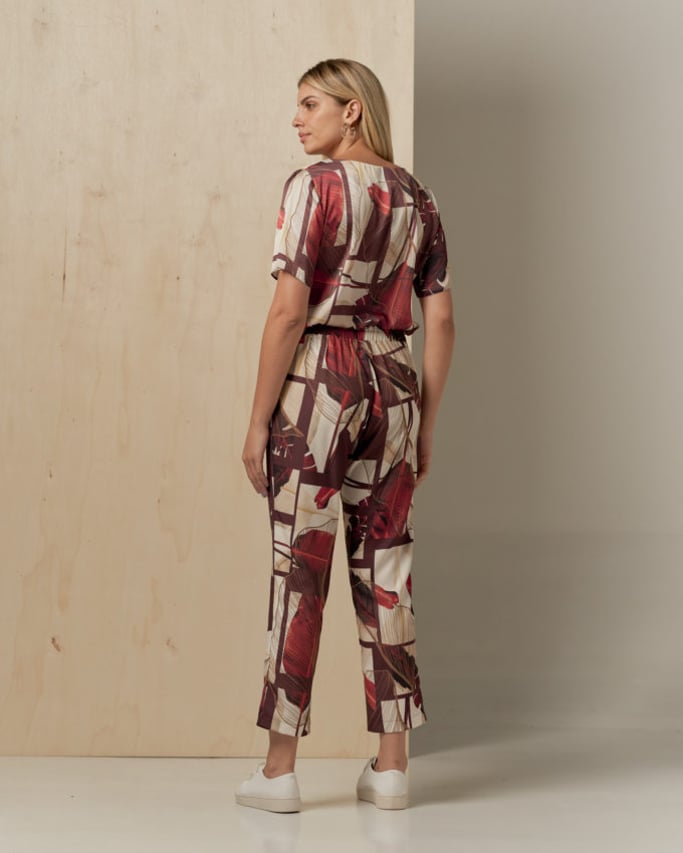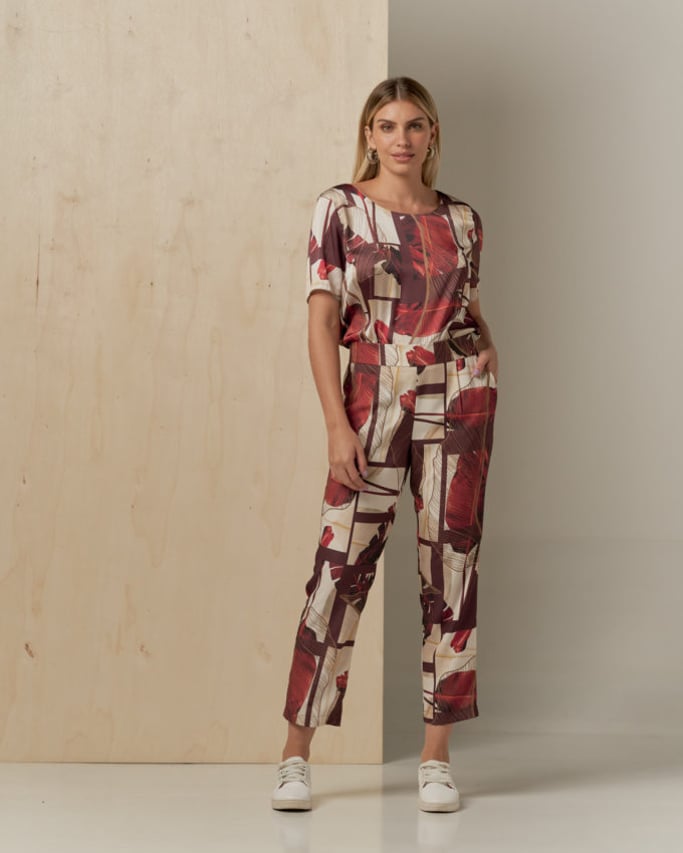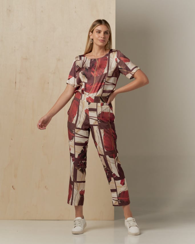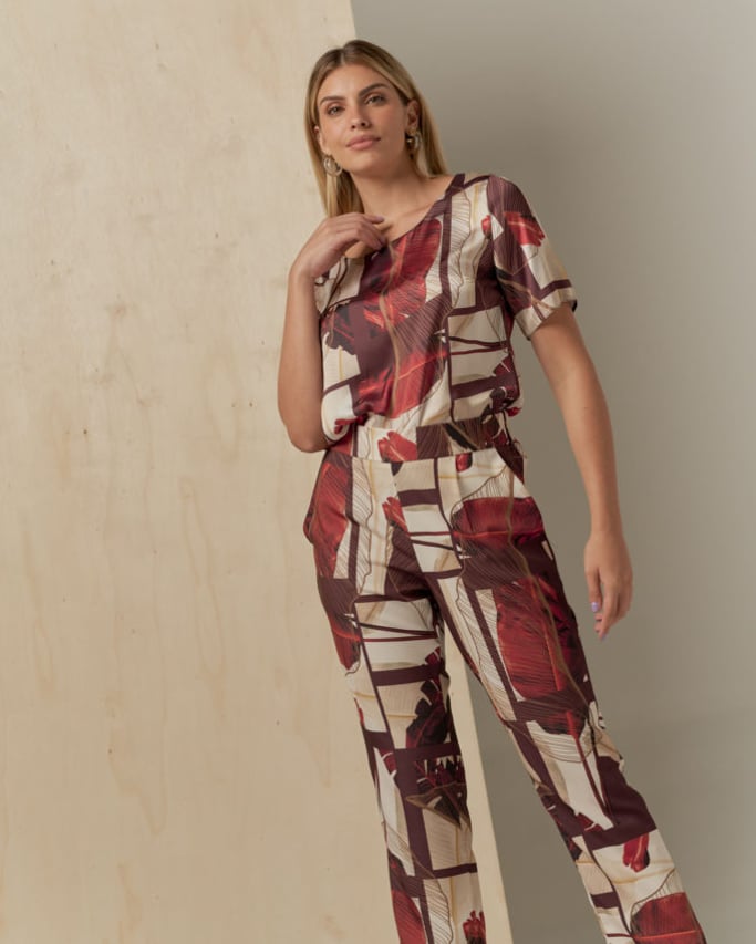 Conjunto de blusa e calça estampado. Blusa de satin, decote redondo, manga curta e abertura lateral. Calça de crepe estilo alfaiataria, pregas, bolso faca e cós com elástico nas costas para maior conforto.