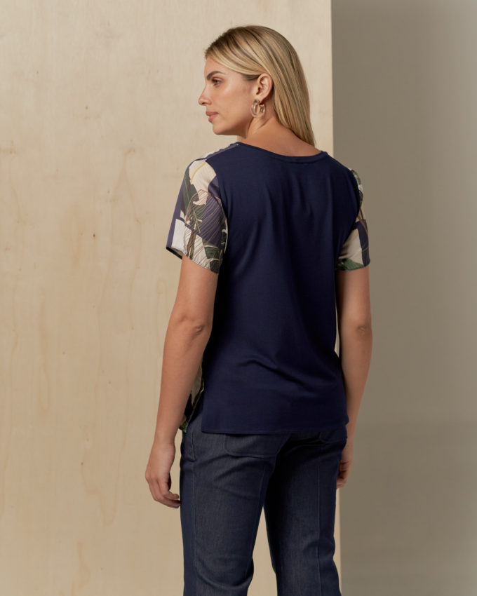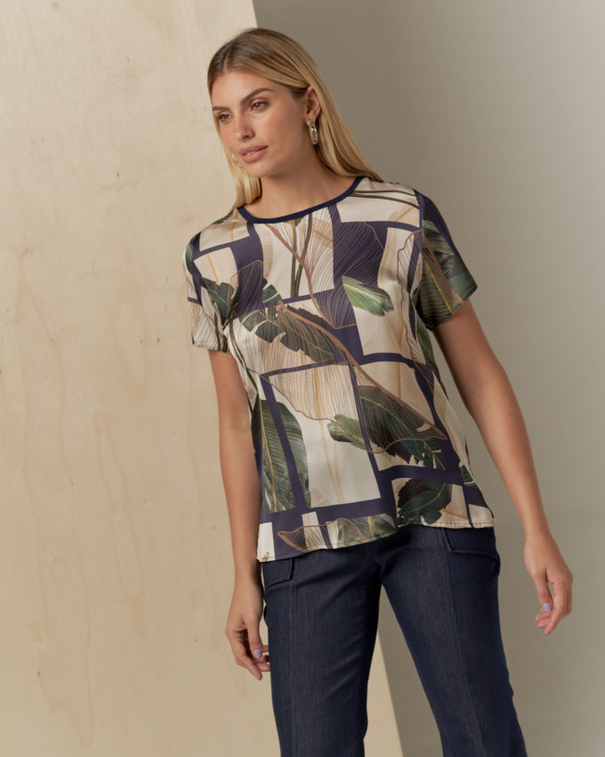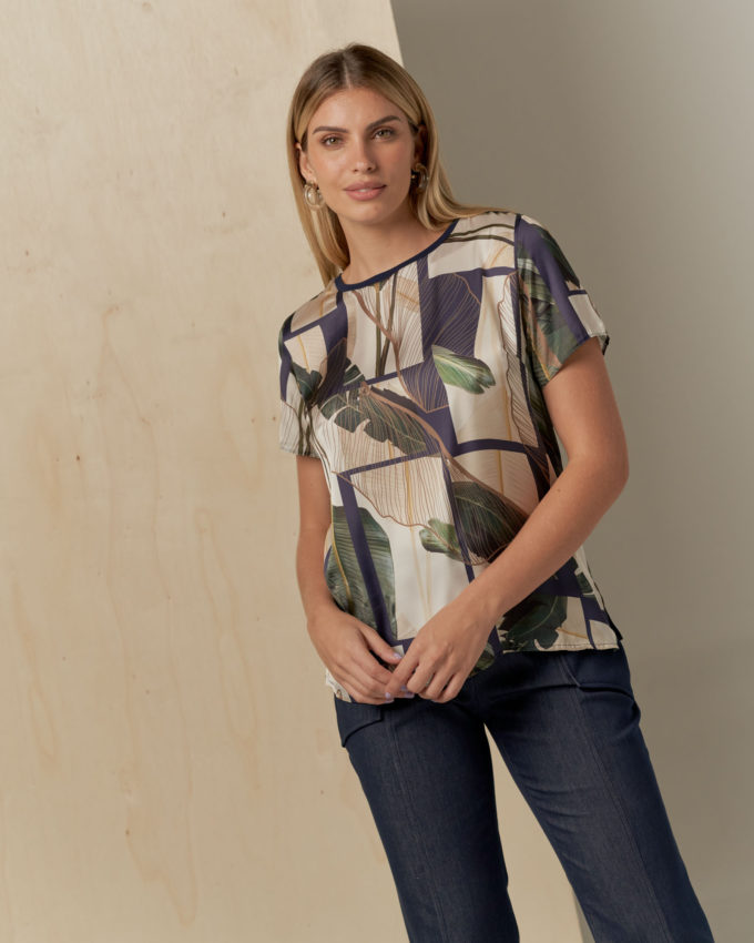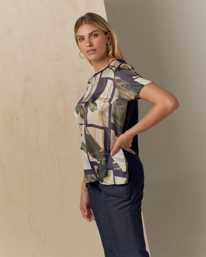 Blusa frente de cetim estampada, decote redondo, manga curta, abertura na lateral e costas de malha.