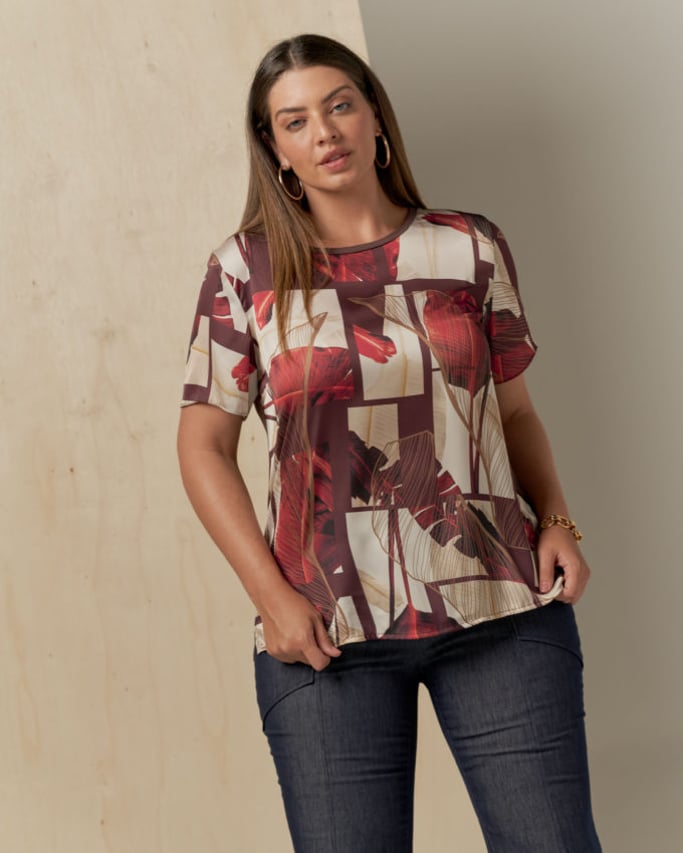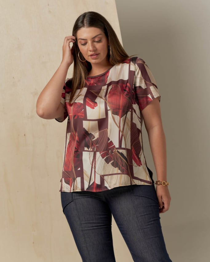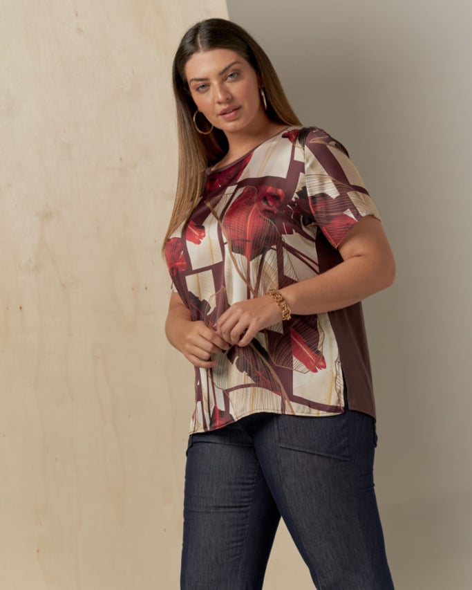 Blusa frente de cetim estampada, decote redondo, manga curta, abertura na lateral e costas de malha.
