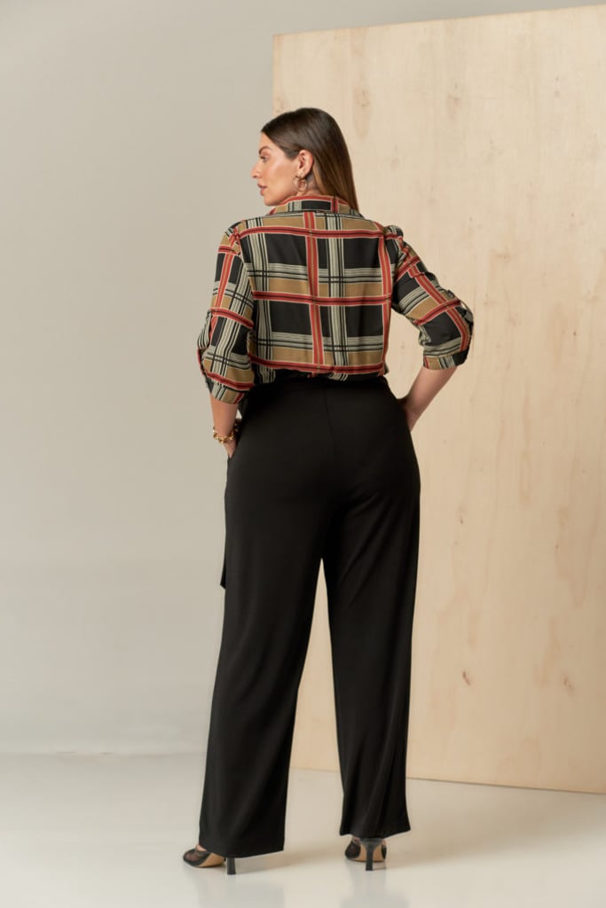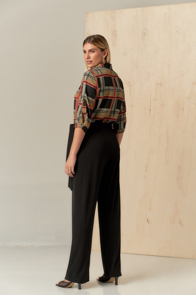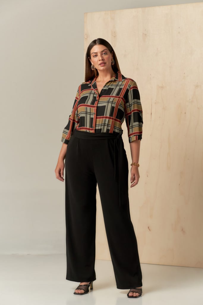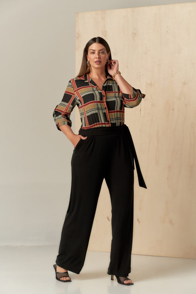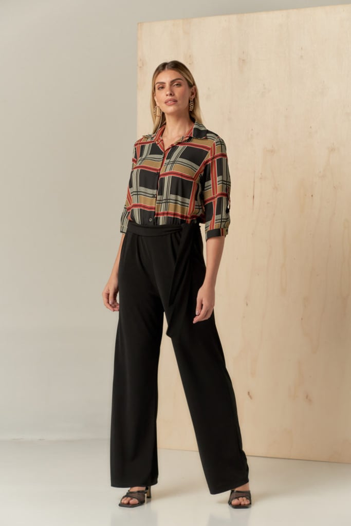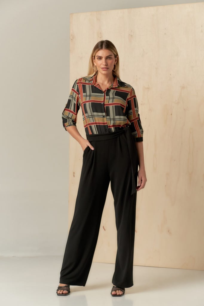 A parte superior do macacão, que mais lembra uma camisa, é confeccionada no tecido de crepe e possui padronagem listrada. Já a calça é feita na malha para maior conforto. Detalhe de fechamento frontal por botões e bolsos laterais. A faixa é fixa e dá todo o charme à peça.