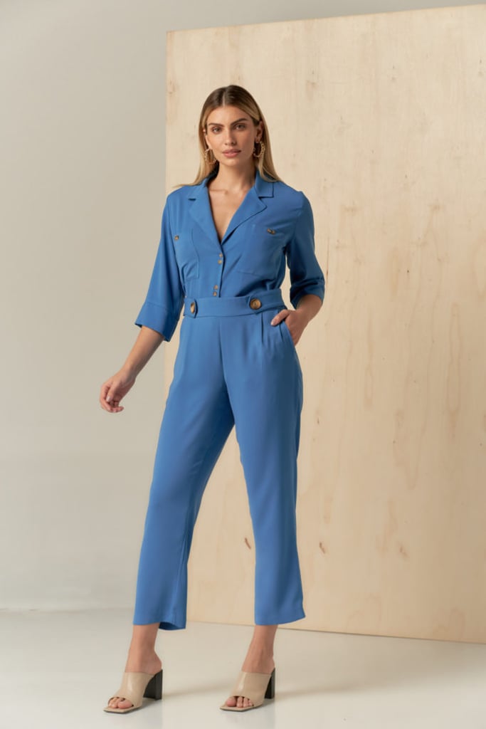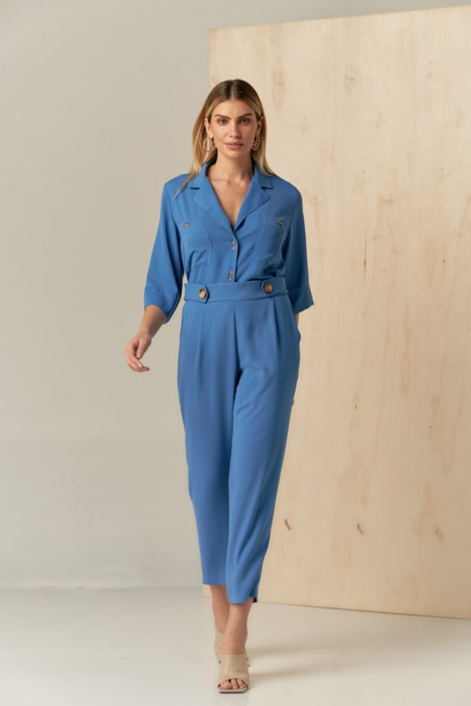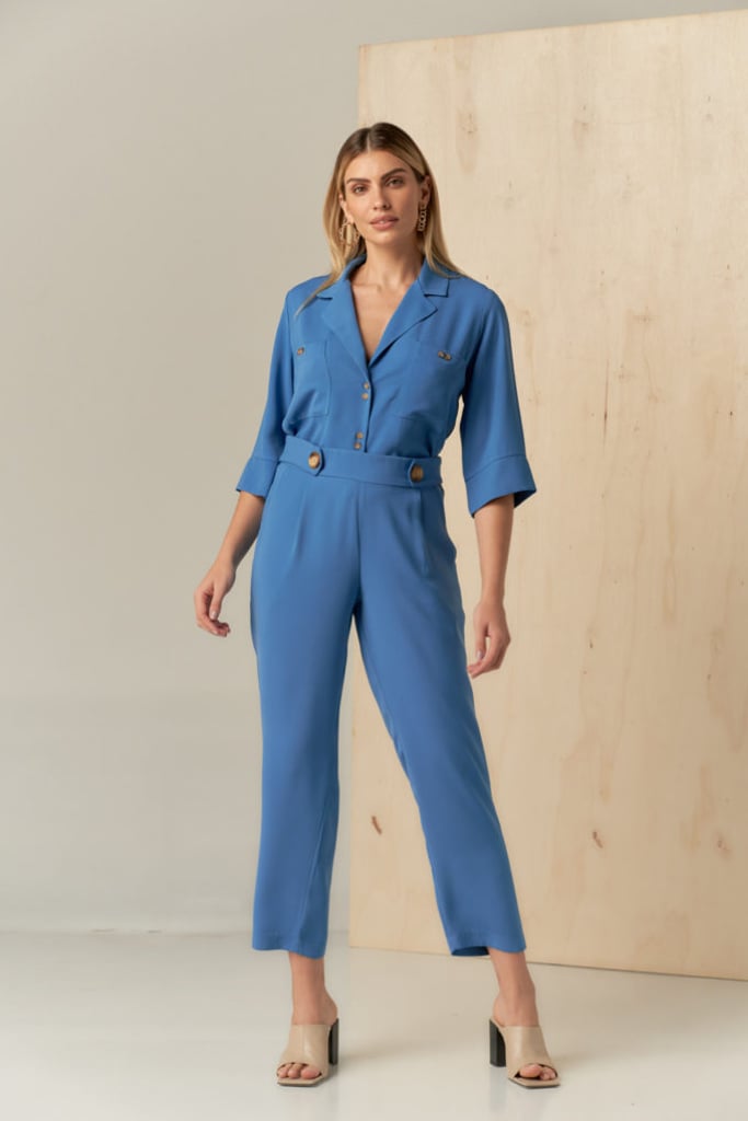 Conjunto de camisa e calça confeccionado em crepe encorpado. Camisa possui gola de blazer fechada por botões, bolsos frontais e manga ampla 3/4. Calça traz a nossa modelagem reta clássica com pregas, bolsos laterais e cós com elástico nas costas para maior conforto. Detalhe de botões decorativos que traz charme à peça.