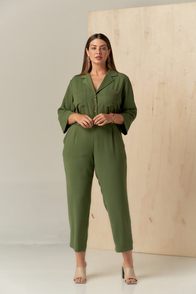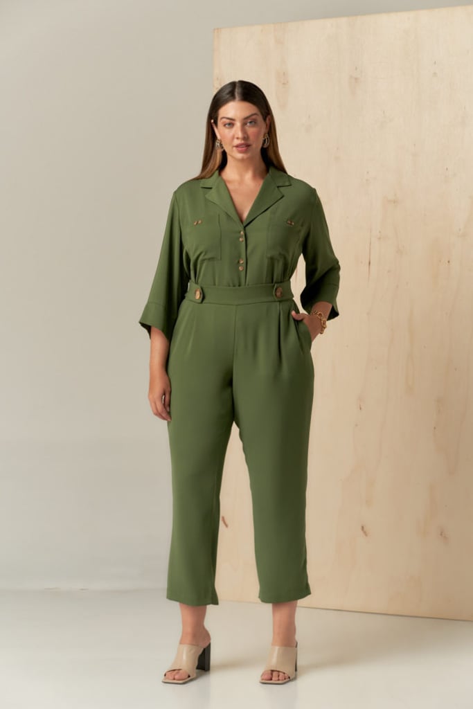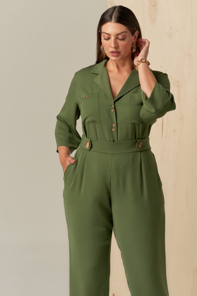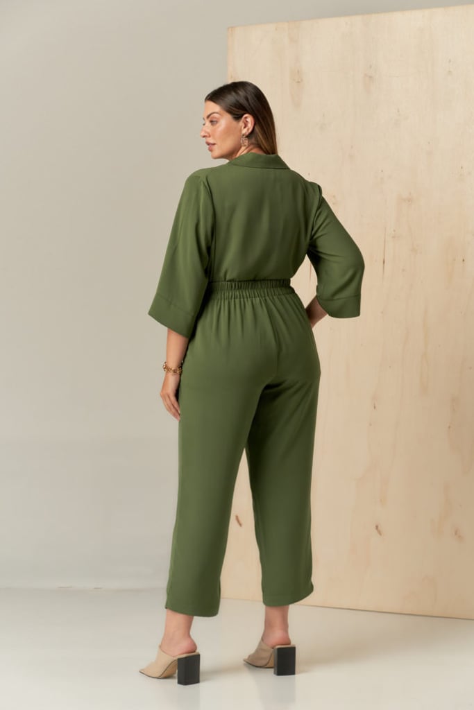 Conjunto de camisa e calça confeccionado em crepe encorpado. Camisa possui gola de blazer fechada por botões, bolsos frontais e manga ampla 3/4. Calça traz a nossa modelagem reta clássica com pregas, bolsos laterais e cós com elástico nas costas para maior conforto. Detalhe de botões decorativos que traz charme à peça.