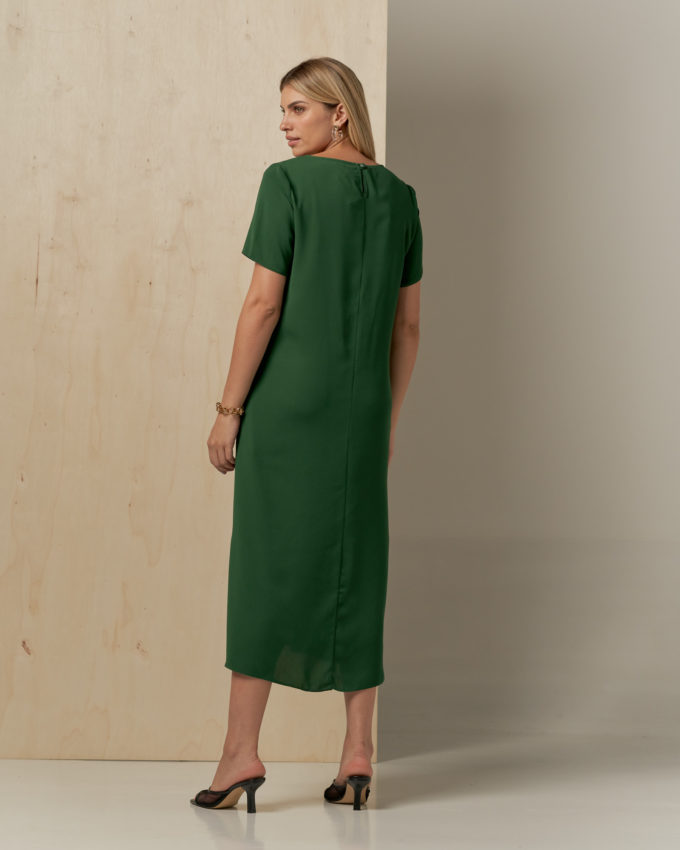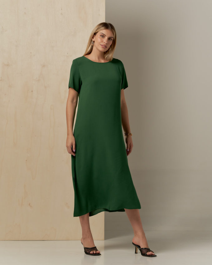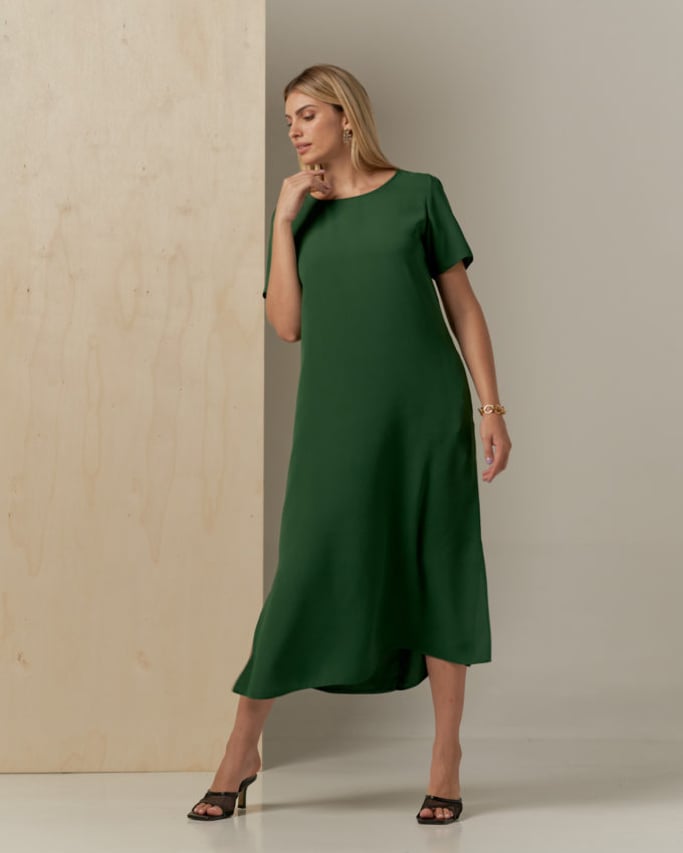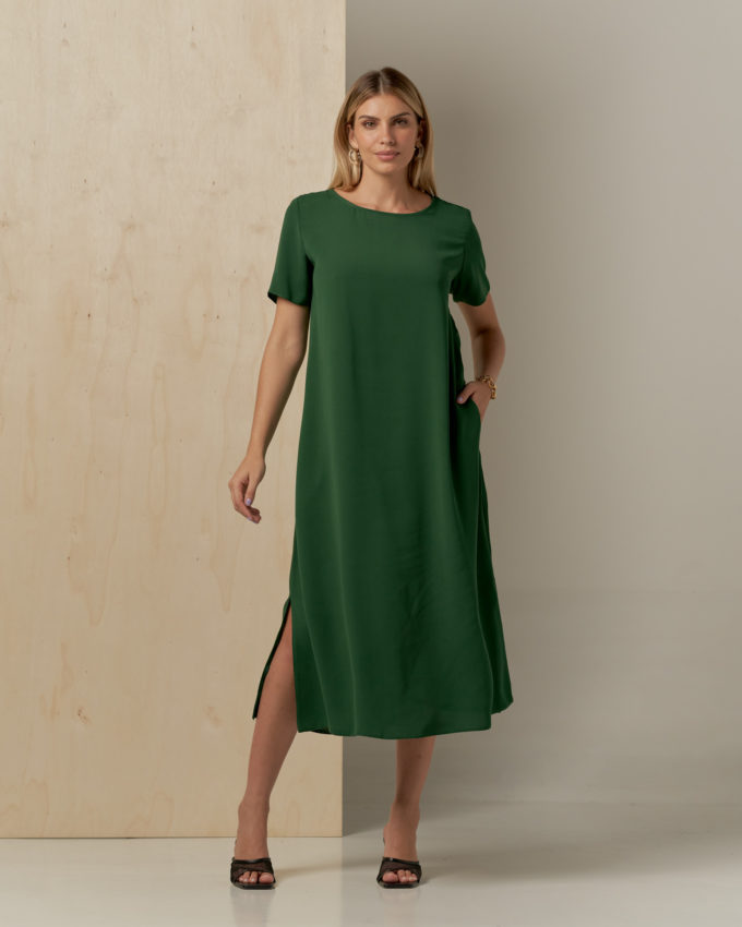 Vestido estilo T-shirt confeccionado em crepe encorpado. Possui modelagem solta ao corpo, decote arredondado, manga curta, bolsos e fendas laterais no comprimento midi. Fechamento por botão nas costas.
