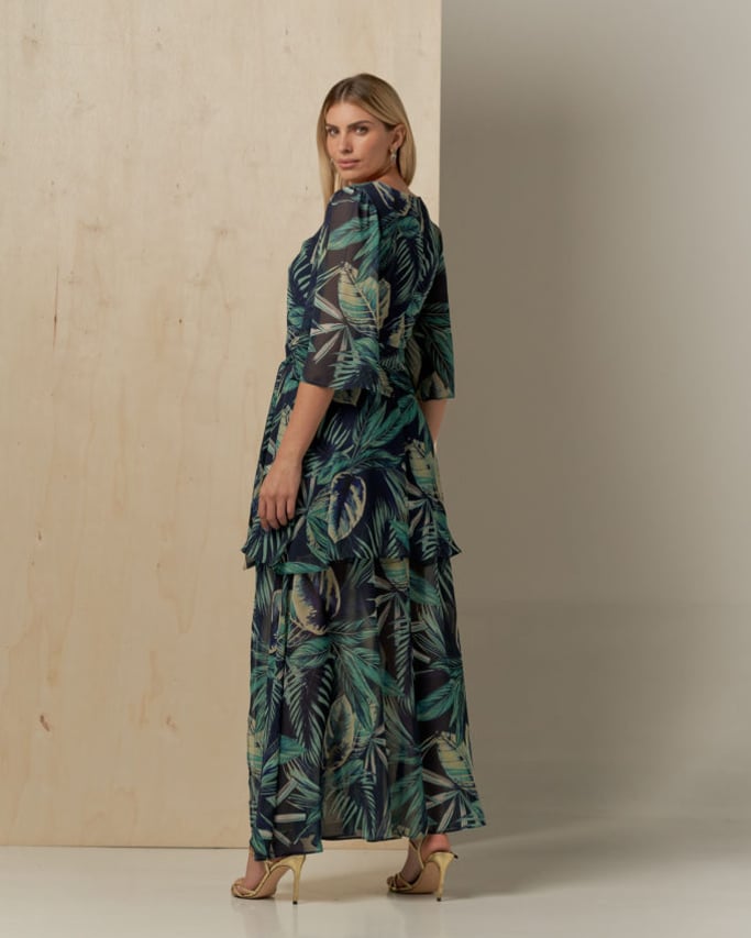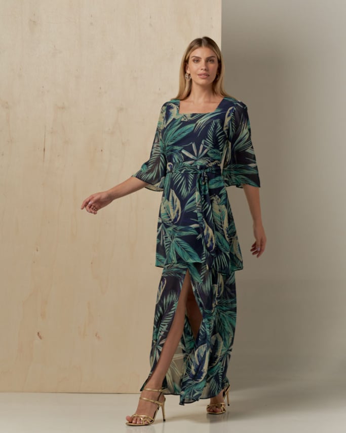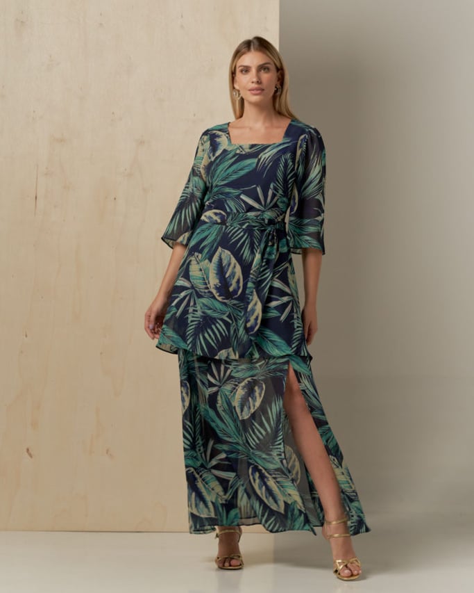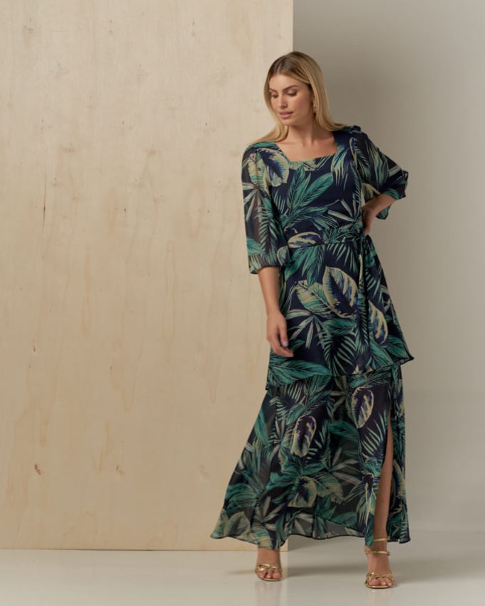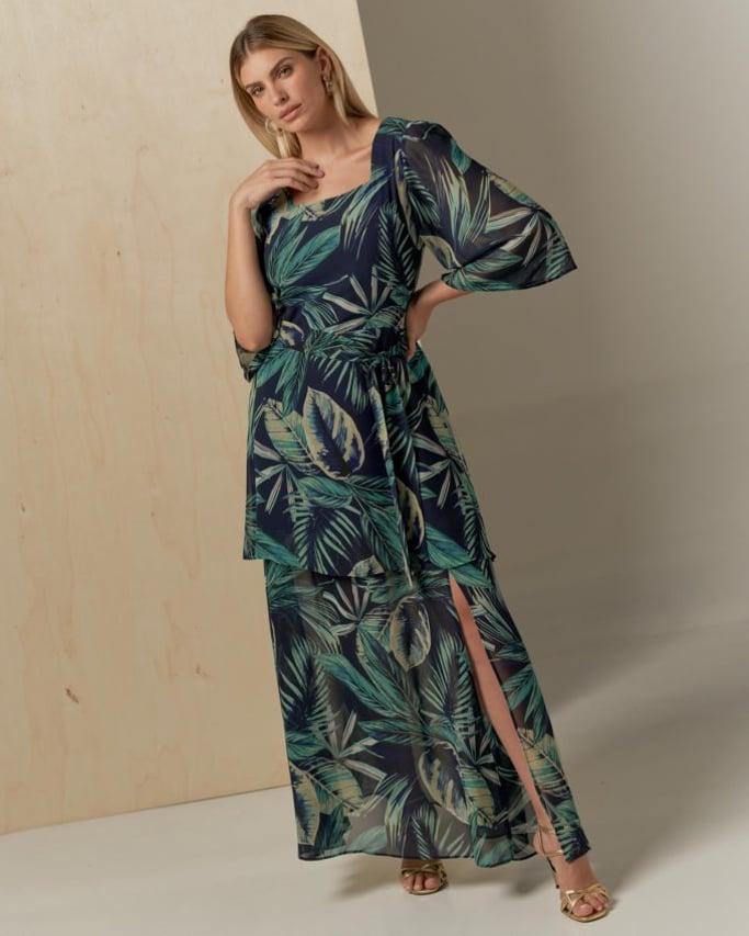 Vestido longo de chiffon com estampa de folhagem. Possui decote quadrado, manga 3/4 tipo sino, saias sobrepostas e fenda frontal com fechamento por zíper nas costas. Peça forrada. Acompanha faixa do mesmo tecido para amarração.