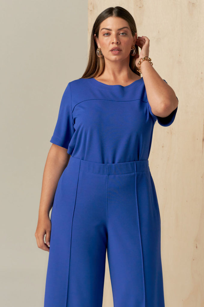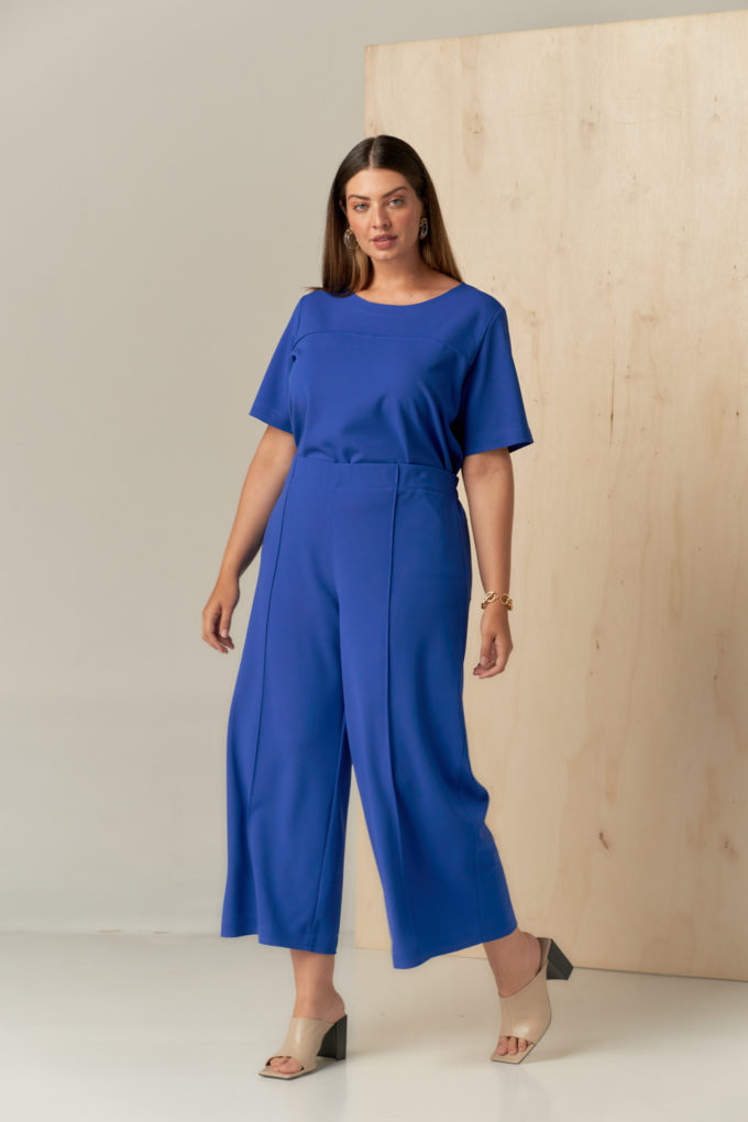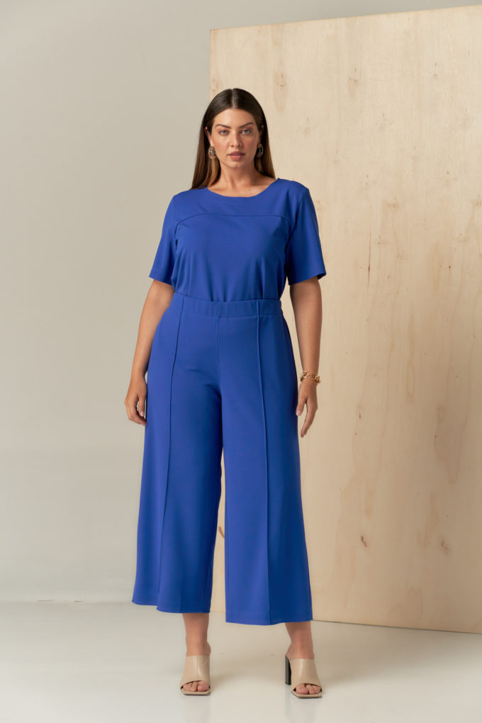 Conjunto confeccionado em malha de crepe scuba. Blusa com decote redondo e manga curta e calça estilo pantacourt com elástico em todo o cós seguindo o estilo comfy chic. Possui detalhe de nervura e acabamento em corte a fio que traz charme e modernidade à peça.