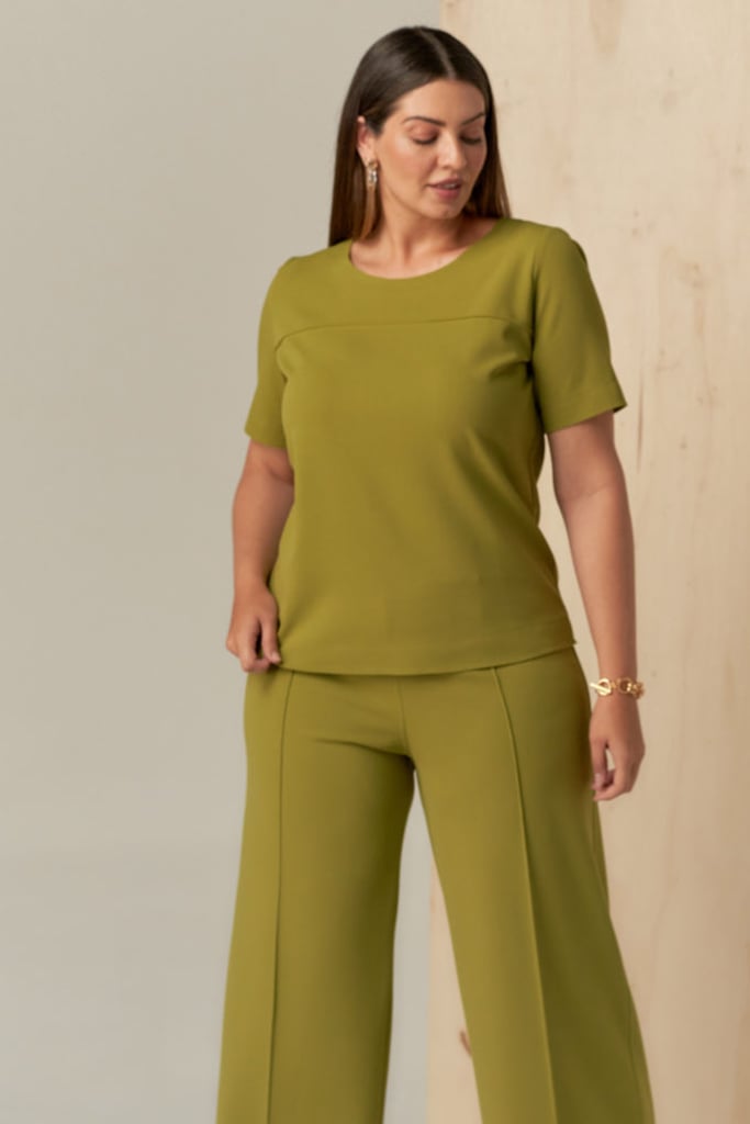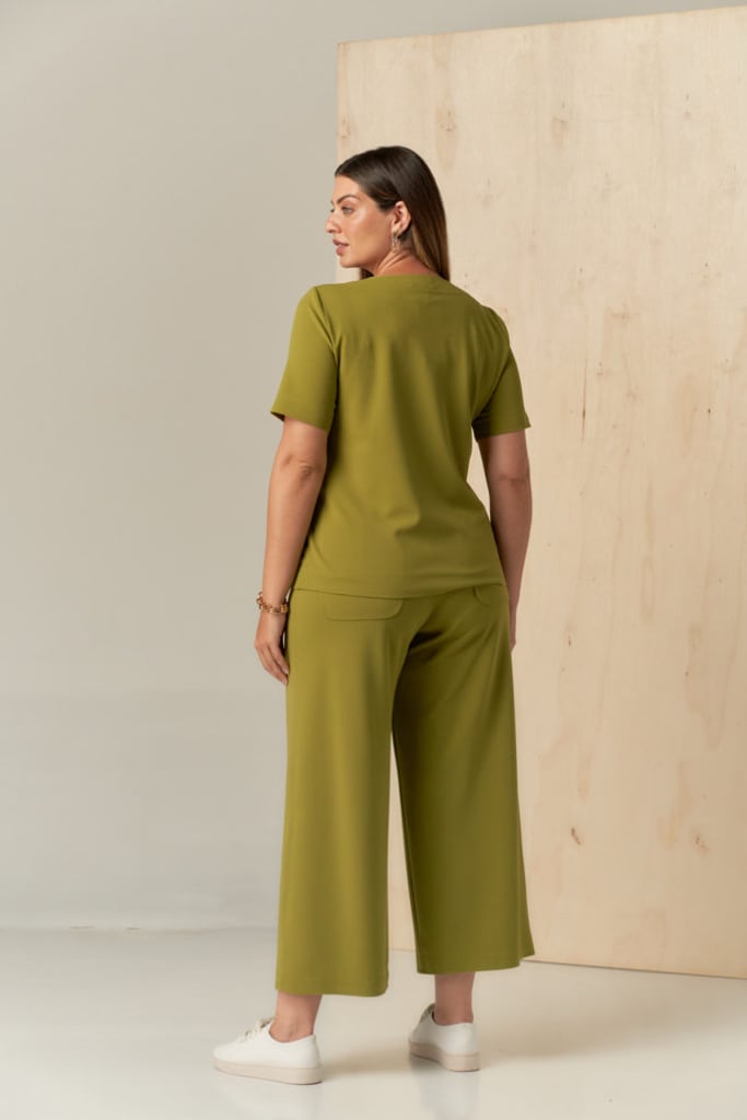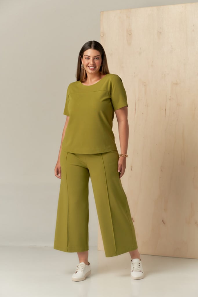 Conjunto confeccionado em malha de crepe scuba. Blusa com decote redondo e manga curta e calça estilo pantacourt com elástico em todo o cós seguindo o estilo comfy chic. Possui detalhe de nervura e acabamento em corte a fio que traz charme e modernidade à peça.