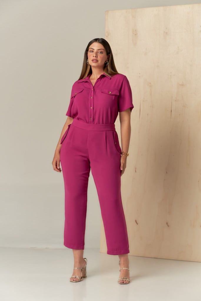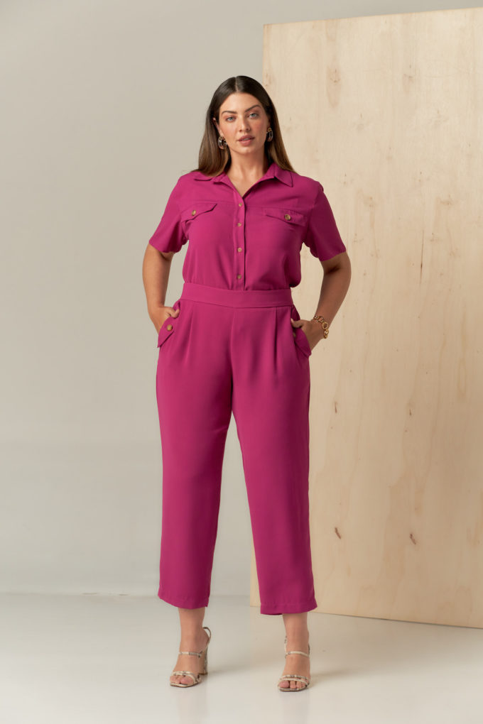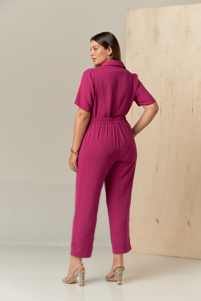 Conjunto confeccionado em crepe encorpado. Camisa possui gola, vista com botões, manga curta e detalhe de pala com botão. Calça reta estilo alfaiataria com pregas, bolsos com pala e botão e cós com elástico nas costas para maior conforto.