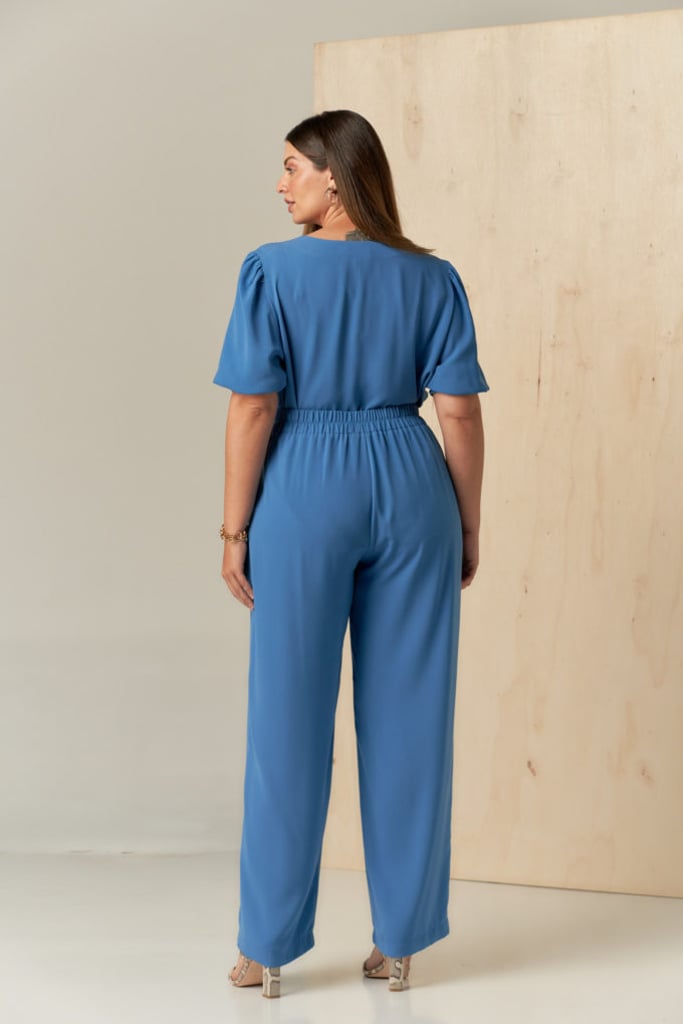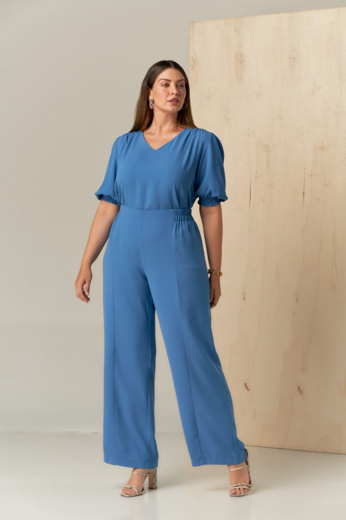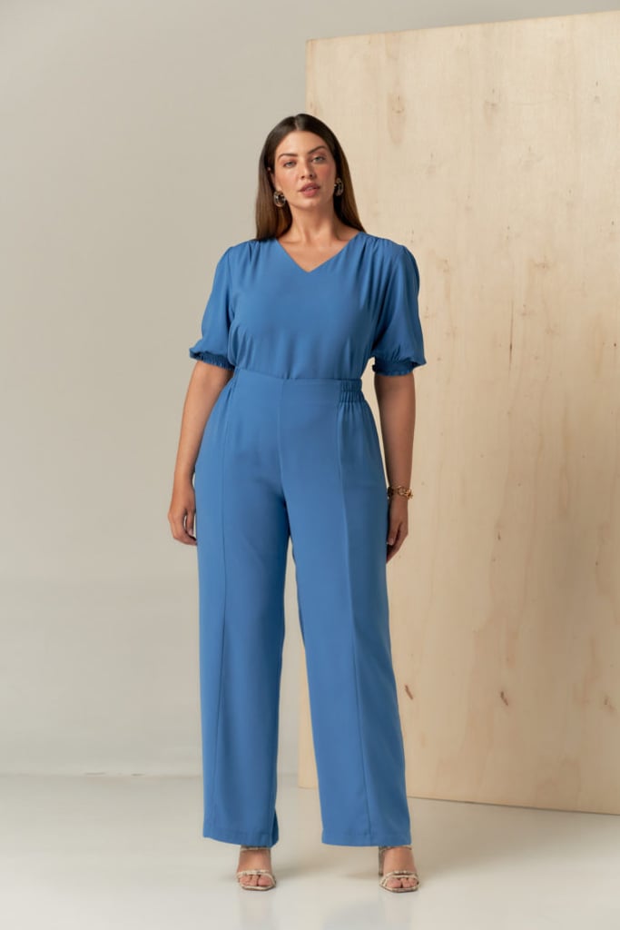 Conjunto de blusa e calça confeccionado no crepe. Blusa possui decote V, detalhe de franzido no ombro e manga 3/4 com lastex. Calça com detalhe de elástico no cós que traz conforto e charme à peça.