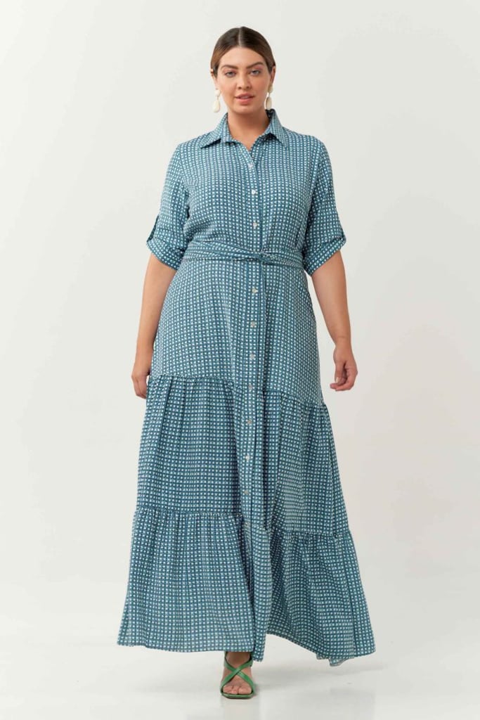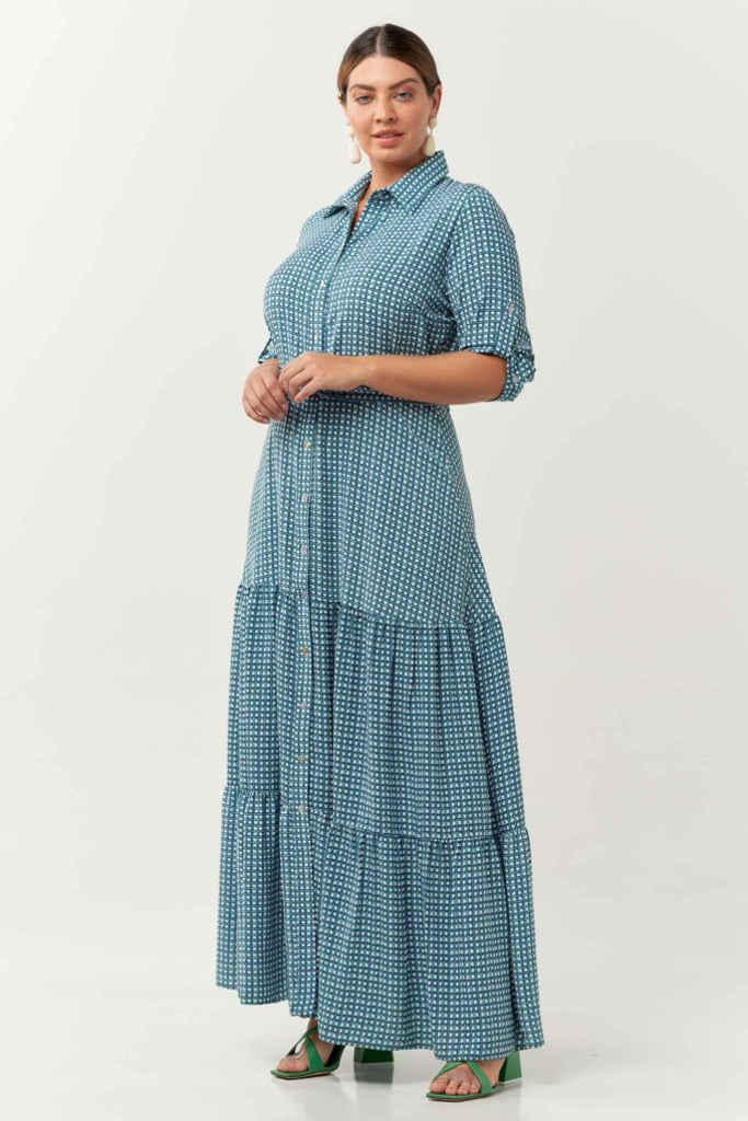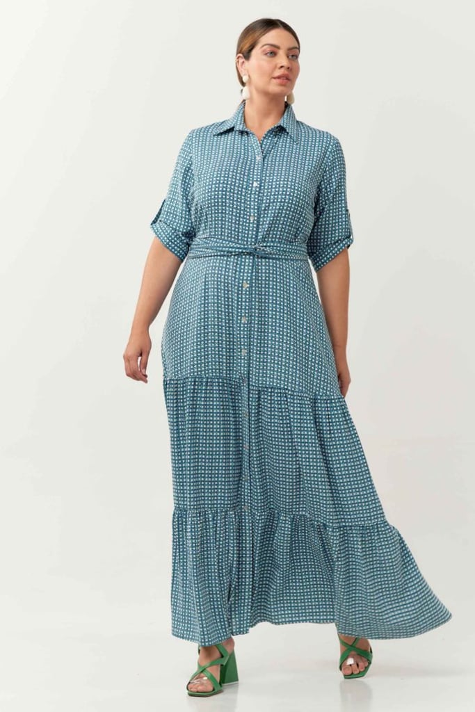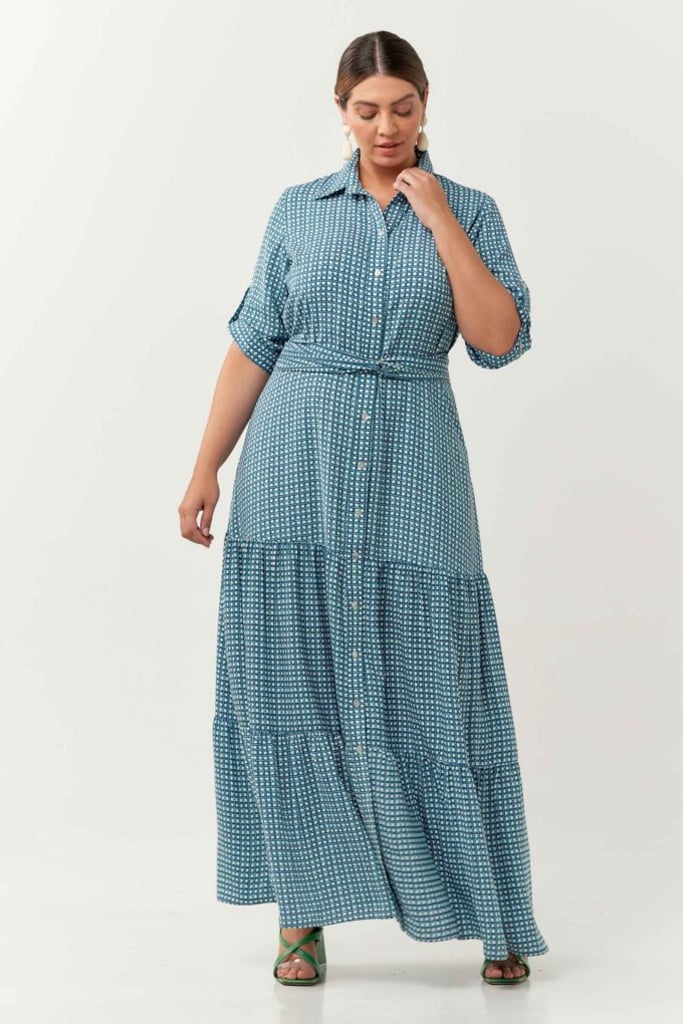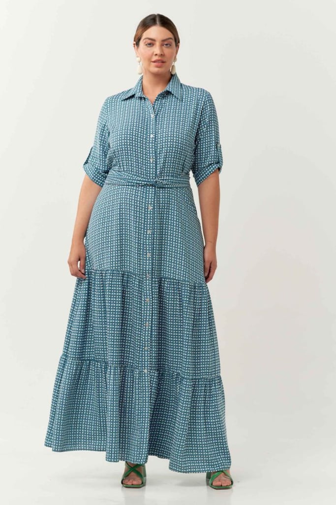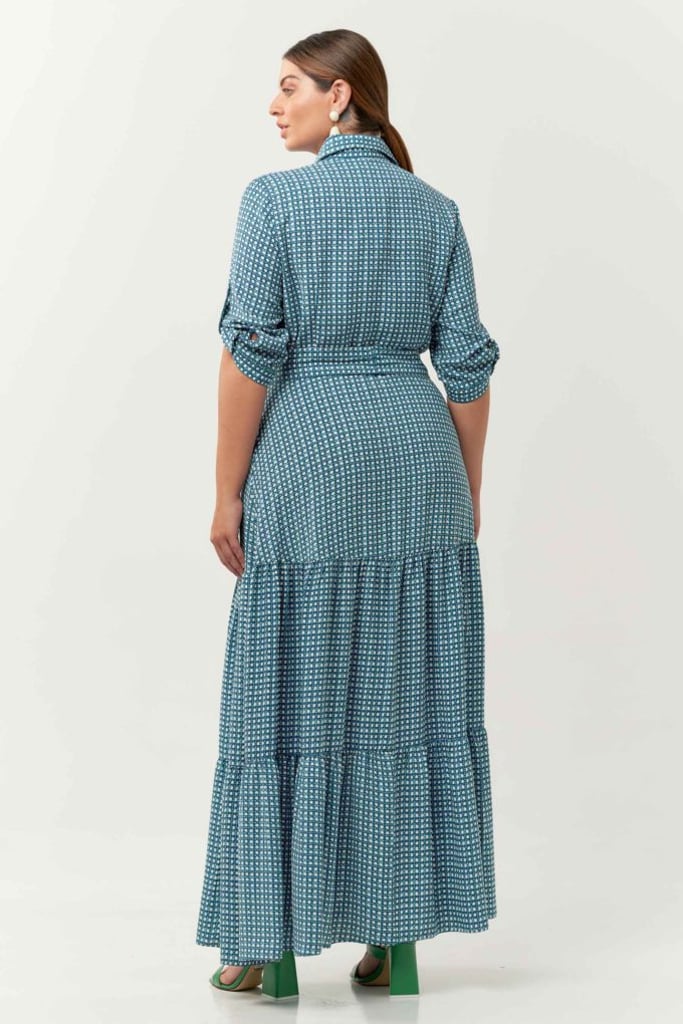 Vestido camisa em camadas confeccionado em tecido de crepe estampado. Possui modelagem fluida, gola de camisa, vista com botões, manga 3/4 com punho e martingale. Acompanha faixa para amarração. Peça super charmosa com a cara do verão, perfeita para qualquer ocasião.