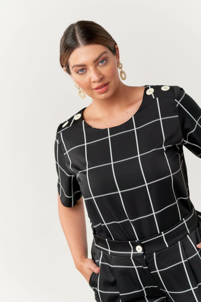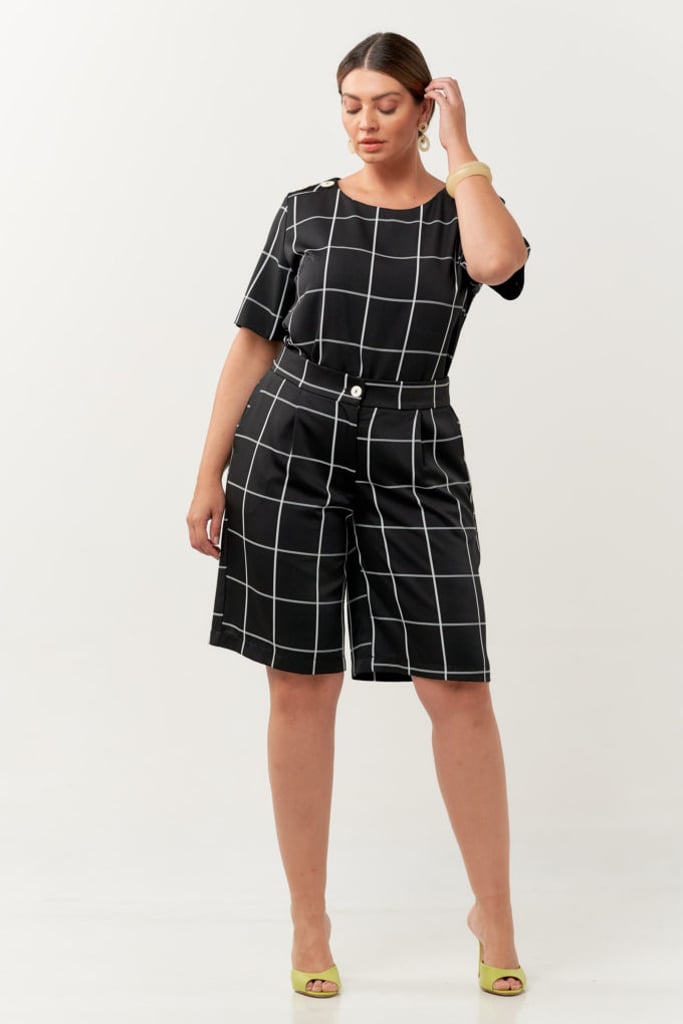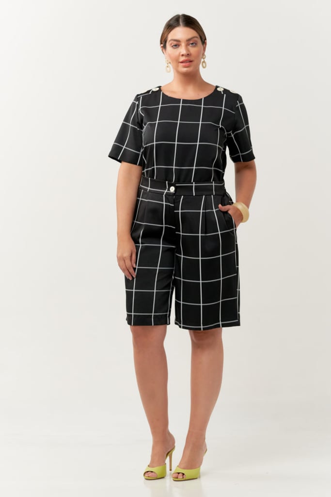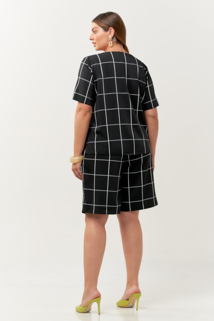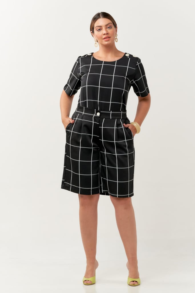 Conjunto confeccionado em tecido de crepe com estampa xadrez. Blusa possui decote redondo, manga curta e detalhe de botões decorativos no ombro. Bermuda traz nossa modelagem reta clássica, com pregas, bolsos laterais, cós com elástico nas costas para maior conforto e fechamento frontal por botão e zíper.