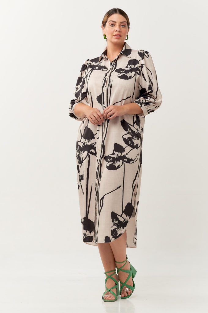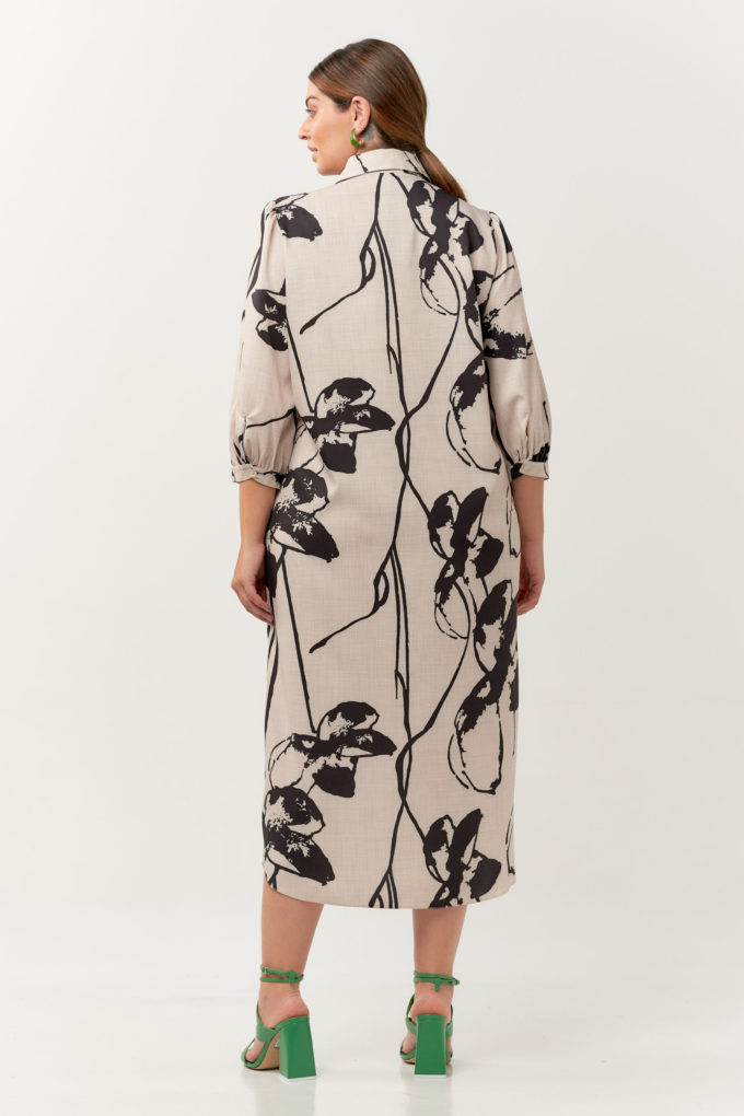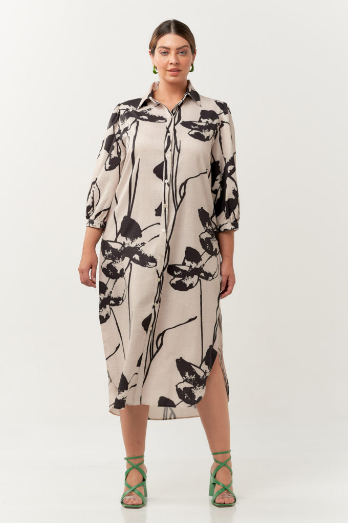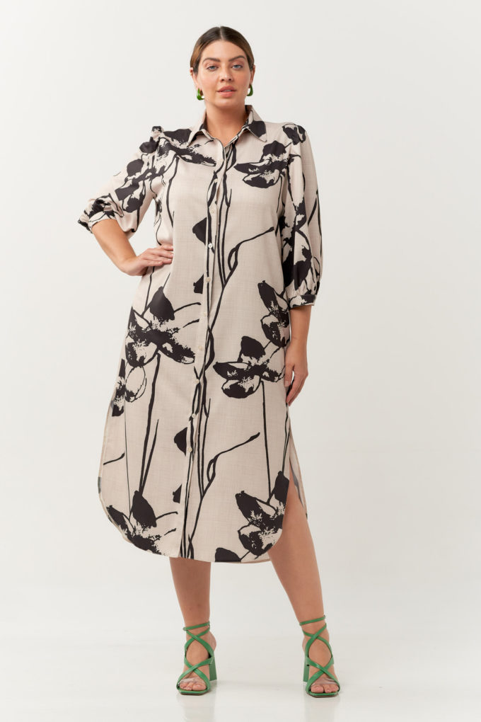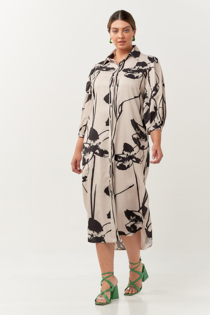 Vestido camisa confeccionado em tecido de crepe com estamparia exclusiva. Possui modelagem reta, gola de camisa, vista com botões, manga bufante 3/4 com punho e barra arredondada com leve abertura lateral. Peça clássica e elegante!