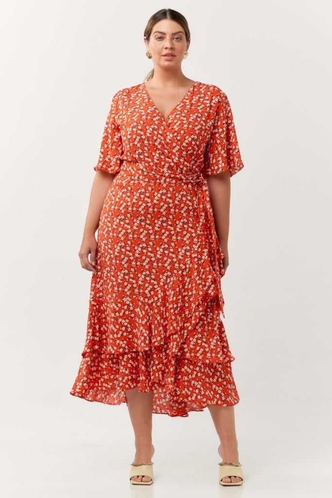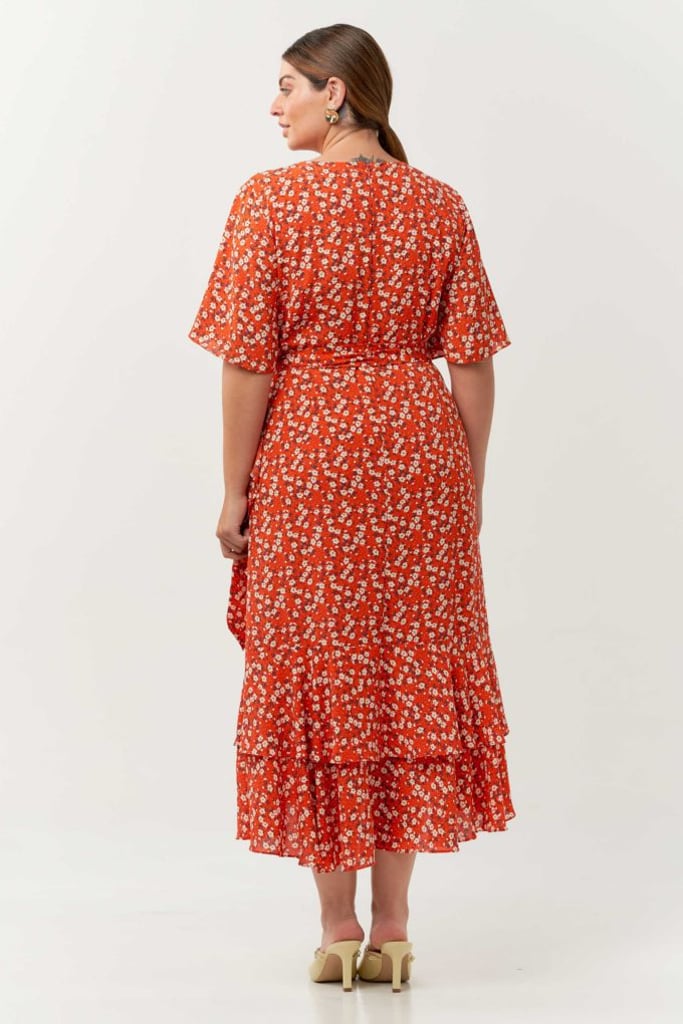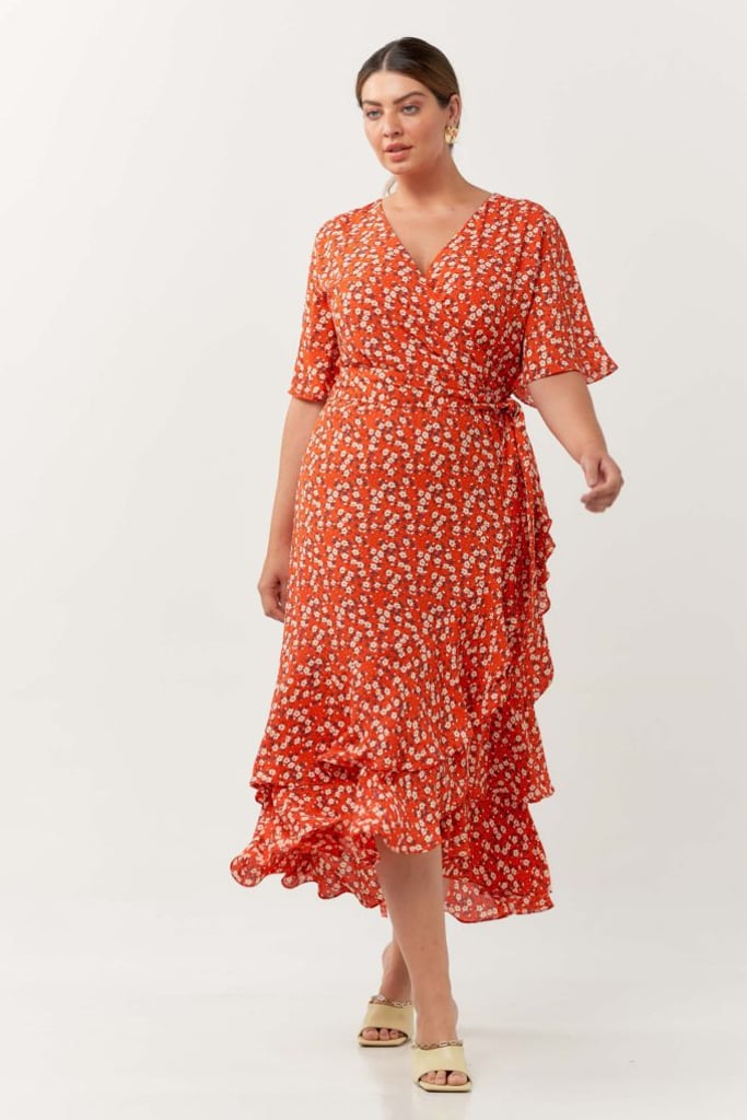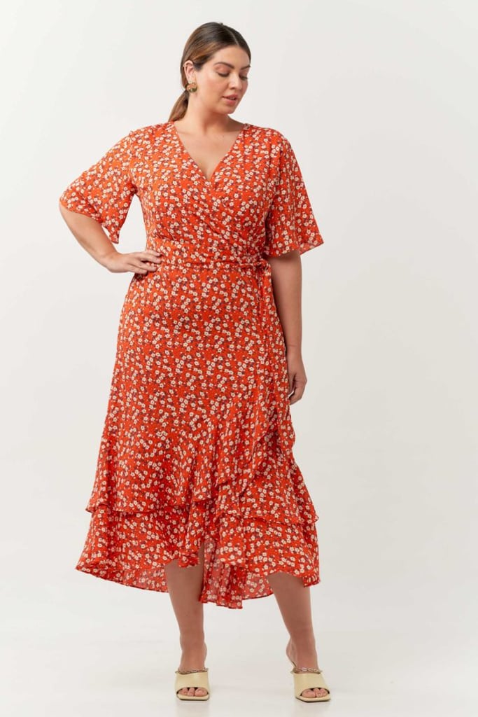 Vestido confeccionado em tecido de crepe com estampa floral. Possui decote transpassado, manga 3/4 tipo sino, detalhe de babado duplo em toda saia e faixas costuradas na peça para amarração. Possui forro. Vestido perfeito para o verão!